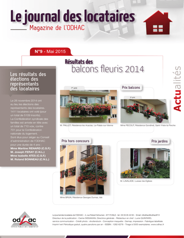 Le journal des locataires Magazine de l’ODHAC N°9 - Mai 2015 Résultats des 1er prix Actualités Les résultats des élections des représentants des locataires balcons fleuris 2014 Prix balcons 2e prix Le 26 novembre 2014 ont eu lieu les élections des représentants des locataires. 1411 locataires ont voté (pour un total de 5109 inscrits). La Confédération syndicale des familles est arrivée en tête avec un total de 710 voix, contre 701 pour la Confédération nationale du logement. Sont élus pour siéger au Conseil d’administration de l’ODHAC pour une durée de 4 ans : Mme Martine RENARD (C.S.F.) M. Joseph FERAY (C.N.L.) Mme lsabelle ATES (C.S.F.) M. Roland BONNEAU (C.N.L.) M. PAILLET, Résidence les Acacias, Le-Palais-sur-Vienne Mme PECOUT, Résidence Gondinet, Saint-Yrieix-la-Perche Prix hors concours Prix jardins M. LAVALADE, Lussac-les-Eglises Mme BRUN, Résidence Georges Dumas, Isle Le journal des locataires de l’ODHAC - 4, rue Robert Schuman - 87170 ISLE - tel : 05 55 05 42 00 - Email : [email protected] Directeur de la publication : Carine SISSAKIAN, Directrice générale - Rédacteur en chef : Lucie QUINTARD, service communication - Crédit photo : shutterstock - Conception maquette : Gemap, impression : Fabrègue labellisée Imprim’vert Périodique gratuit, quatre parutions par an - ISSBN : 1282-6278 - Tirage à 5500 exemplaires. www.odhac.fr Les nouveautés 2015 Détecteurs de fumée Les nouvelles dispositions légales imposent la mise en place de détecteurs de fumée dans tous les logements. Afin que vous puissiez mettre en œuvre cette obligation, un agent de l’ODHAC se présentera à votre domicile pour vous fournir, contre émargement d’un récépissé, un détecteur automatique de fumée conforme à la réglementation en vigueur. A cette occasion, il pourra, si vous le souhaitez, procéder à l’installation de ce matériel. Si vous êtes absent lors de la visite des agents de l’ODHAC, un avis de passage vous sera laissé afin que vous puissiez venir chercher votre détecteur directement à l’ODHAC. Nouvelles tarifications locatives Le Conseil de concertation locative a signé le nouveau protocole « tarifications locatives suite à état des lieux ». Ce document est consultable sur le site internet de l’ODHAC dans la rubrique « Documents à télécharger ». Les quelques exemples listés ci-dessous reprennent les facturations les plus fréquentes à la suite de l’état des lieux. L’ODHAC vous rappelle qu’en tant que locataire, vous êtes responsable de l’entretien de votre logement. En voici quelques exemples : Enlèvement de l’abattant des WC 30 € Détartrage des WC 40 € Rebouchage trou sur menuiserie PVC Rebouchage trou sur mur 7 € l’unité 11 € l’unité Douille manquante 5 € l’unité Fixation prises ou interrupteurs 8 € l’unité Nettoyage des interrupteurs – prises de courant – goulottes Nettoyage sol par pièce Nettoyage vitrage fenêtre Nettoyage bouche de VMC Lessivage peinture (portes, tuyaux, plinthes) Enlèvement encombrant 15 € par pièce 4 € le m² 14 € l’unité 10 € 5 € le m² 100 € par m3 Contrats d’entretien Le nouveau protocole d’accord « contrats d’entretien », également consultable et téléchargeable sur le site internet de l’ODHAC dans la rubrique « Documents à télécharger », a été élaboré en accord avec le Conseil de concertation locative. Les aménagements dans votre logement Les locataires ont souvent le souhait d’apporter quelques modifications dans leur logement, par confort ou pour la décoration. Néanmoins, si certains aménagements sont autorisés, d’autres nécessitent une demande précise et un accord préalable des services de l’ODHAC et d’autres encore sont strictement interdits. Pour y voir un peu plus clair, voici un récapitulatif des aménagements qui sont, ou non, autorisés dans votre logement. Au moindre doute demandez conseil à l’inspecteur d’immeubles de votre secteur. Aménagements dans les espaces extérieurs privatifs Aménagements dans les logements Aménagements autorisés Changer les tapisseries Conseil : décoller avec précaution les anciennes tapisseries sans abîmer le support et bien reboucher les trous qui pourraient se trouver dans les murs.. Remplacer une moquette ou un revêtement PVC, fixer avec un ruban double face spécial. Rebouchage des trous au plâtre ou à l’enduit. Pose de tableaux et décors sur crochets X. Remplacement des flexibles de douche. Pose d’étagères sur chevilles spéciales placo ou sur carreaux de plâtre 8 mm maxi. Remplacement à l’identique des douilles, prises et interrupteurs (réparation locative). Aménagements soumis à autorisation Installation d’une cuisine intégrée avec remise en état et sans modification des installations électriques et gaz dans les règles de l’art et sous votre responsabilité. Percement de la porte d’entrée (verrous, judas ou serrure trois points). Modification des revêtements de sols (pose de carrelage, cas particulier à voir sur place avec Inspecteur d’immeubles du secteur). Repeindre murs et plafonds Conseil : enlever les meubles et protéger les sols Aménagements autorisés Plantations Les arbustes : Rosier – Forsythia -Fruitier nain Lilas – Hortensia -Rhododendron - Azalée-Bruyère – Gynérium - Althéa - Groseiller à fleurs -Deutzia - Kerria Japonica - Spirée Van Houttei Spirée A. Waterer - Weigelia - Genet Hybride - Berbéris sténophylla-atropurpuréa Eléagnus maculata auréa Mahonia aquifolium - Seringat – Potentille - Charmille- Junipérus rampant Cotonéaster rampant Transformation d’une partie des espaces verts en potager (avec une distance minimale de 1m 50 de la façade) Aménagements soumis à autorisation Etendoirs à linge, seuls sont autorisés des fils à linge uniquement avec des poteaux métalliques de couleur verte. Aménagement d’une rocaille ou d’un bassin. Agrandissement de la terrasse
