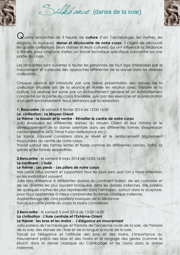 Silkdance (danse de la soie) Quatre rencontres de 3 heures de culture (l’art, l’archéologie, les mythes, les religions, la musique), danse et découverte de notre corps. Il s'agira de découvrir les quatre civilisations (leurs danses et leurs cultures) qui ont influencé la Silkdance à travers, pour chacune d'elles, un travail technique spécifique concentré sur une partie du corps. Les rencontres sont ouvertes à toutes les personnes de tout âge intéressées par le mouvement et curieuses des approches différentes de la danse dans les diverses civilisations. Chaque séance est introduite par une brève présentation des danses de la civilisation étudiée lors de la séance et traitée en relation avec l'histoire et la culture. La séance est suivie par un échauffement général et un échauffement concentré sur la partie du corps travaillée, suivi par des exercices et la préparation d'un petit enchaînement. Nous terminons par la relaxation. 1. Rencontre : le samedi 8 février 2014 de 13:00-16:00 La civilisation : Le Moyen-Orient Le thème : le bassin et le ventre - Réveiller le centre de notre corps Julia évoquera les différentes danses du Moyen Orient et leur histoire et le développement de la danse orientale dans ses différentes formes d'expression contemporaine (ATS, Tribal Fusion bellydance etc.). Le travail corporel consistera dans le réveil et le renforcement (également musculaire) du centre de notre corps. Travail surtout des formes lentes et fluide comme les différentes cercles, l'infini, la spirale et les formes serpentines. 2.Rencontre : le samedi 8 mars 2014 de 13:00-16:00 Le continent : L'Inde Le thème : Les pieds – Les piliers de notre corps Nos pieds nous portent et supportent tous les jours sans que l'on y fasse attention, en les maltraitant souvent. Julia fera référence à différentes danses du continent indien, de ses costumes et de ses divinités les plus souvent invoquées dans les danses indiennes. Elle parlera de quelques mythes les plus représentés dans l'art indien, surtout dans la sculpture, pour nous apprendre à mieux comprendre la danse classique indienne. Apprentissage des cinq positions basiques de la Silkdance. Travail sur cette partie du corps la moins considérée. 3.Rencontre : le samedi 5 avril 2014 de 13:00-16:00 La civilisation : L'Asie centrale et l'Extrême-Orient Le thème : les bras et les mains - L’élégance en mouvement Julia parlera de l'archéologie et l'histoire de l'ancienne route de la soie, de l'histoire de la soie, des danses de l'Asie et de la longue la route de la soie. Travail sur l'élégance et l'attitude des bras et des mains. L'importance du mouvement précis des bras et des mains et le langage des gestes (comme le kbach dans la danse classique du Cambodge et les hasta dans la danse indienne). 4.Rencontre : le samedi 24 mai 2014 de 13:00-16:00 Le continent : L'Europe Le thème : Les courbes et les lignes – Faire vivre l’espace Julia évoquera les personnalités les plus importantes de la danse expressive (Ausdruckstanz) développée en Allemagne, en Autriche et en Suisse au début XXe siècle. Travail sur les mouvements acquis lors des trois rencontres précédentes et sur l'utilisation de l'espace et du corps dans cet espace. La Silkdance envisage en effet la danse comme une peinture tridimensionnelle. Les rencontres s’achèveront par une petite présentation des enchaînements appris. Penser à porter : une tenue pratique qui ne limite pas le mouvement (pantalons souples de préférence pour mieux vous corriger, des bodies ou T-shirts pas trop larges, pieds nus ou avec des chaussettes non glissantes (stop en dessous). Selon Julia, chaque civilisation évoque une couleur prédominante et c'est pourquoi elle souhaiterait que chaque participant apporte pour chaque rencontre au moins un vêtement de la couleur que cette civilisation étudiée peut vous inspirer. Prix : chaque rencontre coûte 40€, pour la totalité des rencontres : 140 € Nombre minimum de participantes : 4 Pour inscriptions et réservations jusqu'à 3 jours avant la date du stage envoyer un mail à : [email protected] ou téléphoner au 06 51 20 10 68 Présence requise sur le lieu 15 minutes avant le commencement des rencontres. Adresse : La Maison des musiques & arts interculturels 27, rue de Chabrol 75010 Paris Métro: Gare de l'Est : lignes 4,5,7- Sortie 8 Poissonnière : ligne 7- Sortie rue de Chabrol