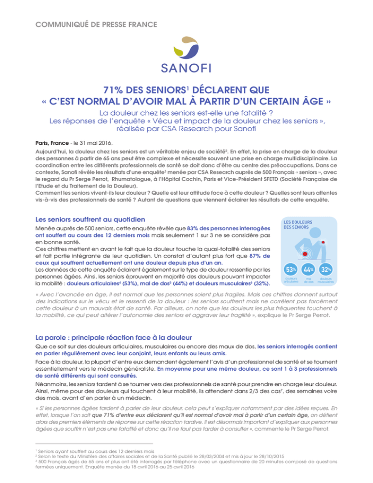 COMMUNIQUÉ DE PRESSE FRANCE 71% DES SENIORS1 DÉCLARENT QUE « C’EST NORMAL D’AVOIR MAL À PARTIR D’UN CERTAIN ÂGE » La douleur chez les seniors est-elle une fatalité ? Les réponses de l’enquête « Vécu et impact de la douleur chez les seniors », réalisée par CSA Research pour Sanofi Paris, France - le 31 mai 2016, Aujourd’hui, la douleur chez les seniors est un véritable enjeu de société2. En effet, la prise en charge de la douleur des personnes à partir de 65 ans peut être complexe et nécessite souvent une prise en charge multidisciplinaire. La coordination entre les différents professionnels de santé se doit donc d’être au centre des préoccupations. Dans ce contexte, Sanofi révèle les résultats d’une enquête3 menée par CSA Research auprès de 500 Français « seniors », avec le regard du Pr Serge Perrot, Rhumatologue, à l’Hôpital Cochin, Paris et Vice-Président SFETD (Société Française de l’Etude et du Traitement de la Douleur). Comment les seniors vivent-ils leur douleur ? Quelle est leur attitude face à cette douleur ? Quelles sont leurs attentes vis-à-vis des professionnels de santé ? Autant de questions que viennent éclairer les résultats de cette enquête. Les seniors souffrent au quotidien Menée auprès de 500 seniors, cette enquête révèle que 83% des personnes interrogées ont souffert au cours des 12 derniers mois mais seulement 1 sur 3 ne se considère pas en bonne santé. Ces chiffres mettent en avant le fait que la douleur touche la quasi-totalité des seniors et fait partie intégrante de leur quotidien. Un constat d’autant plus fort que 87% de ceux qui souffrent actuellement ont une douleur depuis plus d’un an. Les données de cette enquête éclairent également sur le type de douleur ressentie par les personnes âgées. Ainsi, les seniors éprouvent en majorité des douleurs pouvant impacter la mobilité : douleurs articulaires4 (53%), mal de dos5 (44%) et douleurs musculaires6 (32%). LES DOULEURS DES SENIORS 53% 44% 32% douleurs articulaires mal de dos douleurs musculaires « Avec l’avancée en âge, il est normal que les personnes soient plus fragiles. Mais ces chiffres donnent surtout des indications sur le vécu et le ressenti de la douleur : les seniors souffrent mais ne corrèlent pas forcément cette douleur à un mauvais état de santé. Par ailleurs, on note que les douleurs les plus fréquentes touchent à la mobilité, ce qui peut altérer l’autonomie des seniors et aggraver leur fragilité », explique le Pr Serge Perrot. La parole : principale réaction face à la douleur Que ce soit sur des douleurs articulaires, musculaires ou encore des maux de dos, les seniors interrogés confient en parler régulièrement avec leur conjoint, leurs enfants ou leurs amis. Face à la douleur, la plupart d’entre eux demandent également l’avis d’un professionnel de santé et se tournent essentiellement vers le médecin généraliste. En moyenne pour une même douleur, ce sont 1 à 3 professionnels de santé différents qui sont consultés. Néanmoins, les seniors tardent à se tourner vers des professionnels de santé pour prendre en charge leur douleur. Ainsi, même pour des douleurs qui touchent à leur mobilité, ils attendent dans 2/3 des cas7, des semaines voire des mois, avant d’en parler à un médecin. « Si les personnes âgées tardent à parler de leur douleur, cela peut s’expliquer notamment par des idées reçues. En effet, lorsque l’on sait que 71% d’entre eux déclarent qu’il est normal d’avoir mal à partir d’un certain âge, on détient alors des premiers éléments de réponse sur cette réaction tardive. Il est désormais important d’expliquer aux personnes âgées que souffrir n’est pas une fatalité et donc qu’il ne faut pas tarder à consulter », commente le Pr Serge Perrot. Seniors ayant souffert au cours des 12 derniers mois Selon le texte du Ministère des affaires sociales et de la Santé publié le 28/03/2004 et mis à jour le 28/10/2015 3 500 Français âgés de 65 ans et plus ont été interrogés par téléphone avec un questionnaire de 20 minutes composé de questions fermées uniquement. Enquête menée du 18 avril 2016 au 25 avril 2016 1 2 Des attentes marquées pour la prise en charge de la douleur Globalement, pour l’ensemble des types de douleur ressentie, les seniors interrogés ont le sentiment d’être écoutés et bien pris en charge. Malgré tout, l’enquête a révélé des attentes très fortes vis-à-vis du corps médical puisque 76% des seniors8 souhaitent davantage d’explications données par les professionnels de santé et 82% souhaitent avoir une idée claire du rôle de chacun pour la prise en charge de la douleur. De plus, 79% d’entre eux attendent une meilleure coordination des professionnels de santé pour prendre en charge la douleur. En effet, dans environ la moitié des cas, les seniors déclarent qu’il n’y a pas eu d’échanges entre les différents professionnels de santé consultés et moins de la moitié déclarent avoir bénéficié d’une visite de suivi de leur douleur après la première consultation. 79% attendent une meilleure coordination des professionnels de santé « Cette enquête montre toute l’importance de la communication, aussi bien entre le patient et les médecins ainsi que les différents professionnels de santé entre eux. Les patients âgés ont besoin d’écoute et de possibilités de s’exprimer, mais aussi d’une bonne coordination entre les différents intervenants du système de soins », analyse le Pr Serge Perrot. Ainsi, et plus que jamais, la coordination et l’échange entre les différents professionnels de santé est primordiale pour faciliter la prise en charge de la douleur des seniors. C’est pourquoi Sanofi a lancé récemment le Forum Sanofi Antalgie réunissant une centaine de professionnels de santé et associations de patients pour une journée de débats, d’é