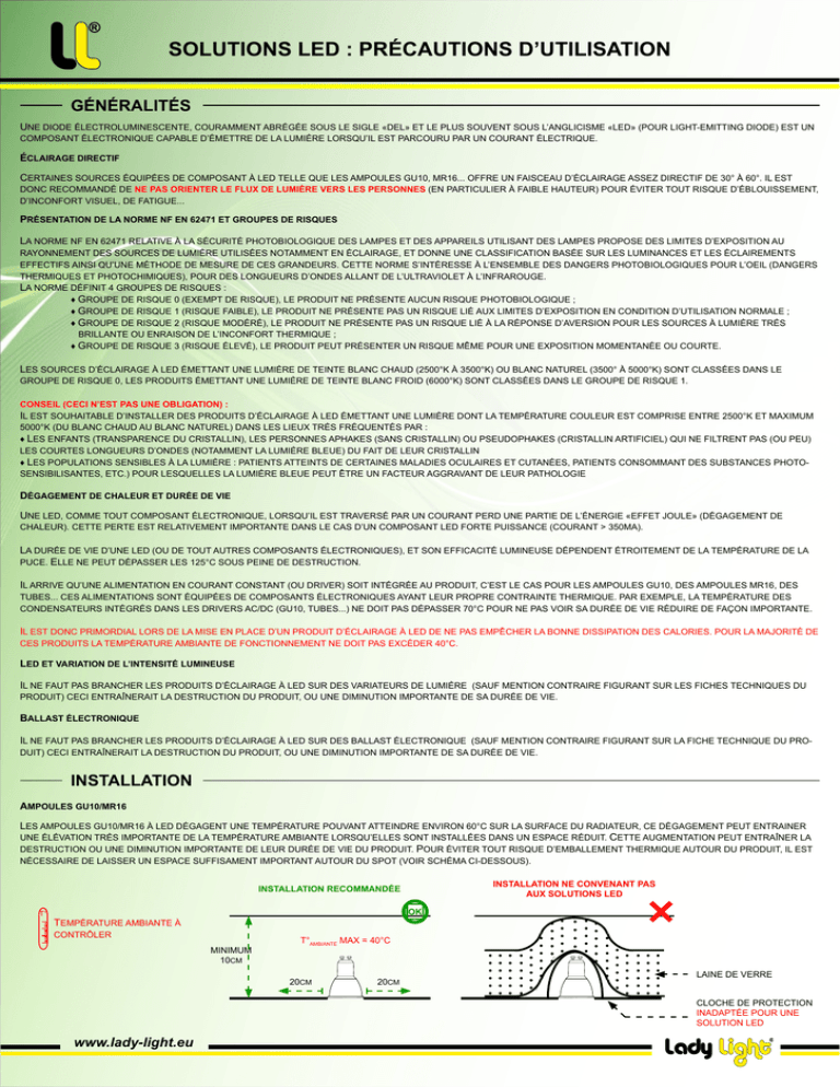 SOLUTIONS LED : PRÉCAUTIONS D’UTILISATION GÉNÉRALITÉS UNE DIODE ÉLECTROLUMINESCENTE, COURAMMENT ABRÉGÉE SOUS LE SIGLE «DEL» ET LE PLUS SOUVENT SOUS L’ANGLICISME «LED» (POUR LIGHT-EMITTING DIODE) EST UN COMPOSANT ÉLECTRONIQUE CAPABLE D’ÉMETTRE DE LA LUMIÈRE LORSQU’IL EST PARCOURU PAR UN COURANT ÉLECTRIQUE. ÉCLAIRAGE DIRECTIF CERTAINES SOURCES ÉQUIPÉES DE COMPOSANT À LED TELLE QUE LES AMPOULES GU10, MR16... OFFRE UN FAISCEAU D’ÉCLAIRAGE ASSEZ DIRECTIF DE 30° À 60°. IL EST DONC RECOMMANDÉ DE NE PAS ORIENTER LE FLUX DE LUMIÈRE VERS LES PERSONNES (EN PARTICULIER À FAIBLE HAUTEUR) POUR ÉVITER TOUT RISQUE D’ÉBLOUISSEMENT, D’INCONFORT VISUEL, DE FATIGUE... PRÉSENTATION DE LA NORME NF EN 62471 ET GROUPES DE RISQUES LA NORME NF EN 62471 RELATIVE À LA SÉCURITÉ PHOTOBIOLOGIQUE DES LAMPES ET DES APPAREILS UTILISANT DES LAMPES PROPOSE DES LIMITES D’EXPOSITION AU RAYONNEMENT DES SOURCES DE LUMIÈRE UTILISÉES NOTAMMENT EN ÉCLAIRAGE, ET DONNE UNE CLASSIFICATION BASÉE SUR LES LUMINANCES ET LES ÉCLAIREMENTS EFFECTIFS AINSI QU’UNE MÉTHODE DE MESURE DE CES GRANDEURS. CETTE NORME S’INTÉRESSE À L’ENSEMBLE DES DANGERS PHOTOBIOLOGIQUES POUR L’OEIL (DANGERS THERMIQUES ET PHOTOCHIMIQUES), POUR DES LONGUEURS D’ONDES ALLANT DE L’ULTRAVIOLET À L’INFRAROUGE. LA NORME DÉFINIT 4 GROUPES DE RISQUES : ♦ GROUPE DE RISQUE 0 (EXEMPT DE RISQUE), LE PRODUIT NE PRÉSENTE AUCUN RISQUE PHOTOBIOLOGIQUE ; ♦ GROUPE DE RISQUE 1 (RISQUE FAIBLE), LE PRODUIT NE PRÉSENTE PAS UN RISQUE LIÉ AUX LIMITES D’EXPOSITION EN CONDITION D’UTILISATION NORMALE ; ♦ GROUPE DE RISQUE 2 (RISQUE MODÉRÉ), LE PRODUIT NE PRÉSENTE PAS UN RISQUE LIÉ À LA RÉPONSE D’AVERSION POUR LES SOURCES À LUMIÈRE TRÈS BRILLANTE OU ENRAISON DE L’INCONFORT THERMIQUE ; ♦ GROUPE DE RISQUE 3 (RISQUE ÉLEVÉ), LE PRODUIT PEUT PRÉSENTER UN RISQUE MÊME POUR UNE EXPOSITION MOMENTANÉE OU COURTE. LES SOURCES D’ÉCLAIRAGE À LED ÉMETTANT UNE LUMIÈRE DE TEINTE BLANC CHAUD (2500°K À 3500°K) OU BLANC NATUREL (3500° À 5000°K) SONT CLASSÉES DANS LE GROUPE DE RISQUE 0, LES PRODUITS ÉMETTANT UNE LUMIÈRE DE TEINTE BLANC FROID (6000°K) SONT CLASSÉES DANS LE GROUPE DE RISQUE 1. CONSEIL (CECI N’EST PAS UNE OBLIGATION) : IL EST SOUHAITABLE D’INSTALLER DES PRODUITS D’ÉCLAIRAGE À LED ÉMETTANT UNE LUMIÈRE DONT LA TEMPÉRATURE COULEUR EST COMPRISE ENTRE 2500°K ET MAXIMUM 5000°K (DU BLANC CHAUD AU BLANC NATUREL) DANS LES LIEUX TRÈS FRÉQUENTÉS PAR : ♦ LES ENFANTS (TRANSPARENCE DU CRISTALLIN), LES PERSONNES APHAKES (SANS CRISTALLIN) OU PSEUDOPHAKES (CRISTALLIN ARTIFICIEL) QUI NE FILTRENT PAS (OU PEU) LES COURTES LONGUEURS D’ONDES (NOTAMMENT LA LUMIÈRE BLEUE) DU FAIT DE LEUR CRISTALLIN ♦ LES POPULATIONS SENSIBLES À LA LUMIÈRE : PATIENTS ATTEINTS DE CERTAINES MALADIES OCULAIRES ET CUTANÉES, PATIENTS CONSOMMANT DES SUBSTANCES PHOTOSENSIBILISANTES, ETC.) POUR LESQUELLES LA LUMIÈRE BLEUE PEUT ÊTRE UN FACTEUR AGGRAVANT DE LEUR PATHOLOGIE DÉGAGEMENT DE CHALEUR ET DURÉE DE VIE UNE LED, COMME TOUT COMPOSANT ÉLECTRONIQUE, LORSQU’IL EST TRAVERSÉ PAR UN COURANT PERD UNE PARTIE DE L’ÉNERGIE «EFFET JOULE» (DÉGAGEMENT DE CHALEUR). CETTE PERTE EST RELATIVEMENT IMPORTANTE DANS LE CAS D’UN COMPOSANT LED FORTE PUISSANCE (COURANT > 350MA). LA DURÉE DE VIE D’UNE LED (OU DE TOUT AUTRES COMPOSANTS ÉLECTRONIQUES), ET SON EFFICACITÉ LUMINEUSE DÉPENDENT ÉTROITEMENT DE LA TEMPÉRATURE DE LA PUCE. ELLE NE PEUT DÉPASSER LES 125°C SOUS PEINE DE DESTRUCTION. IL ARRIVE QU’UNE ALIMENTATION EN COURANT CONSTANT (OU DRIVER) SOIT INTÉGRÉE AU PRODUIT, C’EST LE CAS POUR LES AMPOULES GU10, DES AMPOULES MR16, DES TUBES... CES ALIMENTATIONS SONT ÉQUIPÉES DE COMPOSANTS ÉLECTRONIQUES AYANT LEUR PROPRE CONTRAINTE THERMIQUE. PAR EXEMPLE, LA TEMPÉRATURE DES CONDENSATEURS INTÉGRÉS DANS LES DRIVERS AC/DC (GU10, TUBES...) NE DOIT PAS DÉPASSER 70°C POUR NE PAS VOIR SA DURÉE DE VIE RÉDUIRE DE FAÇON IMPORTANTE. IL EST DONC PRIMORDIAL LORS DE LA MISE EN PLACE D’UN PRODUIT D’ÉCLAIRAGE À LED DE NE PAS EMPÊCHER LA BONNE DISSIPATION DES CALORIES. POUR LA MAJORITÉ DE CES PRODUITS LA TEMPÉRATURE AMBIANTE DE FONCTIONNEMENT NE DOIT PAS EXCÉDER 40°C. LED ET VARIATION DE L’INTENSITÉ LUMINEUSE IL NE FAUT PAS BRANCHER LES PRODUITS D’ÉCLAIRAGE À LED SUR DES VARIATEURS DE LUMIÈRE (SAUF MENTION CONTRAIRE FIGURANT SUR LES FICHES TECHNIQUES DU PRODUIT) CECI ENTRAÎNERAIT LA DESTRUCTION DU PRODUIT, OU UNE DIMINUTION IMPORTANTE DE SA DURÉE DE VIE. BALLAST ÉLECTRONIQUE IL NE FAUT PAS BRANCHER LES PRODUITS D’ÉCLAIRAGE À LED SUR DES BALLAST ÉLECTRONIQUE (SAUF MENTION CONTRAIRE FIGURANT SUR LA FICHE TECHNIQUE DU PRODUIT) CECI ENTRAÎNERAIT LA DESTRUCTION DU PRODUIT, OU UNE DIMINUTION IMPORTANTE DE SA DURÉE DE VIE. INSTALLATION AMPOULES GU10/MR16 LES AMPOULES GU10/MR16 À LED DÉGAGENT UNE TEMPÉRATURE POUVANT ATTEINDRE ENVIRON 60°C SUR LA SURFACE DU RADIATEUR, CE DÉGAGEMENT PEUT ENTRAINER UNE ÉLÉVATION TRÈS IMPORTANTE DE LA TEMPÉRATURE AMBIANTE LORSQU’ELLES SONT INSTALLÉES DANS UN ESPACE RÉDUIT. CETTE AUGMENTATION PEUT ENTRAÎNER LA DESTRUCTION OU UNE DIMINUTION IMPORTANTE DE LEUR DURÉE DE VIE DU PRODUIT. POUR ÉVITER TOUT RISQUE D’EMBALLEMENT THERMIQUE AUTOUR DU PRODUIT, IL EST NÉCESSAIRE DE LAISSER UN ESPACE SUFFISAMENT IMPORTANT AUTOUR DU SPOT (VOIR SCHÉMA CI-DESSOUS). INSTALLATION NE CONVENANT PAS AUX SOLUTIONS LED INSTALLATION RECOMMANDÉE T° OK TEMPÉRATURE AMBIANTE À CONTRÔLER MINIMUM 10CM T°AMBIANTE MAX = 40°C 20CM 20CM LAINE DE VERRE CLOCHE DE PROTECTION INADAPTÉE POUR UNE SOLUTION LED www.lady-light.eu SOLUTIONS LED : PRÉCAUTIONS D’UTILISATION PLAFONNIERS G24 / SPOTS À LED COMME POUR LES AMPOULES GU10/MR16, LES PLAFONNIERS ET LES SPOTS À LED DÉGAGENT UNE TEMPÉRATURE POUVANT ATTEINDRE ENVIRON 60°C SUR LA SURFACE DU RADIATEUR, CE DÉGAGEMENT PEUT ENTRAINER UNE ÉLÉVATION TRÈS IMPORTANTE DE LA TEMPÉRATURE AMBIANTE LORSQU’ELLES SONT I