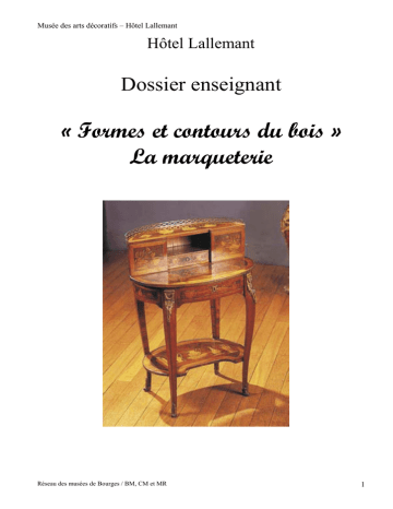 Musée des arts décoratifs – Hôtel Lallemant Hôtel Lallemant Dossier enseignant « Formes et contours du bois » La marqueterie Réseau des musées de Bourges / BM, CM et MR 1 Musée des arts décoratifs – Hôtel Lallemant Informations pratiques Sommaire : Le musée mode d'emploi L'animation Correction du questionnaire Questionnaire Plan du musée p. 2 p. 3 p. 4 p. 6 p. 8 Le musée mode d'emploi : Lieu : musée des arts décoratifs, 6 rue Bourbonnoux, 18000 Bourges Ouverture : 9h-12h/14h-18h pour les groupes sur rendez-vous, le mardi, le mercredi, le jeudi et le vendredi 10h-12h/14h-18h pour les visiteurs individuels, tous les jours sauf le lundi, le dimanche matin et certains jours fériés (horaires soumis à modifications saisonnières). Contacts : Emeline DANIEL, médiatrice culturelle au 02 48 70 41 92 ou par mail : [email protected] Présentation du musée : www.ville-bourges.fr Entrée et activité gratuites Réseau des musées de Bourges / BM, CM et MR 2 Musée des arts décoratifs – Hôtel Lallemant L'animation : Niveau : cycle 3 Objectifs de connaissances : - découvrir un vocabulaire spécifique (marqueterie, essences de bois, mobilier,…) - retenir le nom des essences de bois les plus courantes (chêne, acajou, ….) - apprendre le nom et les fonctions de différents meubles (secrétaire, buffet, cabinet,…) - appréhender l’évolution des styles dans le mobilier - découvrir une technique de décor sur bois - comprendre un espace muséographique Objectifs de compétences : - écouter et recueillir des informations - observer et émettre des hypothèses (fonction des meubles, …) - appréhender les formes et les couleurs par la réalisation d’un travail plastique inspirée de la technique de la marqueterie Durée : 1h30 à 2 heures Déroulement : - accueil des enfants dans la salle jeune public : présentation du musée, des activités et dialogue autour des différentes essences de bois - visite des salles : recherche du mobilier, identification, approche des styles et de la technique de la marqueterie - retour dans la salle jeune public pour l’atelier Réseau des musées de Bourges / BM, CM et MR 3 Musée des arts décoratifs – Hôtel Lallemant Correction du questionnaire A la découverte du mobilier Je suis un bureau et je sers à écrire. Je suis un buffet et je sers à ranger la vaisselle. Je suis un cabinet et je sers à ranger des objets précieux. Je suis un scriban et je sers à écrire et ranger la correspondance. L’évolution des styles Commodes Tables Fauteuils Réseau des musées de Bourges / BM, CM et MR 4 Musée des arts décoratifs – Hôtel Lallemant Bureaux Les essences de bois Je suis de couleur noire et je suis un bois exotique très dur : EBENE Je suis de couleur brun clair, je suis un arbre très courant dans nos forêts : CHENE Je suis de couleur rouge et je suis un bois exotique : ACAJOU Je suis un résineux de couleur claire, je suis très utilisé car peu coûteux : SAPIN Je suis de la même couleur que mes fruits, je pousse au bord de la mer Méditerranée : CITRONNIER Glossaire Armoire : meuble de rangement, à tablettes, fermé par deux portes Bibliothèque : meuble ou assemblage de tablette permettant de ranger et de classer des livres Bonheur du jour : petit bureau de dame portant, en retrait, un gradin à casiers (18e siècle) Buffet : meuble, souvent à deux corps superposés, où l'on range la vaisselle, les couverts, la verrerie, etc… Bureau : table, munie ou non de tiroirs de rangement, sur laquelle on écrit Cabinet : meuble à compartiments, à tiroirs ou à portes, pour ranger des objets précieux Chaise : siège à dossier sans bras Commode : meuble bas de rangement, à tiroirs superposés Encoignures : petit meuble de plan triangulaire qu'on place dans l'angle d'une pièce Fauteuil : siège individuel à dossier et à bras Paravent : meuble d'appartement fait de panneaux verticaux mobiles qu'on dispose en ligne brisée, destinée à protéger contre les courants d'air, à isoler Scriban : meuble composé d'un secrétaire à abattant surmonté d'un corps d'armoire Secrétaire : meuble haut ou bas, à tiroirs et à casiers, comportant une surface pour écrire, escamotable ou non Table : meuble composé d'un plateau horizontal posé sur un ou plusieurs pieds Tabouret : siège à piétement sans dossier ni bras Réseau des musées de Bourges / BM, CM et MR 5 Musée des arts décoratifs – Hôtel Lallemant Salon bleu A la découverte du mobilier Salle à manger d’hiver Je suis un(e) Je sers à table bricoler bureau manger commode écrire Je suis un(e) Je sers à bureau ranger des outils armoire ranger des objets précieux cabinet ranger des médicaments Salon Louis XV Chambre basse Je suis un(e) ranger des livres armoire ranger de la vaisselle ranger de la nourriture Réseau des musées de Bourges / BM, CM et MR Je sers à scriban se coiffer, se Je sers à buffet bibliothèque Je suis un(e) maquiller commode écrire et ranger coiffeuse ranger les cravates et les chaussettes 6 Musée des arts décoratifs – Hôtel Lallemant L’évolution des styles Les essences de bois Reconstitue les paires (ancien et nouveau meubles) en notant Pour trouver les différentes essences de bois, remets les lettres leur numéro puis donne le nom de chacune des paires. dans l’ordre : 1. ……………………………………………………………….. 2. ……………………………………………………………….. Je suis de couleur noire et je suis un bois exotique très dur : 3. ……………………………………………………………….. ENEBE ………………………………………………………… 4. ……………………………………………………………….. Je suis de couleur brun clair, je suis un arbre très courant dans nos forêts : CNEHE …………………………………………… Je suis de couleur rouge et je suis un bois exotique : AOAJCU ………