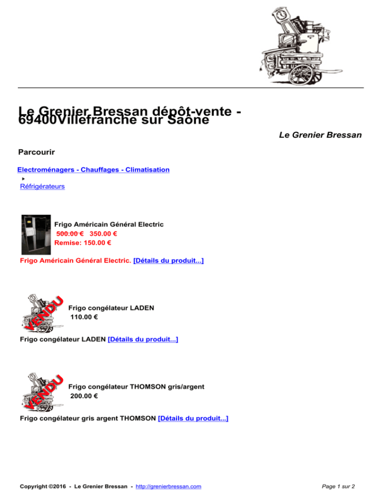 Le Grenier Bressan dépôt-vente 69400Villefranche sur Saône Le Grenier Bressan Parcourir Electroménagers - Chauffages - Climatisation Réfrigérateurs Frigo Américain Général Electric 500.00 € 350.00 € Remise: 150.00 € Frigo Américain Général Electric. [Détails du produit...] Frigo congélateur LADEN 110.00 € Frigo congélateur LADEN [Détails du produit...] Frigo congélateur THOMSON gris/argent 200.00 € Frigo congélateur gris argent THOMSON [Détails du produit...] Copyright ©2016 - Le Grenier Bressan - http://grenierbressan.com Page 1 sur 2 Frigo congélateur WIRLPOOL 180.00 € Frigo congélateur Wirlpool. [Détails du produit...] Frigo Wirlpool 100.00 € Frigo Wirlpool [Détails du produit...] Copyright ©2016 - Le Grenier Bressan - http://grenierbressan.com Page 2 sur 2