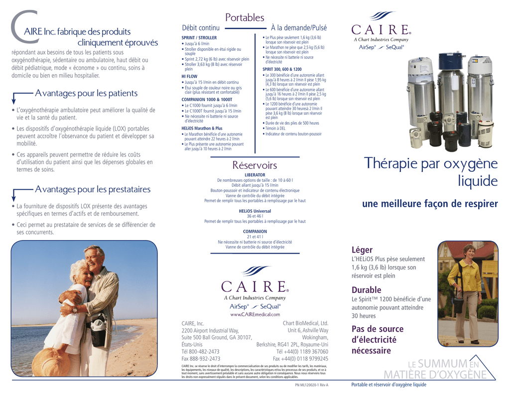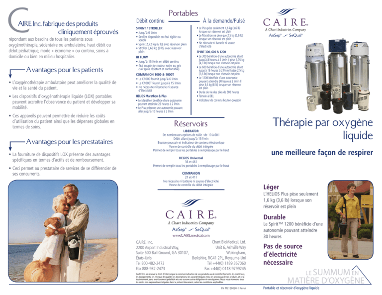 C AIRE Inc. fabrique des produits cliniquement éprouvés répondant aux besoins de tous les patients sous oxygénothérapie, sédentaire ou ambulatoire, haut débit ou débit pédiatrique, mode « économe » ou continu, soins à domicile ou bien en milieu hospitalier. Avantages pour les patients •L’oxygénothérapie ambulatoire peut améliorer la qualité de vie et la santé du patient. •Les dispositifs d’oxygénothérapie liquide (LOX) portables peuvent accroître l’observance du patient et développer sa mobilité. •Ces appareils peuvent permettre de réduire les coûts d’utilisation du patient ainsi que les dépenses globales en termes de soins. Avantages pour les prestataires •La fourniture de dispositifs LOX présente des avantages spécifiques en termes d’actifs et de remboursement. •Ceci permet au prestataire de services de se différencier de ses concurrents. Débit continu Portables SPRINT / STROLLER • Jusqu’à 6 l/min • Stroller disponible en étui rigide ou souple • Sprint 2,72 kg (6 lb) avec réservoir plein • Stroller 3,63 kg (8 lb) avec réservoir plein HI FLOW • Jusqu’à 15 l/min en débit continu • Étui souple de couleur noire ou gris clair (plus résistant et confortable) COMPANION 1000 & 1000T • Le C1000 fournit jusqu’à 6 l/min • Le C1000T fournit jusqu’à 15 l/min • Ne nécessite ni batterie ni source d’électricité HELiOS Marathon & Plus • Le Marathon bénéficie d’une autonomie pouvant atteindre 22 heures à 2 l/min • Le Plus présente une autonomie pouvant aller jusqu’à 10 heures à 2 l/min À la demande/Pulsé • Le Plus pèse seulement 1,6 kg (3,6 lb) lorsque son réservoir est plein • Le Marathon ne pèse que 2,5 kg (5,6 lb) lorsque son réservoir est plein • Ne nécessite ni batterie ni source d’électricité SPIRIT 300, 600 & 1200 • Le 300 bénéficie d’une autonomie allant jusqu’à 8 heures à 2 l/min Il pèse 1,95 kg (4,3 lb) lorsque son réservoir est plein • Le 600 bénéficie d’une autonomie allant jusqu’à 16 heures à 2 l/min Il pèse 2,5 kg (5,6 lb) lorsque son réservoir est plein • Le 1200 bénéficie d’une autonomie pouvant atteindre 30 heuresà 2 l/min Il pèse 3,6 kg (8 lb) lorsque son réservoir est plein • Durée de vie des piles de 500 heures • Témoin à DEL • Indicateur de contenu bouton-poussoir Réservoirs LIBERATOR De nombreuses options de taille : de 10 à 60 l Débit allant jusqu’à 15 l/min Bouton-poussoir et indicateur de contenu électronique Vanne de contrôle du débit intégrée Permet de remplir tous les portables à remplissage par le haut HELiOS Universal 36 et 46 l Permet de remplir tous les portables à remplissage par le haut COMPANION 21 et 41 l Ne nécessite ni batterie ni source d’électricité Vanne de contrôle du débit intégrée Thérapie par oxygène liquide une meilleure façon de respirer Léger L’HELiOS Plus pèse seulement 1,6 kg (3,6 lb) lorsque son réservoir est plein Durable Le Spirit™ 1200 bénéficie d’une autonomie pouvant atteindre 30 heures Chart BioMedical, Ltd. CAIRE, Inc. Unit 6, Ashville Way 2200 Airport Industrial Way, Wokingham, Suite 500 Ball Ground, GA 30107, Berkshire, RG41 2PL, Royaume-Uni États-Unis Tél +44(0) 1189 367060 Tél 800-482-2473 Fax +44(0) 0118 9799245 Fax 888-932-2473 CAIRE Inc. se réserve le droit d’interrompre la commercialisation de ses produits ou de modifier les tarifs, les matériaux, les équipements, les niveaux de qualité, les descriptions, les caractéristiques et/ou les processus de ses produits, et ce à tout moment, sans avertissement préalable et sans aucune autre obligation ni conséquence. Nous nous réservons tous les droits non expressément stipulés dans le présent document, selon les conditions applicables. PN ML120020-1 Rév A Pas de source d’électricité nécessaire LE SUMMUM EN MATIÈRE D’OXYGÈNE Portable et réservoir d’oxygène liquide G La différence en termes de disponibilité: tous les prestataires ne peuvent pas proposer de dispositifs LOX ammes HELiOS et Spirit: une meilleure façon de respirer •Petit et portable pour inciter à l’activité. •Économie d’oxygène : mode « sur demande » ou « pulsé ». •Autonomie prolongée ; intervalles plus importants entre les recharges. •Les patients recevant de l’oxygène liquide seront examinés régulièrement. Les modèles sans administration n’offrent aucune possibilité d’évaluation du patient. Permettent de réduire les coûts d’utilisation du patient ainsi que les dépenses globales en termes de soins. •Il est possible que les patients les plus observants quant à leur thérapie par O2 d’appoint fassent moins de séjours à l’hôpital ou de visites aux urgences. •Les systèmes LOX ne nécessitent pas de source d’électricité, ce qui permet au patient d’économiser de 35 à 70 $ par mois sur ses factures. •Les dispositifs d’oxygénothérapie ambulatoires peuvent diminuer la dépendance du patient quant aux services de soins supplémentaires. •Les patients actifs souffrant de BPCO bénéficient d’une meilleure santé ainsi que d’une amélioration de leur qualité de vie. L’augmentation de l’activité du patient s’aligne avec l’objectif du médecin quant aux améliorations en termes de résultats chez le patient. Une ordonnance pour un dispositif LOX portable garantira que le patient obtient l’équipement désigné. La fourniture de dispositifs LOX présente des avantages spécifiques en termes d’actifs et de remboursement. •Les patients peuvent bénéficier d’un équipement LOX pendant toute leur vie, même si leurs besoins respiratoires changent. •Moins de stock de cylindres et de pertes potentielles dues à des difficultés de suivi. •Les cylindres doivent recevoir une nouvelle certification tous les cinq ans. Les cylindres dédiés nécessitent un entretien spécifique. •Meilleure utilisation des actifs existants si vous po