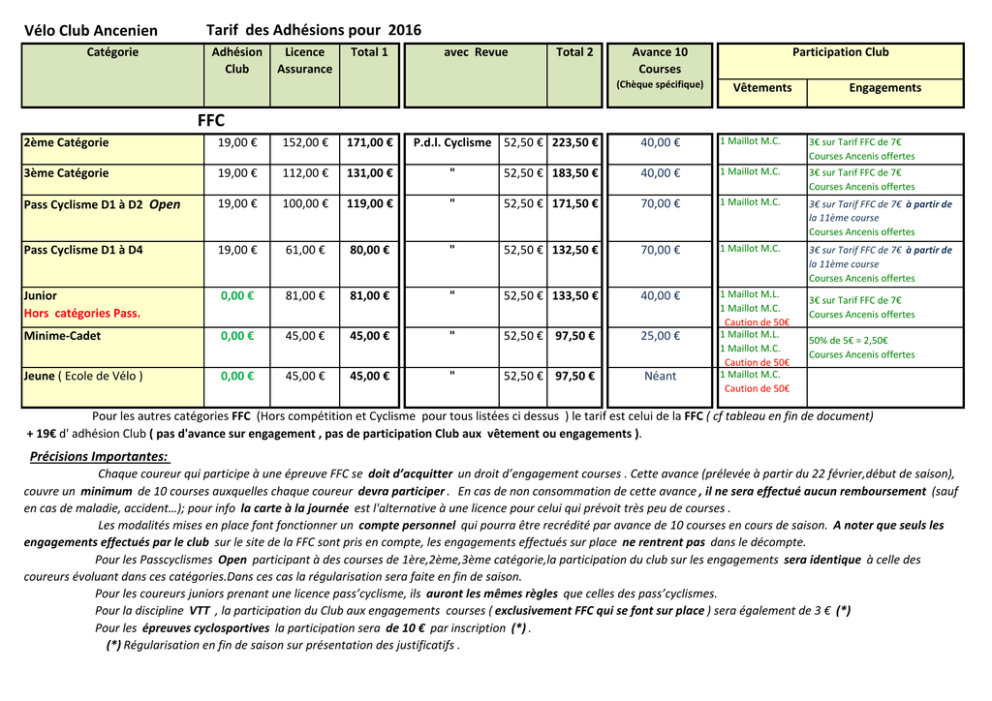 Vélo Club Ancenien Catégorie Tarif des Adhésions pour 2016 Adhésion Club Licence Assurance Total 1 avec Revue Total 2 Avance 10 Courses (Chèque spécifique) Participation Club Vêtements Engagements FFC 40,00 € 1 Maillot M.C. 3€ sur Tarif FFC de 7€ Courses Ancenis offertes 52,50 € 183,50 € 40,00 € 1 Maillot M.C. 3€ sur Tarif FFC de 7€ Courses Ancenis offertes " 52,50 € 171,50 € 70,00 € 1 Maillot M.C. 3€ sur Tarif FFC de 7€ à partir de la 11ème course Courses Ancenis offertes 80,00 € " 52,50 € 132,50 € 70,00 € 1 Maillot M.C. 3€ sur Tarif FFC de 7€ à partir de la 11ème course Courses Ancenis offertes 81,00 € 81,00 € " 52,50 € 133,50 € 40,00 € 0,00 € 45,00 € 45,00 € " 52,50 € 97,50 € 25,00 € 0,00 € 45,00 € 45,00 € " 52,50 € 97,50 € Néant 1 Maillot M.L. 1 Maillot M.C. Caution de 50€ 1 Maillot M.L. 1 Maillot M.C. Caution de 50€ 1 Maillot M.C. Caution de 50€ 2ème Catégorie 19,00 € 152,00 € 171,00 € P.d.l. Cyclisme 52,50 € 223,50 € 3ème Catégorie 19,00 € 112,00 € 131,00 € " Pass Cyclisme D1 à D2 Open 19,00 € 100,00 € 119,00 € Pass Cyclisme D1 à D4 19,00 € 61,00 € Junior Hors catégories Pass. 0,00 € Minime-Cadet Jeune ( Ecole de Vélo ) 3€ sur Tarif FFC de 7€ Courses Ancenis offertes 50% de 5€ = 2,50€ Courses Ancenis offertes Pour les autres catégories FFC (Hors compétition et Cyclisme pour tous listées ci dessus ) le tarif est celui de la FFC ( cf tableau en fin de document) + 19€ d' adhésion Club ( pas d'avance sur engagement , pas de participation Club aux vêtement ou engagements ). Précisions Importantes: Chaque coureur qui participe à une épreuve FFC se doit d’acquitter un droit d’engagement courses . Cette avance (prélevée à partir du 22 février,début de saison), couvre un minimum de 10 courses auxquelles chaque coureur devra participer . En cas de non consommation de cette avance , il ne sera effectué aucun remboursement (sauf en cas de maladie, accident…); pour info la carte à la journée est l'alternative à une licence pour celui qui prévoit très peu de courses . Les modalités mises en place font fonctionner un compte personnel qui pourra être recrédité par avance de 10 courses en cours de saison. A noter que seuls les engagements effectués par le club sur le site de la FFC sont pris en compte, les engagements effectués sur place ne rentrent pas dans le décompte. Pour les Passcyclismes Open participant à des courses de 1ère,2ème,3ème catégorie,la participation du club sur les engagements sera identique à celle des coureurs évoluant dans ces catégories.Dans ces cas la régularisation sera faite en fin de saison. Pour les coureurs juniors prenant une licence pass’cyclisme, ils auront les mêmes règles que celles des pass’cyclismes. Pour la discipline VTT , la participation du Club aux engagements courses ( exclusivement FFC qui se font sur place ) sera également de 3 € (*) Pour les épreuves cyclosportives la participation sera de 10 € par inscription (*) . (*) Régularisation en fin de saison sur présentation des justificatifs . Tarif des Adhésions pour 2016 Vélo Club Ancenien Catégorie Adhésion Club Licence Assurance Total 1 avec Revue Total 2 Avance 10 Courses (Chèque spécifique) Participation Club Vêtements Engagements FFC FFCT Mini Braquet 1er adulte (Famille) 2ème adulte Petit Braquet 1er adulte (Famille ) 2ème adulte Grand Braquet 1er adulte (Famille ) 2ème adulte 19,00 € 42,00 € 61,00 € 19,00 € 26,70 € 45,70 € 19,00 € 43,50 € 62,50 € 19,00 € 28,20 € 47,20 € 19,00 € 92,00 € 111,00 € 19,00 € 76,70 € 95,70 € 10,00 € 29,00 € Revue FFCT 24,00 € 85,00 € 15 € à la Semaine Fédérale " " 24,00 € 86,50 € " " " 24,00 € 135,00 € " " CLUB Randonneur 19,00 € Sympathisant 20,00 € NB: 20,00 € Encadrant membre du bureau , Educateur BF* ou Arbitre => Le club prend en charge la valeur de la licence . Encadrant non membre du bureau => Le club prend en charge la valeur d'un maillot Rappel Tarifs FFC 2016 2 Inscriptions Rando / an