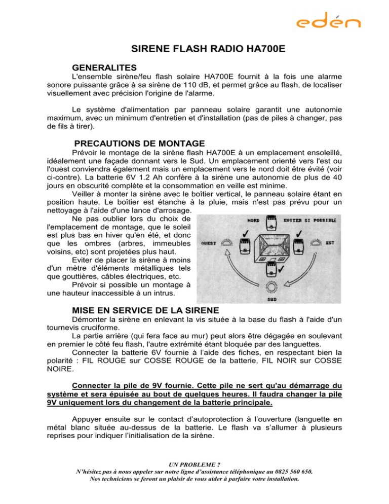 SIRENE FLASH RADIO HA700E GENERALITES L'ensemble sirène/feu flash solaire HA700E fournit à la fois une alarme sonore puissante grâce à sa sirène de 110 dB, et permet grâce au flash, de localiser visuellement avec précision l'origine de l'alarme. Le système d'alimentation par panneau solaire garantit une autonomie maximum, avec un minimum d'entretien et d'installation (pas de piles à changer, pas de fils à tirer). PRECAUTIONS DE MONTAGE Prévoir le montage de la sirène flash HA700E à un emplacement ensoleillé, idéalement une façade donnant vers le Sud. Un emplacement orienté vers l'est ou l'ouest conviendra également mais un emplacement vers le nord doit être évité (voir ci-contre). La batterie 6V 1.2 Ah confère à la sirène une autonomie de plus de 40 jours en obscurité complète et la consommation en veille est minime. Veiller à monter la sirène avec le boîtier vertical, le panneau solaire étant en position haute. Le boîtier est étanche à la pluie, mais n'est pas prévu pour un nettoyage à l'aide d'une lance d'arrosage. Ne pas oublier lors du choix de l'emplacement de montage, que le soleil est plus bas en hiver qu'en été, et donc que les ombres (arbres, immeubles voisins, etc) sont projetées plus haut. Eviter de placer la sirène à moins d'un mètre d'éléments métalliques tels que gouttières, câbles électriques, etc. Prévoir si possible un montage à une hauteur inaccessible à un intrus. MISE EN SERVICE DE LA SIRENE Démonter la sirène en enlevant la vis située à la base du flash à l'aide d'un tournevis cruciforme. La partie arrière (qui fera face au mur) peut alors être dégagée en soulevant en premier le côté feu flash, l'autre extrémité étant bloquée par des languettes. Connecter la batterie 6V fournie à l’aide des fiches, en respectant bien la polarité : FIL ROUGE sur COSSE ROUGE de la batterie, FIL NOIR sur COSSE NOIRE. Connecter la pile de 9V fournie. Cette pile ne sert qu'au démarrage du système et sera épuisée au bout de quelques heures. Il faudra changer la pile 9V uniquement lors du changement de la batterie principale. Appuyer ensuite sur le contact d’autoprotection à l’ouverture (languette en métal blanc située au-dessus de la batterie. Le flash va s’allumer à plusieurs reprises pour indiquer l’initialisation de la sirène. UN PROBLEME ? N’hésitez pas à nous appeler sur notre ligne d’assistance téléphonique au 0825 560 650. Nos techniciens se feront un plaisir de vous aider à parfaire votre installation. REGLAGE DU CODE RADIO La sirène est mise en marche et arrêtée par l’émetteur radio situé dans votre centrale HA700. Le code radio permettant la communication entre centrale d’alarme et sirène est réglé sur la sirène par positionnement d’une séquence de 8 microcontacts. Le bloc de microcontacts est accessible sur la sirène en démontant les 3 vis qui fixent le coin supérieur gauche du boîtier intérieur, situé en face du contact d’autoprotection (languette en métal blanc). Le code doit est réglé à l’identique sur le bloc de microcontacts de la centrale HA700 (situé à gauche de l'emplacement des piles) et sur le bloc de microcontacts situé dans la sirène. TEMPORISATION DE LA SIRENE La sirène est normalement déclenchée par la centrale, par l'intermédiaire de son émetteur, et est arrêtée de la même façon. Sa durée de fonctionnement est donc celle programmée sur la centrale. Une temporisation de sécurité autonome, réglable sur la sirène elle-même lui permet toutefois de s'arrêter, si par exemple l'instruction d'arrêt envoyée par l'émetteur n'a pas été reçue. La durée de cette temporisation de sécurité peut être réglée sur 3 minutes ou 15 minutes. Le réglage de la temporisation de sécurité s'effectue au moyen du microcontact N°9 dans le boîtier de la sir ène : sur ON, la durée d'alarme maximum sera de 15 minutes. Sur OFF, elle sera de 3 minutes (voir schéma). UN PROBLEME ? N’hésitez pas à nous appeler sur notre ligne d’assistance téléphonique au 0825 560 650. Nos techniciens se feront un plaisir de vous aider à parfaire votre installation. POSSIBILITE D'ALARME SILENCIEUSE Il vous est possible d'invalider la sirène et de ne conserver actif que le flash. Pour cela, enlever le cavalier marqué P3/SIREN situé sur le circuit imprimé à l'intérieur de la sirène. En cas de déclenchement, l'alarme ne sera alors donnée que de façon visuelle par le flash, sans que la sirène retentisse. Ces réglages étant terminés, remonter le boîtier intérieur en replaçant ses 3 vis de fixation. Procéder ensuite à un test de fonctionnement de la façon suivante, la sirène étant à proximité de la centrale : Appuyer sur la touche «panique» de la télécommande. L’alarme doit se déclencher à la fois sur la centrale et sur la sirène HA700E. Arrêter l’alarme en appuyant sur la touche «OFF» ou télécommande après un délai de 8 secondes. de la Renouveler ensuite le test, si possible en tenant manuellement la sirène à l’emplacement prévu pour son montage définitif, de façon à vérifier que la portée radio par rapport à la centrale est suffisante. MONTAGE DE LA SIRENE Marquer sur le mur les emplacements à forer pour les vis de fixation de la platine arrière, percer, mettre en place les chevilles, rapporter le capot (flèche vers le haut) puis monter les vis. Mettre en place la sirène sur sa platine et remonter la vis à la base du flash. UTILISATION Votre sirène flash fonctionne dès lors de façon autonome et est contrôlée par la centrale d'alarme, par l'intermédiaire de son émetteur. Lors d'un déclenchement d'alarme, le combiné sirène flash se déclenche en même temps que la centrale, et est coupé par l'un des évènements suivants : - arrêt de l'alarme par l'utilisateur au moyen d'une télécommande, d'un clavier déporté ou du clavier de la centrale (attendre au minimum une dizaine de second