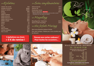 Epilations Soins complémentaires Teinture Sourcils 10 € Création de sourcils 10€ Entretien de sourcils 8,50 € Teinture Cils 18 € Lèvres ou menton 8,50 € Décoloration Lèvres 10 € Visage 20 € Nouveau Test de Colorimétrie 25 € (Idéal pour déterminer les couleurs qui peuvent vous mettre en valeur; Aisselles 11€ Vous partirez avec votre nuancier de couleurs) Maillot classique 11€ Maillot échancré 13€ Maillot échancré + 15€ Maillot ticket de métro 22€ Maillot complet 24€ Maquillage Soir / Cérémonie 25 € Fesses 5€ Séance conseil maquillage 35 € Ventre 4€ Bras 17€ Cuisses 20€ Demi-Jambes 18€ Nous vous proposons plusieurs forfaits. Jambes complètes 25€ Pour votre mariage, n’hésitez pas à nous consulter pour Dos ou torse 20€ les découvrir. Maquillage Nos 3 épilations au choix = 5 € de remise ! forfaits Mariage Pensez aux cartes cadeaux ! Pour toutes les occasions... 38 rue du Général De Gaulle - 60510 BRESLES TEL : 03 44 49 19 08 Stationnement facile sur un parking (À côté du Crédit Agricole) Lundi 14h - 19h Mardi 9h30 - 18h Mercredi 10h - 17h Jeudi 9h30 - 13h / 14h - 19h Vendredi 9h30 - 19h Samedi 10h - 17h avec ou sans RDV selon disponibilités Tarifs au 1er janvier 2015 http://institut.belleetzen.free.fr Sur Facebook : Institut Belle et Zen à Bresles Mail : [email protected] Soins du Visage Soins Visage et Corps Voyage aux Caraïbes Nouveau Massage Essentiel 21€ (Gommage + Massage corps et soin visage vanille coco) 90 € Zen Attitude Soin Hydraclean 29€ (Soin visage, massage dos, soin délassant jambes) 90 € (Visage, nuque, décolleté, trapèzes) Gommage Corps + Massage 61€ Soin Sucre Kiwi (Sucre blanc, sucre roux, pépins de kiwi) Voyage Provençal61 € (Nettoyant profond) (Figue raisin) (Hydratant) (Caramel au beurre salé, pomme) Secret de Beauté 107€ Voyage Celte61 € Belle et Naturelle 32€ Nouveau (Soin sucre kiwi + Soin aromatic) L’odyssée Celte Soin Autour de la Rose 48€ (Voyage celte + Instant précieux) 119 € L’odyssée Orientale L’Instant Cocoon 49€ (Voyage Oriental + l’Instant Cocoon) 135 € (Hydratant) (Mise en beauté et détente) Massages Relaxants Massages Energétiques Soin Aromatic 50€ (Aux huiles essentielles) Voyage Polynésien 61€ Nouveau (Sable de Bora Bora, Fleurs d’hibiscus, Mangue) Nouveau Voyage Soleil Levant 61€ (Riz, thé vert, litchi, fleurs d’Asie, lotus, nymphéa kiwi) Voyage Oriental (+enveloppement) 90€ (Sucre roux, orange douce, argan) Soin Beauté Neuve 60€ (Soin rénovateur aux acides de fruits) Massage Anti-stress 57€ (Relaxant aux huiles essentielles) Soin Drainant Visage 60€ (Idéal rougeurs, éclat du teint) Massage en Etoile 60€ Un espace détente pouvant accueillir 2 personnes en (Cuir chevelu, mains, pieds) L’Instant Précieux 60€ même temps, avec une Balnéo double. Vous pourrez (Eclat, renouvellement cellulaire, or et perles de culture) L’évasion 60€ désormais faire des soins en couple ou entre amis. (Massage visage et corps) Ambiance Japonaise 65€ (Soin + Massage facial japonais) Massage Balinais 65€ Balnéo : 26 € / 36 € pour 2 (Doux et tonique pour évacuer le stress) Soin Hydradermie / Hydradermie + 59 / 69 € L’escale Essentielle : Balnéo+ (Traitant profond et relaxant) Massage Indonésien 70€ Massage visage, nuque, décolleté 45 € / 73 € pour 2 (Relaxant, doux, intense) Soin Hydradermie Lift 85€ L’escale Bien-Être : Balnéo+ (Effet lifting immédiat) Massage Hawaïen 70€ Massage corps 57 € / 97 € pour 2 (Relaxant musculaire profond) Age Summum 89€ Nouveau L’escale Hawaïenne : (Soin traitant des signes de l’âge) Modelage Suédois 70€ Balnéo + Détente Hawaïenne 60 € / 104 € pour 2 (Tonique et puissant pour une détente musculaire) TRIO JEUNESSE : 3 soins sur 3 semaines L’escale Détente : Balnéo+ soin relaxant Soin aux pierres chaudes 85€ pour un visage plus jeune 195 € Dos + Massage aromatic 75 € / 132 € pour 2 Massage Traditionnel Thaïlandais 90€ Nouveau L’escale Peau Neuve : Gommage + Balnéo+ (Soulage les tensions musculaires, articulaires et la douleur. Améliore la circulation sanguine et lymphatique. Diminue les malaises liées au stress, augmente la souplesse) Massage 84 € / 150 € pour 2 L’escale Suédoise : Balnéo + Massage Suédois 94 € / 171 € pour 2 La détente Hawaïenne 35€ L’escale aux Caraïbes : Balnéo+ Gommage, (Massage dos relaxant musculaire profond) Massage corps et soin visage 115 € / 215 € pour 2 Le relax Suédois 35€ Massage Tibétain 70€ (Massage dos tonique et puissant) L’escale Beauté : Balnéo+ Soin visage, (Relaxant, décontractant, assouplissant) Gommage et Massage corps 130 € / 243 € pour 2 Douceur du Dos Nouveau 37 € Massage Indien 70€ (Gommage + Massage dos) L’escale Extase : Balnéo+ Massage antistress, (Détoxifiant, tonifiant, relaxant) Massage aromatic + Massage Étoile162 € / 308 € pour 2 Soin Fraicheur des Jambes 40 € Massage Chinois 70€ Nouveau Soins du corps L’espace Détente (Pour éliminer le stress, la fatigue et retrouver son énergie) Reiki 48€ (Soin énergétique agissant au niveau physique, psychologique et spirituel) Tarifs au 1er janvier 2015