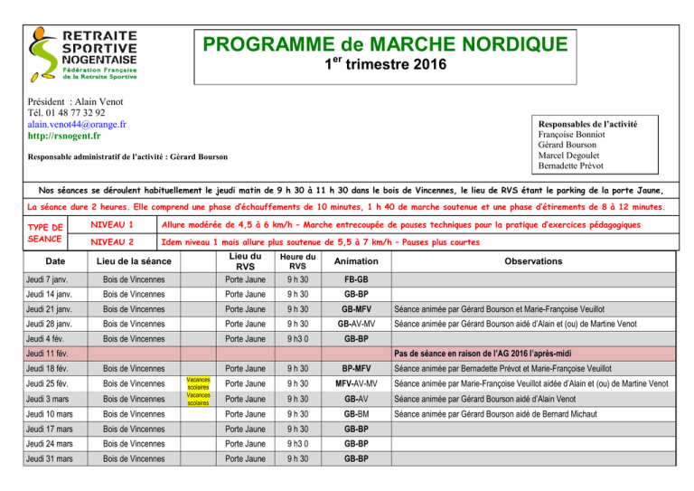 PROGRAMME de MARCHE NORDIQUE 1er trimestre 2016 Président : Alain Venot Tél. 01 48 77 32 92 [email protected] http://rsnogent.fr Responsables de l’activité Françoise Bonniot Gérard Bourson Marcel Degoulet Bernadette Prévot Responsable administratif de l’activité : Gérard Bourson Nos séances se déroulent habituellement le jeudi matin de 9 h 30 à 11 h 30 dans le bois de Vincennes, le lieu de RVS étant le parking de la porte Jaune, La séance dure 2 heures. Elle comprend une phase d’échauffements de 10 minutes, 1 h 40 de marche soutenue et une phase d’étirements de 8 à 12 minutes. TYPE DE SEANCE NIVEAU 1 Allure modérée de 4,5 à 6 km/h – Marche entrecoupée de pauses techniques pour la pratique d’exercices pédagogiques NIVEAU 2 Idem niveau 1 mais allure plus soutenue de 5,5 à 7 km/h – Pauses plus courtes Jeudi 7 janv. Bois de Vincennes Lieu du RVS Porte Jaune Jeudi 14 janv. Bois de Vincennes Porte Jaune 9 h 30 GB-BP Jeudi 21 janv. Bois de Vincennes Porte Jaune 9 h 30 GB-MFV Jeudi 28 janv. Bois de Vincennes Porte Jaune 9 h 30 GB-AV-MV Jeudi 4 fév. Bois de Vincennes Porte Jaune 9 h3 0 GB-BP Date Lieu de la séance Heure du RVS Animation 9 h 30 FB-GB Jeudi 11 fév. Jeudi 18 fév. Observations Séance animée par Gérard Bourson et Marie-Françoise Veuillot Séance animée par Gérard Bourson aidé d’Alain et (ou) de Martine Venot Pas de séance en raison de l’AG 2016 l’après-midi Bois de Vincennes Vacances scolaires Vacances scolaires Porte Jaune 9 h 30 BP-MFV Porte Jaune 9 h 30 MFV-AV-MV Porte Jaune 9 h 30 GB-AV Séance animée par Gérard Bourson aidé d’Alain Venot Séance animée par Gérard Bourson aidé de Bernard Michaut Jeudi 25 fév. Bois de Vincennes Jeudi 3 mars Bois de Vincennes Jeudi 10 mars Bois de Vincennes Porte Jaune 9 h 30 GB-BM Jeudi 17 mars Bois de Vincennes Porte Jaune 9 h 30 GB-BP Jeudi 24 mars Bois de Vincennes Porte Jaune 9 h3 0 GB-BP Jeudi 31 mars Bois de Vincennes Porte Jaune 9 h 30 GB-BP Séance animée par Bernadette Prévot et Marie-Françoise Veuillot Séance animée par Marie-Françoise Veuillot aidée d’Alain et (ou) de Martine Venot
