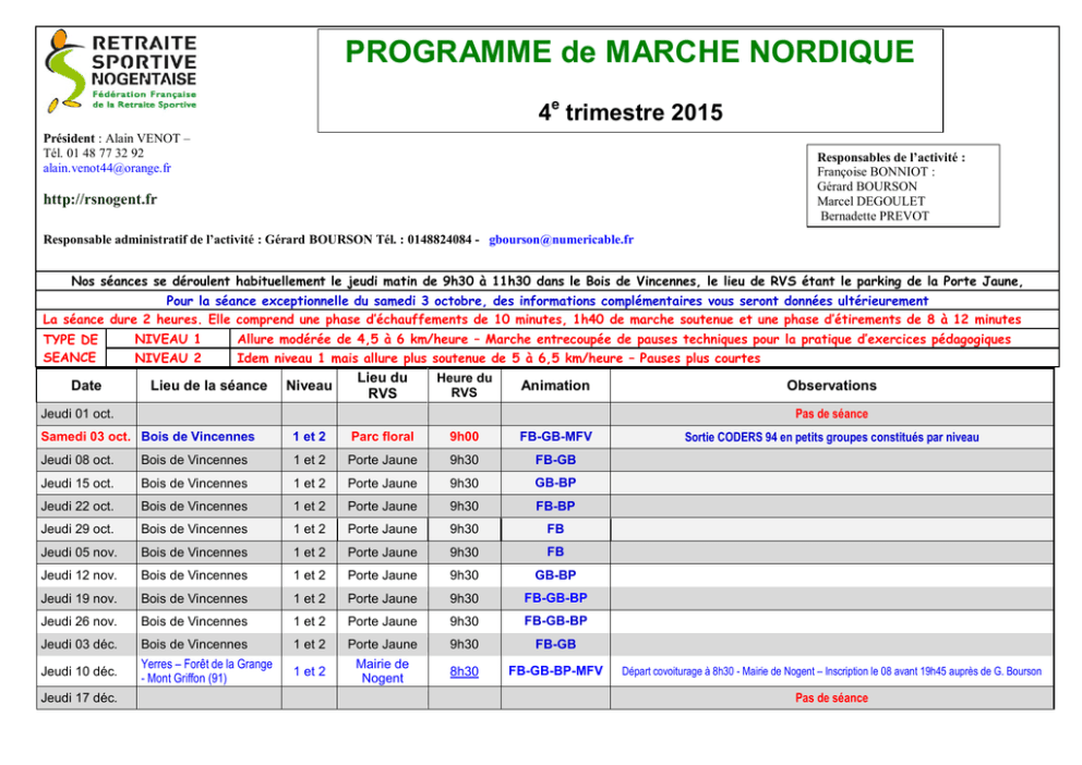 PROGRAMME de MARCHE NORDIQUE 4e trimestre 2015 Président : Alain VENOT – Tél. 01 48 77 32 92 [email protected] Responsables de l’activité : Françoise BONNIOT : Gérard BOURSON Marcel DEGOULET Bernadette PREVOT http://rsnogent.fr Responsable administratif de l’activité : Gérard BOURSON Tél. : 0148824084 - [email protected] Nos séances se déroulent habituellement le jeudi matin de 9h30 à 11h30 dans le Bois de Vincennes, le lieu de RVS étant le parking de la Porte Jaune, Pour la séance exceptionnelle du samedi 3 octobre, des informations complémentaires vous seront données ultérieurement La séance dure 2 heures. Elle comprend une phase d’échauffements de 10 minutes, 1h40 de marche soutenue et une phase d’étirements de 8 à 12 minutes NIVEAU 1 Allure modérée de 4,5 à 6 km/heure – Marche entrecoupée de pauses techniques pour la pratique d’exercices pédagogiques TYPE DE SEANCE NIVEAU 2 Idem niveau 1 mais allure plus soutenue de 5 à 6,5 km/heure – Pauses plus courtes Date Lieu de la séance Niveau Lieu du RVS Heure du RVS Animation Pas de séance Jeudi 01 oct. Samedi 03 oct. Bois de Vincennes 1 et 2 Parc floral 9h00 FB-GB-MFV Jeudi 08 oct. Bois de Vincennes 1 et 2 Porte Jaune 9h30 FB-GB Jeudi 15 oct. Bois de Vincennes 1 et 2 Porte Jaune 9h30 GB-BP Jeudi 22 oct. Bois de Vincennes 1 et 2 Porte Jaune 9h30 FB-BP Jeudi 29 oct. Bois de Vincennes 1 et 2 Porte Jaune 9h30 FB Jeudi 05 nov. Bois de Vincennes 1 et 2 Porte Jaune 9h30 FB Jeudi 12 nov. Bois de Vincennes 1 et 2 Porte Jaune 9h30 GB-BP Jeudi 19 nov. Bois de Vincennes 1 et 2 Porte Jaune 9h30 FB-GB-BP Jeudi 26 nov. Bois de Vincennes 1 et 2 Porte Jaune 9h30 FB-GB-BP Jeudi 03 déc. Bois de Vincennes 1 et 2 Porte Jaune 9h30 FB-GB Jeudi 10 déc. Yerres – Forêt de la Grange - Mont Griffon (91) 1 et 2 Mairie de Nogent 8h30 FB-GB-BP-MFV Jeudi 17 déc. Observations Sortie CODERS 94 en petits groupes constitués par niveau Départ covoiturage à 8h30 - Mairie de Nogent – Inscription le 08 avant 19h45 auprès de G. Bourson Pas de séance