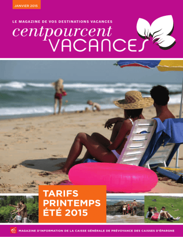 JANVIER 2015 Le maga zine de vos destinations vacances TARIFS PRINTEMPS ÉTÉ 2015 MAGAZINE D’INFORMATION DE LA CAISSE GÉNÉRALE DE PRÉVOYANCE DES CAISSES D’ÉPARGNE 16 JANVIER 2015 ÉTÉ 2015 DES PRIX TOUJOURS TRÈS ATTRACTIFS ! Comme d’habitude, profitez des prix attractifs, à toutes périodes dans les résidences de Centpourcentvacances. ET PLUS ENCORE ! POUR 15 JOURS ET PLUS DANS LE MÊME APPARTEMENT, BÉNÉFICIEZ DE NOTRE OFFRE « VACANCES PLUS », JUSQU’À 25% DE RÉDUCTIONS (VOIR ENCADRÉS DANS LES PAGES TARIFS DES RÉSIDENCES) LES RÉSIDENCES Nous poursuivons régulièrement les programmes de travaux de rénovation et d’embellissement dans nos résidences, et nous y améliorons en permanence le confort. ■ ANGLET : réaménagement de l’accueil et de la salle de jeux (avec mis en place d’un baby-foot). ■ LES ANGLES : rénovation de toutes les cuisines, remplacement des canapés. ■ JUAN-LES-PINS : accueil, piscine et solarium entièrement rénovés. ■ LE CAP D’AGDE : à Beija Flor, après rénovation des salles de bains et des cuisines, réfection totale des sols et aménagement de placards, remplacement des canapés, aménagement de terrasses privatives pour profiter pleinement du calme et de la tranquillité du parc de la résidence ; aux Villégiales et à Mykonos, rénovation des salles de bains et des cuisines, remplacement des canapés à Mykonos. JUAN-LES-PINS SAINT-CYR-SUR-MER ■ SAINT-CYR-SUR-MER : réfection totale des cuisines et des sols, aménagement de placards, remplacement des portes-fenêtres et des volets, ainsi que des canapés. Rénovation de l’aire de jeux. ■ MEGÈVE : Remplacement de tous les canapés, création d’une nouvelle aire de jeux. La rénovation complète de la résidence vient de s’achever avec la fin des travaux du dernier chalet. ■ MÉRIBEL : remplacement des canapés. ■ LELEX : rénovation des salles de bains, réaménagement du coin cuisine pour les appartements de 10 personnes. ■ LE HOHWALD : après la rénovation des salles de bains, réaménagement du coin cuisine, installation d’une laverie pour l’ensemble de la résidence. LAMOR BADEN MEGEVE Réservation : www.centpourcentvacances.fr (n° d’affilié CGP + mot de passe) Centrale de réservation - Tél. 01 44 76 12 60 - Fax : 01 44 76 12 05 - Du lundi au vendredi 9h30 -12h /14h -16h30 la mer JANVIER 2015 17 Disponibilités et réservations sur notre site www.centpourcentvacances.fr ARCACHON Adresse : Résidence La Ville d’Eté Rénovation totale de la résidence 165 boulevard de la Plage - 33120 ARCACHON entre 2013 et 2014 Vue de la pointe du Cap Ferret, la dune du pyla (ou pilat) trône à l’entrée du bassin d’arCaChon. Vue splendide sur le banC d’arguin, promenade ViViFiante jusqu’au bord de l’eau, CouCher de soleil imprenable. un panorama irrésistiblement beau et sauVage en toutes CirConstanCes. La résidence « La Ville d’Eté » se compose de 54 appartements et est située en centre-ville près du casino, à proximité des plages, commerces et restaurants. Prix par appartement et par semaine - arrivée le dimanche entre 16 h et 18 h, départ le dimanche entre 8 h et 10 h. A votre Disposition : Gratuit : emplacement de parking en sous-sol, salle de jeux avec téléviseur, table de ping-pong, linge de lit fourni. Payant : lit de bébé, chaise de bébé, lave-linge, sèche-linge. Appartements entièrement équipés avec plaque vitrocéramique, four, four micro-ondes, lave-vaisselle, aspirateur, téléviseur, wifi, terrasse ou balcon avec fauteuils de jardin. Une salle de bains et une salle de douches pour les références : KDB, LDB, MDT, OB, O, TB. Ménage de fin de séjour. Literie : un canapé-lit ou banquette-lit gigogne dans chaque appartement et en sus : 2 p. 4 pers. dont 2 enfants : 2 lits simples superposés - 2 p. 4 pers. : 2 lits simples - 3 p. 5 pers. : 1 lit double + 1 lit simple - 3 p. duplex 5 pers. : 3 lits simples - 3 p. 6 pers. : 1 lit double + 2 lits simples - 3 p. 6 pers. dont 2 enfants : 1 lit double + 2 lits simples superposés - 3 ou 4 p. 7 pers. : 1 lit double + 3 lits simples - 5 p. 10 pers. : 1 lit double + 4 lits simples + 2 lits superposés. * salle de bains aménagée pour personne à mobilité réduite (dans un appartement) à préciser au moment de la réservation. Appart. F FPB FB FT K/KDP KB/KDB/L LB LDP LDB/LT O OB/MDT TB F FPB FB FT* K KDP mai 31 298 302 390 414 444 506 504 528 548 568 590 660 juin 07 298 302 390 414 444 506 504 528 548 568 592 660 14 302 322 408 430 468 540 526 550 574 598 620 692 21 376 388 440 478 584 650 668 682 692 782 692 898 juillet 28 05 12 19 444 640 748 758 456 660 768 780 486 688 812 828 510 718 838 856 596 776 906 922 636 830 980 998 684 894 1042 1062 694 918 1072 1092 708 938 1096 1118 798 1036 1212 1234 820 1056 1234 1258 920 1182 1388 1416 2pièces4pers. 2pièces4pers.(2+2)-balcon 2pièces4pers.-balcon 2pièces4pers.-terrasse 3pièces5pers. 3piècesduplex5pers.(3+2)-balcon KB KDB L LB LDP LDB -25% sur tous les séjours de 15 jours ou plus dans le même appartement du 31/05/2015 au 28/06/2015 et -10% sur le séjour de 15 jours du 28/06/2015 au 12/07/2015 août 26 780 802 838 874 944 1030 1096 1116 1144 1264 1288 1466 02 798 822 860 896 968 1056 1124 1144 1172 1296 1320 1502 09 798 822 860 896 968 1056 1124 1144 1172 1296 1320 1502 16 660 682 726 750 800 858 924 950 972 1076 1096 1244 septembre 23 634 654 686 714 770 822 886 912 934 1032 1052 1196 30 332 338 356 384 430 466 496 516 528 586 598 692 3pièces5pers.-balcon 3piècesduplex5pers.-balcon 3pièces6pers. 3pièces6pers.-balcon 3piècesduplex6pers.(4+2)-balcon 3piècesduplex6pers.-balcon 06 266 272 284 306 366 384 392 398 416 448 456 520 13 250 258 264 278 288 302 312 316 334 370 376 434 LT O OB MDT TB 20 236 244 248 266 274 288 296 302 318 352 364 414 octobre 27 200 210 240 254 262 274 286 290 304 336 342 396 04 200 210 240 254 262 274 286 290 304 336 342 396 11 200 210 240 254 262 274 286 290 304 336 342 396