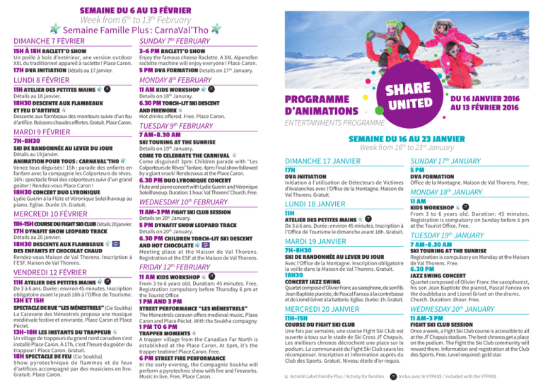 SEMAINE DU 6 AU 13 FÉVRIER Week from 6th to 13th February Semaine Famille Plus : CarnaVal’Tho DIMANCHE 7 FÉVRIER SUNDAY 7th FEBRUARY 15H À 18H RACLETT’O SHOW 3-6 PM RACLETT’O SHOW LUNDI 8 FÉVRIER MONDAY 8th FEBRUARY 11H ATELIER DES PETITES MAINS 11 AM KIDS WORKSHOP 18H30 DESCENTE AUX FLAMBEAUX 6.30 PM TORCH-LIT SKI DESCENT Un poêle à bois d’extérieur, une version outdoor XXL du traditionnel appareil à raclette ! Place Caron. 17H DVA INITIATION Détails au 17 janvier. Détails au 18 janvier. ET FEU D’ARTIFICE Descente aux flambeaux des moniteurs suivie d’un feu d’artifice. Boissons chaudes offertes. Gratuit. Place Caron. MARDI 9 FÉVRIER 7H-8H30 SKI DE RANDONNÉE AU LEVER DU JOUR Détails au 19 janvier. ANIMATION POUR TOUS : CARNAVAL’THO Venez tous déguisés ! 15h : parade des enfants en fanfare avec la compagnie les Colporteurs de rêves. 16h : spectacle final des colporteurs suivi d’un grand goûter ! Rendez-vous Place Caron ! 18H30 CONCERT DUO LYRONIQUE Lydie Guerin à la Flûte et Véronique Soleilhavoup au piano. Eglise. Durée 1h. Gratuit. MERCREDI 10 FÉVRIER Enjoy the famous cheese Raclette. A XXL Alpenofen raclette machine will enjoy everyone ! Place Caron. 5 PM DVA FORMATION Details on 17th January. Details on 18th Januray. AND FIREWORK Hot drinks offered. Free. Place Caron. TUESDAY 9th FEBRUARY 6.30 PM DUO LYRONIQUE CONCERT Flute and piano concert with Lydie Guerin and Véronique Soleilhavoup. Duration: 1 hour. Val Thorens’ Church. Free. WEDNESDAY 10 FEBRUARY th 11 AM-3 PM FIGHT SKI CLUB SESSION Details on 20 January. th Rendez-vous Maison de Val Thorens. Inscription à l’ESF. Maison de Val Thorens. VENDREDI 12 FÉVRIER Meeting place at the Maison de Val Thorens. Registration at the ESF at the Maison de Val Thorens. FRIDAY 12th FEBRUARY DU 16 JANVIER 2016 AU 13 FÉVRIER 2016 SEMAINE DU 16 AU 23 JANVIER Week from 16th to 23rd January Details on 19th January. Come disguised! 3pm: Children parade with “Les Colporteurs de Rêves” fanfare. 4pm: Final show followed by a giant snack! Rendezvous at the Place Caron. UNITED © C. Cattin / OT Val Thorens ENTERTAINMENTS PROGRAMME SKI TOURING AT THE SUNRISE 11H-15H COURSE DU FIGHT SKI CLUB Détails 20 janvier. 5 PM DYNAFIT SNOW LEOPARD TRACK 17H DYNAFIT SNOW LEOPARD TRACK Details on 20th January. Détails au 20 janvier. 6.30 PM CHILDREN TORCH-LIT SKI DESCENT 18H30 DESCENTE AUX FLAMBEAUX AND HOT CHOCOLATE DES ENFANTS ET CHOCOLAT CHAUD PROGRAMME D’ANIMATIONS 7 AM-8.30 AM COME TO CELEBRATE THE CARNIVAL SHARE DIMANCHE 17 JANVIER SUNDAY 17th JANUARY 17H 5 PM Initiation à l’utilisation de Détecteurs de Victimes d’Avalanches avec l’Office de la Montagne. Maison de Val Thorens. Gratuit. Office de la Montagne. Maison de Val Thorens. Free. DVA INITIATION DVA FORMATION MONDAY 18th JANUARY LUNDI 18 JANVIER 11 AM 11H From 3 to 6 years old. Duration: 45 minutes. Registration is compulsory on Sunday before 6 pm at the Tourist Office. Free. KIDS WORKSHOP ATELIER DES PETITES MAINS De 3 à 6 ans. Durée : environ 45 minutes. Inscription à l’Office de Tourisme le dimanche avant 18h. Gratuit. MARDI 19 JANVIER 7 AM-8.30 AM 7H-8H30 SKI TOURING AT THE SUNRISE SKI DE RANDONNÉE AU LEVER DU JOUR Avec l’Office de la Montagne. Inscription obligatoire la veille dans la Maison de Val Thorens. Gratuit. 11 AM KIDS WORKSHOP 18H30 1 PM AND 3 PM TUESDAY 19th JANUARY Registration is compulsory on Monday at the Maison de Val Thorens. Free. 6.30 PM JAZZ SWING CONCERT CONCERT JAZZ SWING De 3 à 6 ans. Durée : environ 45 minutes. Inscription obligatoire avant le jeudi 18h à l’Office de Tourisme. From 3 to 6 years old. Duration: 45 minutes. Free. Registration compulsory before Thursday 6 pm at the Tourist Office Quartet composé d’Olivier Franc au saxophone, de son fils Jean Baptiste pianiste, de Pascal Fancea à la contrebasse et de Lionel Grivet à la batterie. Eglise. Durée : 1h. Gratuit. Quartet composed of Olivier Franc the saxophonist, his son Jean Baptiste the pianist, Pascal Fancea on the doublebass and Lionel Grivet on the drums. Church. Duration: 1hour. Free. SPECTACLE DE RUE “LES MÉNESTRELS” (Cie Soukha) STREET PERFORMANCE “LES MÉNESTRELS” MERCREDI 20 JANVIER WEDNESDAY 20th JANUARY 11H-15H 11 AM-3 PM Une fois par semaine, une course Fight Ski Club est ouverte à tous sur le stade de Ski Cross JF Chapuis. Les meilleurs chronos décrochent une place sur le podium. La communauté du Fight Ski Club saura les récompenser. Inscription et information auprès du Club des Sports. Gratuit. Niveau étoile d’or requis. Once a week, a Fight Ski Club course is accessible to all at the JF Chapuis stadium. The best chronos get a place on the podium. The Fight the Ski Club community will reward them. Information and registration at the Club des Sports. Free. Level required: gold star. 11H ATELIER DES PETITES MAINS 13H ET 15H La Caravane des Ménestrels propose une musique médiévale festive et enivrante. Place Caron et Place Péclet. 13H-18H LES INSTANTS DU TRAPPEUR Un village de trappeurs du grand nord canadien s’est installé Place Caron. À 17h, c’est l’heure du goûter du trappeur ! Place Caron. Gratuit. 18H SPECTACLE DE FEU (Cie Soukha) Show pyrotechnique de flammes et de feux d’artifices accompagné par des musiciens en live. Gratuit. Place Caron. The Menestrels caravan offers medieval music. Place Caron and Place Péclet. With the Soukha compagny. 1 PM TO 6 PM TRAPPER MOMENTS A trapper village from the Canadian Far North is established at the Place Caron. At 5pm, it’s the trapper teatime! Place Caron. Free. 6 PM STREET FIRE PERFORMANCE In the early evening, the Compagnie Soukha will perform a pyrotechnic show with fire and fireworks. Music in live. Free. Place Caron. COURSE DU FIGHT SKI CLUB Activité Label Famille Plus / Activity for families FIGHT SKI CLUB SESSION Inclus avec le VTPASS / Included with the VTPASS 17H 5 PM À la découverte du ski de randonnée. Vin chaud et spécialités locales of