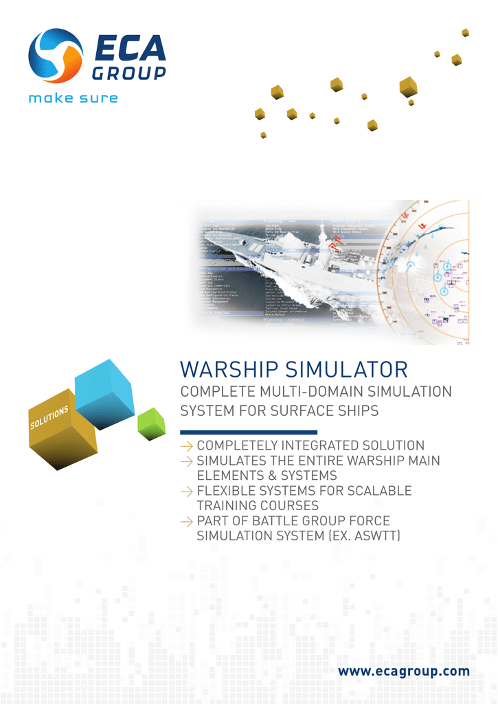 Warship Simulator COMPLETE MULTI-DOMAIN SIMULATION SYSTEM FOR SURFACE SHIPS >>COMPLETELY INTEGRATED SOLUTION >>SIMULATES THE ENTIRE WARSHIP MAIN ELEMENTS & SYSTEMS >>FLEXIBLE SYSTEMS FOR SCALABLE TRAINING COURSES >>PART OF BATTLE GROUP FORCE SIMULATION SYSTEM (Ex. ASWTT) Warship Simulator COMPLETE MULTI-DOMAIN SIMULATION SYSTEM FOR SURFACE SHIPS MODULAR SYSTEM Multiple warship simulators can be integrated in the same system for single and multi-domain complex warfare scenarios: - ASuW - ASW - AAW - Force protection - RAS/ FAS - helideck op. – etc. FREMM warship SCALABLE TRAINING The single subsystem simulators can be used independently or together for a whole platform simulation, thanks to the multisession system capability. Full Mission Bridge simulator in action System flexibility for multiple training needs REAL-TIME OPTIMIZED SYSTEM SIMULATES ALL VESSEL SYSTEMS AND SUBSISTEMS Combat System Team Trainer in action • FMSS Full Mission Shiphandling Simulator + Add-on • NCSTT Naval Combat System Team Trainer • PMSim Platform Management Simulator • SonSim Sonar Simulator Complex real-time optimized algorithms and calculation engines are used for maximum fidelity and realism. CUSTOMIZATION The systems can be provided as real-systems replica or generic interface for propaedeutics training. DATABASE SYSTEM Exhaustive DB system allow the user to fully control and manage the platforms and the environmental parameters. CIC replica system www.ecagroup.com ASIA - PACIFIC Italy Other Countries ESFE Pte. Ltd. 1 Fullerton Road Singapore 04913 Phone: +65.6408.3833 - Fax: +65.6408.3801 E-mail: [email protected] ECA Sindel VIA BUCARRI 29 16153 GENOVA - ITALY Phone: +39 010 6018828 - Fax: +39 010 6049840 E-mail: [email protected] ECA RSM Z.I. Toulon Est - 262, rue des frères Lumière 83130 La Garde - France Phone: +33 4 94 08 90 00 - Fax: +33 4 94 08 90 70 E-mail: [email protected]
