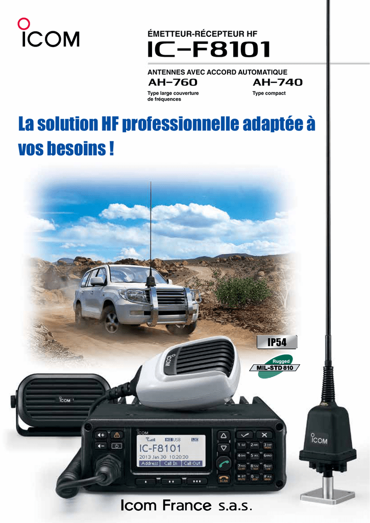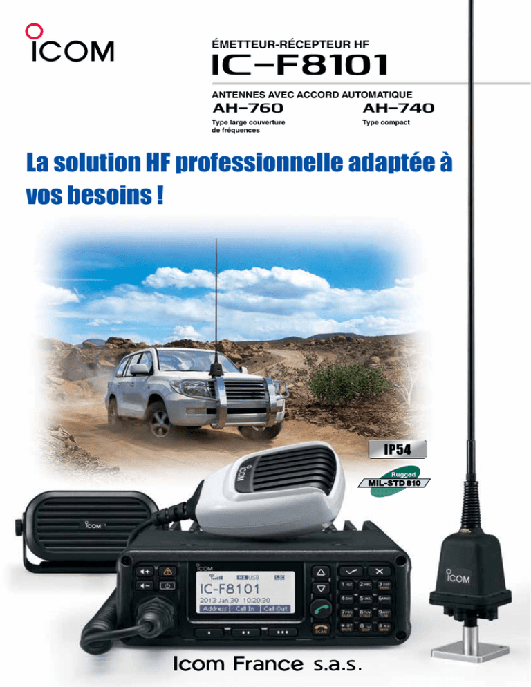 ÉMETTEUR-RÉCEPTEUR HF ANTENNES AVEC ACCORD AUTOMATIQUE Type large couverture de fréquences Type compact La solution HF professionnelle adaptée à vos besoins ! Des bases solides comme le roc : ALE (établissement automatique d'une liaison) Le protocole ALE (établissement automatique d'une liaison) est un système qui sélectionne automatiquement le meilleur canal disponible permettant d’établir une communication. Le protocole ALE permet l'interopérabilité avec les produits d'autres fabricants compatibles avec la norme FED-STD-1045A ALE. Les fonctionnalités ALE, Appel individuel, Appel réseau, Sondage et AMD (affichage automatique de message) sont disponibles. Selcall (appel sélectif) Émission puissante à 125 W* Sans ventilateur, l'IC-F8101 peut émettre à pleine puissance, 125 W en BLU sans interruption. Par contre, en transmission de données, l’émission sera limitée à 5 minutes. Cependant, en utilisant le ventilateur optionnel CFUF8100, l'IC-F8101 assure un fonctionnement en continu en phonie comme en transmission de données. Pour une utilisation dans des pays chauds il est conseillé de prévoir le bloc ventilation optionnel CFUF8100. L'IC-F8101 permet l'appel sélectif sur 4 ou 6 digits, basé sur le standard CCIR493, communément utilisé sur les réseaux HF et le Selcall 4 ou 6 digits de l’ICF8101. Le mode Selcall permet l'émission d'appels sélectifs, d'appels téléphoniques, de messages, de données de position, les appels d'urgences et les appels de test de canal. La commande STUN inhibe le fonctionnement de la radio. Ventilateur optionnel CFU-F8100 fixé sur l'arrière. Compact et robuste L’IC-F8101 utilise un boitier robuste et compact, particulièrement bien protégé des agressions extérieures éventuelles. Ventilateur optionnel CFU-F8100. Fonction BITE (auto-test intégré) L’IC-F8101 équipé du module ventilateur optionnel CFUIC-F8101 avec MB-126 optionnel. F8100 a été testé et répond à la norme MIL-STD-810-G. il est certifié IP-54. Les câbles et connecteurs utilisés répondent eux aussi à la norme IP-54. La fonctionnalité d'auto-test BITE permet de contrôler l'état de l'émetteur-récepteur. Les modes automatiques, logique, réception et émission peuvent être testés. Taille réelle ÉMETTEUR-RÉCEPTEUR Simplicité et ergonomie : Mode d'utilisation intuitif et convivial L'IC-F8101 est conçu pour être simple d'utilisation. La fonction d'accès Administrateur/Utilisateur permet de limiter les fonctions accessibles par l'utilisateur. L'administrateur peut programmer la fréquence de trafic et assigner des canaux mémoires accessibles via la face avant ou le microphone télécommande HM-192. Les fonctions spécifiques peuvent être assignées aux touches de fonctions [I], [II] et [III] : Menu principal, Menu manager, Mode réglage, Liste d'adresses Selcall, Historique RX et Historique TX. Les menus des touches de fonctions sont affichés en bas de l'écran Fonction Clear Talk La fonction Clear Talk utilise le circuit DSP pour séparer les signaux du bruit aléatoire afin de fournir un signal audio clair par simple pression sur une touche. Fonctions de coupure audio L'IC-F8101 est doté de 3 fonctions Mute (coupure audio), Squelch d'appel, Squelch de S-mètre et Squelch vocal. Le squelch d'appel permet une veille silencieuse en ouvrant le circuit de squelch uniquement à réception d'un appel sélectif ou ALE destiné à la station. Traitement numérique du signal (DSP) La technologie DSP renforce les performances de l'émetteur comme du récepteur. Le filtre numérique sur la FI offre une grande souplesse de réglage très appréciable pour le paramétrage des filtres en bande étroite. Nombreux accessoires disponibles : Connexion d'un récepteur GPS Port USB de connexion PC Connecté à un récepteur GPS externe*, l'IC-F8101 peut transmettre les données de position vers d'autres stations et afficher directement la position, l'heure, l'altitude et le cap suivi. L’IC-F8101 peut être raccordé à un PC via le port USB pour une utilisation en transmission de données (emails) Vue arrière *Compatible NMEA 0183 Version 3.01. Transmission de données Terre L’IC-F8101 peut être équipé d’un modem HF interne type RapidM TC4. Cela peut vous permettre d’émettre et de recevoir des emails. Cette fonction nécessite l’utilisation d’un PC et d’un logiciel adapté. * non fourni par Icom. Alim. CC Ventilateur Haut-parleur Coupleur d'antenne Aux USB Antenne Autres caractéristiques : • Plusieurs modes de modulation (SSB, AM, CW et DATA) • Stabilité en fréquence ±0,3 ppm (–30 ˚C à +60 ˚C) •C ouverture générale des fréquences en réception de 500 kHz à 29,999 MHz (Émission : 1,6 à 29,999 MHz) et mode VFO •P rotection en émission (haute température de l'amplificateur de puissance, RTOS élevé, batterie faible) •5 00 mémoires d'adresses Selcall, 500 mémoires d'adresses ALE •M ode d'affichage : SWR (ROS), tensions, horloge, position GPS, cap suivi et altitude Antennes avec accord automatique Type large couverture de fréquences Type compact Deux types d'antennes avec coupleur automatique ultrarapide intégré sont disponibles. AH-760, Antenne robuste avec système d'accord basé sur une self ajustable • PEP 200 W en SSB, PEP 125 W en modes CW/DONNÉES • Plage de fréquences étendue 1,6 à 29,999 MHz avec l'antenne fouet fournie • Accord d'antenne ultrarapide 350 ms (en mode mémoire d'accord) • Conforme aux normes IP68 et MIL-STD-810G AH-740, Antenne compacte avec système d'accord basé sur un ensemble de self commutées par relais • Antenne compacte avec coupleur automatique intégré, commandée par relais • Compacte et légère (3,5 kg) • Accord d'antenne ultrarapide 150 ms (en mode mémoire d'accord) • Faible consommation électrique (0,4 A typique) Kit NVIS (Option pour les antennes AH-760 et AH-740) AH-5NV Kit NVIS AH-5NV (Near Vertical Incidence Skywave - onde ionosphérique 