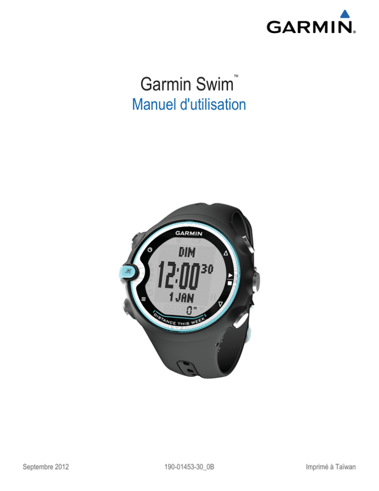 Garmin Swim ™ Manuel d'utilisation Septembre 2012 190-01453-30_0B Imprimé à Taïwan Tous droits réservés. Conformément aux lois relatives au copyright en vigueur, toute reproduction du présent manuel, qu'elle soit partielle ou intégrale, sans l'autorisation préalable écrite de Garmin, est interdite. Garmin se réserve le droit de modifier ou d'améliorer ses produits et d'apporter des modifications au contenu du présent manuel sans obligation d'en avertir quelque personne physique ou morale que ce soit. Consultez le site Web de Garmin à l'adresse www.garmin.com pour obtenir les dernières mises à jour, ainsi que des informations complémentaires concernant l'utilisation de ce produit. Garmin® et le logo Garmin sont des marques commerciales de Garmin Ltd. ou de ses filiales, déposées aux Etats-Unis d'Amérique et dans d'autres pays. Elles ne peuvent être utilisées sans l'autorisation expresse de Garmin. ANT+™, ANT Agent™, Garmin Connect™, Garmin Swim™ et clé USB ANT Stick™ sont des marques commerciales de Garmin Ltd. ou de ses filiales. Elles ne peuvent être utilisées sans l'autorisation expresse de Garmin. Table des matières Introduction.................................................................... 1 Mise en route ............................................................................. 1 Boutons ...................................................................................... 1 Icônes ........................................................................................ 1 A propos des pages d'entraînement .......................................... 1 Entraînement.................................................................. 1 Mise en pratique ........................................................................ 1 Enregistrement de la distance ................................................... 2 Entraînements avec le journal d'entraînement ........................... 2 Enraînement avec le chrono repos ............................................ 2 Alertes sonores .......................................................................... 2 Terminologie de la natation ........................................................ 2 Types de mouvement ................................................................ 2 Historique....................................................................... 2 Affichage de l'historique ............................................................. 3 Utilisation de Garmin Connect™ ................................................ 3 Transfert de l'historique vers l'ordinateur ................................... 3 Suppression de l'historique ........................................................ 3 Personnalisation de l'appareil...................................... 3 Définition de la taille de la piscine .............................................. 3 Réglage de l'heure et de la date ................................................ 3 Réglage de l'alarme ................................................................... 3 Utilisation du chronomètre ......................................................... 3 Paramètres système .................................................................. 3 Réglage de votre poids .............................................................. 4 Personnalisation d'une page d'entraînement ............................. 4 Informations sur l'appareil............................................ 4 Entretien de l'appareil ................................................................ 4 Garmin Swim Caractéristiques techniques ................................ 4 Caractéristiques de la clé USB ANT Stick ................................. 4 Remplacement de la pile ........................................................... 4 Dépannage ................................................................................ 5 Annexe............................................................................ 5 Enregistrement de l'appareil ...................................................... 5 Contrat de licence du logiciel ..................................................... 5 Index ................................................................................6 Table des matières i Introduction AVERTISSEMENT Consultez toujours votre médecin avant de commencer ou de modifier tout programme d'exercice physique. Consultez le guide Informations importantes sur le produit et la sécurité inclus dans l'emballage du produit pour prendre connaissance des avertissements et autres informations importantes sur le produit. A propos des pages d'entraînement Vous pouvez afficher cinq pages d'entraînement différentes en sélectionnant . Le point plein indique l'écran actuellement affiché. Mise en route Si vous utilisez votre Garmin Swim pour la première fois, effectuez les opérations suivantes. 1 Sélectionnez un bouton pour allumer l'appareil. 2 Suivez les instructions présentées à l'écran. et spécifiez la taille de la piscine. 3 Sélectionnez 4 Nagez (page 1). 5 Affichez l'historique (page 3). 6 Transférez l'historique vers votre ordinateur (page 3). Boutons À Á Â Ã Ä Page INTERVALLE du chrono ou du chrono repos. Page TOTAL du chrono. Page de détails. Page d'enregistrement des exercices (page 2). Page de données personnalisée (page 4). Entraînement Mise en pratique 1 Sélectionnez . Lors de la première utilisation de l'appareil, vous devez définir la taille de la piscine. Chaque fois que vous changez de piscine, vous devez en redéfinir la taille (page 3). 2 Sélectionnez pour démarrer le chrono. À Á Â Ã Ä Å Sélectionnez ce bouton pour afficher l'heure. Sélectionnez ce bouton pour faire défiler les menus et les paramètres. Sélectionnez ce bouton pour activer le rétroéclairage. Sélectionnez ce bouton pour démarrer et arrêter le chrono. Appuyez sur ce bouton pour choisir une option et pour confirmer la lecture d'un message. Sélectionnez
