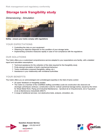 Risk management and regulatory conformity Storage tank frangibility study Dimensioning - Simulation Safety : ensure your tanks comply with regulations YOUR EXPECTATIONS Controlling the risks on your equipment Obtaining an objective diagnosis on the condition of your storage tanks Implementing corrective measures rapidly in case of non-compliance with the regulations OUR SOLUTIONS The Cetim offers you a customised comprehensive service adapted to your expectations ans facility, with a detailed report and calculation assumptions: Technical assistance for the collection of the data required for the frangibility study Finite element simulation of tank's mechanical behaviour Tanks modification proposal (frangibility, pitting, etc.) Assistance in your relationship with ministerial authorities YOUR BENEFITS The Cetim offers you an acknowledged and unchallenged expertise in the field of tanks control: 20 years' feedback on frangibility studies The Cetim is a member of the CODRES drafting committee (code de construction des résevoirs de stockage cylindriques verticaux, construction code for vertical cylindrical storage tanks), issued by the Union for Sheet Metal Work, Piping and Industrial Maintenance - Syndicat de la Chaudronnerie, de la Tuyauterie et de la Maintenance Industrielle (SNCT) A range of additional services: non-destructive tests, analysis, simulation, etc. Question Answer Service Phone 36 82 : +33 (0)3 44 67 [email protected] www.cetim.fr