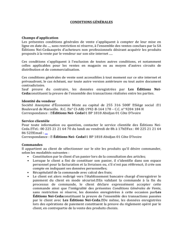 CONDITIONS GÉNÉRALES Champs d'application Les présentes conditions générales de vente s'appliquent à compter de leur mise en ligne en date du ..., sans restriction ni réserve, à l'ensemble des ventes conclues par la SA Éditions Nei-Cedaauprès d'acheteurs non professionnels désirant acquérir les produits proposés à la vente par le vendeur sur son site internet ..... Ces conditions s'appliquent à l'exclusion de toutes autres conditions, et notamment celles applicables pour les ventes en magasin ou au moyen d'autres circuits de distribution et de commercialisation. Ces conditions générales de vente sont accessibles à tout moment sur ce site internet et prévaudront, le cas échéant, sur toute autre version antérieure ou tout autre document contradictoire. Sauf preuve du contraire, les données enregistrées par Les Éditions NeiCedaconstituent la preuve de l'ensemble des transactions réalisées entre les parties. Identité du vendeur Société Anonyme d’Économie Mixte au capital de 255 316 500F Siège social : 1 Boulevard de Marseille. R.C. n° CI-ABJ-1992-B-164 178 – C.C. n° 9204 184 H Correspondance : Éditions Nei- Ceda01 BP 1818 Abidjan 01 Côte D’Ivoire Service clientèle Pour toute information ou question, contacter le service clientèle des Éditions NeiCeda. Tel.: 00 225 21 21 64 70 du lundi au vendredi de 8h à 17h Fax : 00 225 21 21 64 86 52 Email : .... Correspondance : Éditions Nei- Ceda01 BP 1818 Abidjan 01 Côte D’Ivoire Commandes Il appartient au client de sélectionner sur le site les produits qu'il désire commander, selon les modalités suivantes : • Constitution par le client d'un panier lors de la consultation des articles; • Lorsque le client a fini de constituer son panier, il s’identifie dans son espace personnel pour la facturation et la livraison ou, s’il n’est pas référencé, il crée son compte en indiquant ses données personnelles; • Récapitulatif de la commande avec calcul des frais; • Le client est alors redirigé vers l'établissement bancaire chargé d'enregistrer le paiement du client en mode sécurisé. En validant la commande à la fin du processus de commande, le client déclare expressément accepter cette commande ainsi que l'intégralité des présentes Conditions Générales de Vente, sans restriction ni réserve, les données enregistrées à cette occasion parLes Éditions Nei-Cedaconstituant la preuve de l'ensemble des transactions passées par le client avec Les Éditions Nei-Ceda. De même, les données enregistrées lors des opérations de paiement constituent la preuve du règlement opéré par le client, en contrepartie de la vente des produits choisis. Disponibilité Nos offres de produits sont expédiables sous 15 jours ouvrablesaprès réception du règlement. En cas d'indisponibilité temporaire ou définitive de produit après passation de la commande du client, nous l'en informerons par email. Le client pourra alors demander l'annulation de sa commande. L'encaissement du paiement de la commande sera effectué le jour de la commande. Les Éditions Nei-Cedadécline toute responsabilité en cas de cessation de diffusion ou de non réédition d’un ouvrage ou d’indisponibilité. Tarifs Les produits sont fournis au prix mentionné lors de l'enregistrement de la commande par le vendeur. Les prix sont exprimés en euros toutes taxes comprises. Ces prix comprennent les frais d'expédition et de transport. Toutes les commandes quelle que soit leur origine sont payables en euros. Les Éditions Nei-Cedase réserve le droit de modifier ses prix à tout moment. Les produits seront néanmoins facturés sur la base des tarifs en vigueur au moment de l'enregistrement des commandes, sous réserve de disponibilité. Les produits demeurent la propriété des Les Éditions Nei-Ceda jusqu'au complet paiement de leur prix. Une facture sera établie par le vendeur et adressée au client lors de la livraison des produits commandés. Conditions de paiement Le règlement de vos achats s'effectue en euros, par Carte Bleue, Visa, MasterCard. Votre commande sera expédiée après réception et acceptation de votre paiement. Les paiements effectués par le client ne seront considérés comme définitifs qu'après encaissement effectif par le vendeur des sommes dues. En cas de défaut de paiement par le client, de tout ou partie du prix de la commande, le vendeur se réserve, jusqu'au complet paiement, un droit de propriété sur les produits vendus, lui permettant de reprendre possession desdits produits. Droit de rétraction Le client dispose d'un délai de quinze jours francs à compter de la date de réception des produits pour les retourner s'il renonce à son achat. Le remboursement de la totalité des sommes versées par le client lors de la commande sera alors effectué au nom du client ayant passé la commande initiale par crédit de sa carte bancaire, dans un délai maximal de 30 jours suivant la date à laquelle le droit de rétractation aura été exercé. Les produits doivent être retournés dans leur emballage d’origine et en parfait état, en précisant sur le formulaire retour que le client exerce son droit de rétractation. Aucun envoi en contre-remboursement ne sera accepté, quel qu'en soit le motif. Pour toute information sur la procédure de rétractation, le client peut contacter le service clientèle des Les Éditions Nei-Ceda aux coordonnées suivantes : Tel. : 00 225 21 21 64 70 lundi au vendredi de 8h à 17h Email : ... Livraisons Les produits sont livrés à l'adresse de livraison que le client aura indiquée au cours du processus de commande. L’expédition est faite en colis express par les services privés. Sauf cas particulier, les produits commandés seront livrés en une seule fois. Le vendeur s'engage à faire ses meilleurs efforts pour livrer les produits commandés par le client dans les meilleurs délais, sans que cela ne puisse donner lieu à aucun dommage et intérêt, rete
