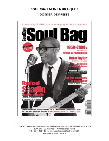 SOUL BAG ENFIN EN KIOSQUE ! DOSSIER DE PRESSE Contact : Nicolas Teurnier (Rédacteur en chef) ‐ Jacques Périn (Directeur de publication) SOUL BAG ‐ 25, rue Trézel ‐ 92300 Levallois‐Perret Tél. : 01 47 30 84 16 ‐ Courriel : soulbagmag@club‐internet.fr Site : www.soulbag.presse.fr SOMMAIRE 1. Communiqué de presse p.3 2. Un bref historique de Soul Bag p.4 3. Au sommaire de Soul Bag n°196 p.5 4. Le CD Soul Bag p.6 Communiqué de presse septembre 2009 Le magazine du blues et de la soul depuis 1968 SOUL BAG ENFIN EN KIOSQUE ! Sortie 19 septembre 2009 Voilà une décision mûrement réfléchie : après 41 ans d’existence et 195 numéros parus, Soul Bag décide de s’exposer dans les kiosques ! Avec une nouvelle maquette, toute en couleur, et une pagination augmentée, Soul Bag se fait un lifting. Le fond en revanche ne change pas. Soul Bag continuera à décliner la Great Black Music populaire dans tous ses états – blues, rhythm & blues, soul, funk, gospel, zydeco. Soul Bag n’a jamais choisi la facilité. Il a toujours privilégié les créateurs, les originators, sans exclusivité de style ou d’époque, refusant de suivre les modes forcément passagères. Aujourd’hui, il paraît en kiosque au « pire moment », aux dires des professionnels, alors que la presse magazine subit la crise de plein fouet et voit beaucoup de titres, notamment musicaux, disparaître. Le pari est bien sûr risqué, mais nous avons l’audace – ou l’inconscience – de penser que Soul Bag n’a pas son équivalent dans les linéaires des marchands de journaux et qu’un public existe qu’il n’a pas encore atteint (ou qui hésite à s’abonner). Tarif : 6 € Avec un CD de 14 titres réservé aux abonnés. Contact : Nicolas Teurnier (Rédacteur en chef) ‐ Jacques Périn (Directeur de publication) SOUL BAG ‐ 25, rue Trézel ‐ 92300 Levallois‐Perret Tél. : 01 47 30 84 16 ‐ Courriel : soulbagmag@club‐internet.fr Site : www.soulbag.presse.fr Un bref historique de Soul Bag En décembre 1968, une équipe de passionnés décide que le blues et la soul méritent mieux que les rares articles accordés par la presse jazz ou rock. Pour informer les amateurs déjà convertis et amener un nouveau public à la musique populaire afro‐américaine, il fallait une revue où il ne soit question QUE DE "ÇA" ! Les débuts ne furent pas faciles : le numéro 1 n'avait même pas de couverture imprimée, tout était "ronéoté". Ensuite, et durant huit ans, seule la couverture fut imprimée. On se souvient encore de ces pages mal encrées, à la limite du lisible. Malgré l'absence de présentation visuelle, la matière était aussi abondante et excitante qu'aujourd'hui. En octobre 1976 paraissait le premier numéro de Soul Bag entièrement imprimé, un spécial Ike & Tina Turner. La première couverture en couleurs sera réservée à une photo inédite d'Elmore James (n° 94 ‐ mai 1983). Expérience renouvelée pour le n°100 de septembre 1984 (T‐Bone Walker). Ce n'est pourtant qu'en 1991 que la couleur s'imposera définitivement sur la couverture. La PAO (publication assistée par ordinateur) est apparue dans le n° 110 (été 1987), d'abord de façon empirique, avant d'avoir recours aux services d'une maquettiste professionnelle à partir du n° 129 (hiver 1993). En 1993, Soul Bag fêtait ses 25 ans et organisait un mémorable concert au Cirque d'Hiver de Paris auquel participaient, en toute amitié, Junior Wells, Otis Grand, Mickey Baker, sans oublier Franck Ash, Benoît Blue Boy, Jean‐Jacques Milteau ou encore Patrick Verbeke. Cinq ans plus tard, c'est le New Morning qui était le cadre d'une fête réservée aux lecteurs. La fine fleur du blues français avait voulu se joindre à l'événement : les mêmes, plus Doo The Doo, les Tortilleurs, The Duo, Amar Sundy, Tao Ravo & Vincent Bucher et tous les autres, trop nombreux pour être cités. Tommy Castro et Deborah Coleman étaient aussi de la "party". A partir du numéro 182 (mars 2006), sans augmenter son prix, Soul Bag s’enrichit d’un CD qui, en 14 titres, présente un large panorama de l’actualité discographique du blues et de la soul. En 2009, après quarante ans d'existence et 195 numéros parus, Soul Bag est le plus ancien magazine musical spécialisé du monde encore en activité (avec Jefferson en Suède, né aussi en 1968). Il sort de la semi‐clandestinité de la vente par abonnement pour s’exposer au grand jour dans les kiosques ! AU SOMMAIRE DE SOUL BAG N°196 • Raphael Saadiq : Soul Pérpétuelle. Sa carrière passée au crible par Sebastian Danchin + interview spécial Oakland. • Koko Taylor 1928‐2009. Hommage à la reine du blues. • Champion Jack Dupree : Un Champion Trop Oublié. A l'occasion de la sortie d'un coffret JSP consacré à Champion Jack Dupree, Gérard Herzhaft revient sur la carrière du grand bluesman. • 1959‐2009 : Les 50 ans du Voyage Au Pays Du Blues. Retour en 15 photos rares et inédites sur le voyage pionnier de Jacques Demêtre et Marcel Chauvard. Clichés couleurs de Muddy Waters, Howlin' Wolf, John Lee Hooker... à Chicago, Detroit et New York en 1959. • Cedric Burnside & Lightnin' Malcolm : Mississippi, Années 2000. Présentation des héritiers groovy du deep blues du nord du Mississippi. • The Five Blind Boys Of Mississippi : Joyaux du Gospel Moderne. 1ère partie de l'odysée d'un groupe phare de l'histoire du gospel. • Jabo : Prince Texan. Portrait du "Texas Prince of Zydeco", chanteur‐accordéoniste de Houston. • Vick Allen : Soul Vérité. Portrait du chanteur‐producteur de Jackson, Mississippi. • Nico Wayne Toussaint : Blues Sans Frontières. Interview du chanteur‐harmoniciste à l'occasion de la sortie de son nouvel album chez Dixiefrog. Et aussi : Spencer Wiggins, Billy Lee Riley, Jim Dickinson, Nick Holt, Michael Jackson… Et plus de 200 chroniques de CD, livres et DVD. LE CD SOUL BAG Chaque trimestre, Soul Bag offre un CD à ses abonnés. Sampl