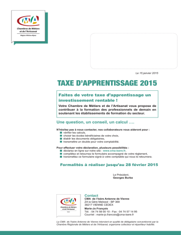 Le 15 janvier 2015 TAXE D’APPRENTISSAGE 2015 Faites de votre taxe d’apprentissage un investissement rentable ! Votre Chambre de Métiers et de l’Artisanat vous propose de contribuer à la formation des professionnels de demain en soutenant les établissements de formation du secteur. Une question, un conseil, un calcul …. N’hésitez pas à nous contacter, nos collaborateurs vous aideront pour : vérifier les calculs, choisir les écoles bénéficiaires de votre choix, établir les documents obligatoires, transmettre un double pour votre comptabilité. Pour effectuer votre déclaration, plusieurs possibilités : déclarez en ligne sur notre site : www.cma-isere.fr, complétez et retournez le formulaire accompagné de votre règlement, transmettez ce formulaire signé à votre comptable qui nous le retournera. Formalités à réaliser jusqu’au 28 février 2015 Le Président, Georges Burba Contact CMA de l’Isère Antenne de Vienne ZA la Gère Malissol - BP 369 38217 VIENNE CEDEX Isère Marie-Jo François Tél. : 04 74 58 00 10 - Fax : 04 74 57 14 95 Courriel : [email protected] La CMA de l’Isère Antenne de Vienne intervient en qualité de délégataire conventionné par la Chambre Régionale de Métiers et de l’Artisanat, organisme collecteur et répartiteur habilité. NOTICE EXPLICATIVE Seuil d’exonération Les entreprises dont la masse salariale est inférieure à 104 068 € et qui ont eu au moins UN APPRENTI en 2014 sont exonérées de la taxe. Dans ce cas très précis, vous n’avez rien à faire. Calcul de la taxe d’apprentissage MONTANT DE LA TAXE BRUTE La taxe est égale à 0,68% du montant de la masse salariale brute de l’année 2014 (données DADS). MONTANT DES CHARGES DÉDUCTIBLES Les stages en milieu professionnel des élèves et des étudiants des formations technologiques et professionnelles. •Les forfaits (limités à 3 % de la taxe d’apprentissage) applicables en ce domaine pour l’année 2014 sont fixés comme suit : Catégorie A (formations de niveaux V, IV, III) = 25 € par journée de présence de stagiaire Catégorie B (formations de niveaux II et I) = 36 € par journée de présence de stagiaire Autres charges déductibles : •Si cette rubrique vous concerne, veuillez contacter votre Chambre de Métiers et de l’Artisanat. Versements COMPOSITION DE LA TAXE La taxe se compose : •Du FRA : Fraction Régionale de l’Apprentissage, soit 51% de la taxe versée par nos soins au trésor public •Du quota : 26% de la taxe •Du barème : 23% de la taxe •L’entreprise versataire doit s’assurer que l’établissement de formation désigné est bien habilité pour recevoir la taxe d’apprentissage dans la catégorie demandée. •L’entreprise a la faculté de verser une partie des fonds hors quota à un établissement habilité SPO (Service Public de l’Orientation), sans toutefois que ce versement dépasse 26% du barème. Contribution supplémentaire à l’apprentissage (CSA) •Il s’agit d’une contribution due par les entreprises de plus de 250 salariés redevables de la taxe d’apprentissage. L’assiette de cotisation est la même que celle de la taxe d’apprentissage, 3 taux selon les effectifs d’alternants: 0.4% si alternants <1%; (0.6% pour les entreprises de plus de 2000 salariés) 0.1% si 1%<alternants <3% 0.05% si 3%<alternants < 4% Il s’agit d’un versement distinct de celui de la taxe d’apprentissage. Un reçu distinct du reçu libératoire vous sera adressé, indiquant la date de versement et le montant de la somme perçue au titre de la contribution. La Chambre Régionale de Métiers et de l’Artisanat Rhône-Alpes est habilitée à collecter la taxe d’apprentissage et la CSA. Apprentis Si vous avez un apprenti et si votre masse salariale dépasse 104 068 €, joignez votre versement au bordereau ci-joint. N’oubliez pas de compléter la partie « SI VOUS AVEZ DES APPRENTIS » cadre 4 de l’imprimé avant de nous le retourner. Le CFA fréquenté par chacun de vos apprentis percevra obligatoirement une partie de votre taxe d’apprentissage sur la base du coût défini par les listes préfectorales. Si vous souhaitez affecter votre taxe auprès de plus de quatre établissements, veuillez établir une liste sur papier libre. Formalités Les Chambres de Métiers et de l’Artisanat, sous réserve de recevoir la totalité de votre taxe : •Effectueront les versements obligatoires au Trésor Public. •Affecteront à chaque CFA accueillant vos apprentis les sommes obligatoires. •Reverseront selon vos instructions aux organismes indiqués. •Établiront le reçu. Règlement de la taxe Adressez vos règlements par chèque à l’ordre de la Chambre de Métiers et de l’Artisanat de l’Isère en arrondissant le montant à l’entier immédiatement inférieur, vous ne devez pas porter de centimes. Par délégation de la CRMA Rhône-Alpes : convention du 16/12/2003 - Avis du service régional de contrôle du : 20/11/2003 Chambre de Métiers et de l’Artisanat de l’Isère ZA la Gère Malissol - BP 369 38217 VIENNE CEDEX Marie-Jo François Tél. : 04 74 58 00 10 Fax : 04 74 57 14 95 Courriel : [email protected] Site Internet : www.cma-isere.fr Isère TAXE D’APPRENTISSAGE 2015 SUR LES SALAIRES DE 2014 (A retourner à la CMA de l’Isère Antenne de Vienne avant le 28 février 2015) 1 - Désignation de l’ entreprise Nom ou raison sociale de l’entreprise : ............................................................................................................................................. Adresse : ........................................................................................................................................................................................... ........................................................................................................................................................................................................... Code Postal