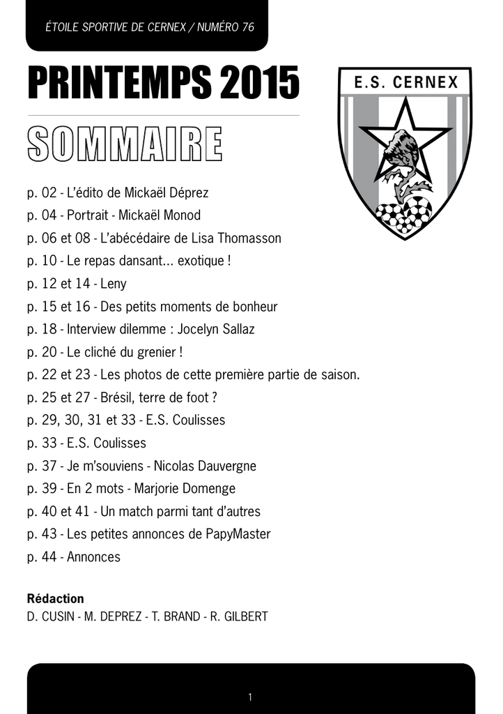 ÉTOILE SPORTIVE DE CERNEX / NUMÉRO 76 PRINTEMPS 2015 p. 02 - L’édito de Mickaël Déprez p. 04 - Portrait - Mickaël Monod p. 06 et 08 - L’abécédaire de Lisa Thomasson p. 10 - Le repas dansant... exotique ! p. 12 et 14 - Leny p. 15 et 16 - Des petits moments de bonheur p. 18 - Interview dilemme : Jocelyn Sallaz p. 20 - Le cliché du grenier ! p. 22 et 23 - Les photos de cette première partie de saison. p. 25 et 27 - Brésil, terre de foot ? p. 29, 30, 31 et 33 - E.S. Coulisses p. 33 - E.S. Coulisses p. 37 - Je m’souviens - Nicolas Dauvergne p. 39 - En 2 mots - Marjorie Domenge p. 40 et 41 - Un match parmi tant d’autres p. 43 - Les petites annonces de PapyMaster p. 44 - Annonces Rédaction D. CUSIN - M. DEPREZ - T. BRAND - R. GILBERT 1 L’édito de Mickael Deprez L’édito est habituellement utilisé pour vous présenter brièvement ce que vous allez pouvoir lire dans ce nouveau numéro du Chardon Infos. Je ne dérogerai pas à la règle pour celui-ci. Une parenthèse tout de même pour vous préciser que cet édito, sera certainement mon dernier. Après avoir supervisé les 8 derniers numéros du Chardon Infos, j’ai décidé de passer la main. Et si j’ai décidé d’écrire quelques lignes, c’est parce qu’à l’heure actuelle, aucun successeur ne s’est fait connaître… Pour la petite histoire, j’ai intégré l’équipe du « Chardon » en 2008. Noël Magnin cherchait quelqu’un pour lui suppléer à la mise en page, et Claude Philippe m’a proposé car « je savais me servir d’un ordinateur » !!! La mise en page de publication est tout de même à des années lumières de ma profession… Puis Gaby et Isa ont souhaité, à leur tour, arrêter et je me suis donc retrouvé catapulté au poste de « rédacteur en chef » du Chardon Infos. A l’heure actuelle, Thibaut Brand gère la mise en page, tandis que l’écriture est confiée majoritairement à David Cusin et Romain Gilbert. Tout ça pour dire qu’il y a quelques années, je n’aurai jamais pensé prendre de telles responsabilités puisque que je n’ai pas tellement l’esprit littéraire, ni les compétences pour mettre en page… Ce qu’il fallait démontrer, esprit cartésien oblige, c’est que le futur responsable du Chardon Infos doit certainement lire ces lignes… et ce que je souhaite lui dire, c’est de ne pas avoir peur ! Au final, c’eut été un grand regret de passer à côté d’une telle expérience ! Bref, parlons de l’E.S. Cernex ! Dans ce nouveau numéro, vous en saurez plus sur deux jolies jeunes filles de notre club, Marjorie Domenge, notre trésorière, et Lisa Thomasson, nouvelle dirigeante de l’équipe fanion. Moins mignonne et sûrement moins discret, mais terriblement efficace et volontaire, vous découvrirez le portrait de notre vice-président, Micka Monod ! Côté jeunes, nous vous parlerons du jeune Leny grâce à un très bel article d’Isa Deprez, et nous vous proposons également une nouvelle forme d’interview avec Jocelyn, qui a accepté d’être notre cobaye ! Bonne lecture à tous ! Mickaël DEPREZ 2 PUB 3 Le Portrait Mickaël Monod Micka, comme on le surnomme au club, est le gardien de l’équipe fanion. Formé à Frangy, C’est la 4ème année qu’il passe au club, où il assume désormais de sérieuses responsabilités, puisqu’il est vice-président du club depuis le début de la saison. - Comment t’es-tu retrouvé Vice-Président du club ? Ça ne se bousculait pas au portillon pour occuper ce poste, alors ça c’est fait assez naturellement; et puis j’avais bien envie de faire avancer les choses. Ça me semblait aussi naturel d’aider Christian (le président) Luc (Thomasson) et Gilles (Chaffard) (les deux autres vice-présidents) pour la conduite du club. - Qu’est-ce que cela t’apporte ? L’immense satisfaction de participer à un projet à long terme, mais aussi d’aider au renouvellement du bureau. - Quelles sont les obligations qui te pèsent ? Elles sont quand même nombreuses ! J’ai déjà de plus grandes responsabilités, qui impliquent un plus grand investissement dans les actes aussi bien que dans les paroles. Je passe aussi beaucoup plus de temps au stade, et je m’oblige à une plus grande proximité avec l’ensemble des équipes du club. - Le foot est-il une passion pour toi ? Oui, forcément, sinon je pourrais difficilement passer autant de temps au stade et m’investir pleinement dans un projet auquel je crois. La convivialité de l’E.S. Cernex motive et nourrit cette passion. - As-tu d’autres passe-temps ? La course à pied, plus particulièrement le trail, et le ski en général. - Quel est ton chanteur préféré ? Renaud, j’aime bien ses textes. C’est un chanteur engagé, ce qu’il dénonce est encore d’actualités aujourd’hui. - Un plaisir de la vie ? La solitude face à la nature. - Une qualité ? La franchise. - Un défaut ? La franchise... c’est forcément à double tranchant ! - Une devise ? L’avenir appartient à ceux qui se lèvent tôt. - Un rêve ? Partir vivre au Canada, pour découvrir un nouvel environnement. - Une peur ? Qu’il arrive quelque chose à mes frères. - Ce qui te fait rire ? Joey dans la série télévisée « Friends ». - Ce qui t’émeut ? Tout ce que mon grand frère peut m’apporter, humainement et psychologiquement. 4 - Ce qui t’énerve ? Le manque de franchise, la lâcheté. - De quoi es-tu le plus fier ? De mon père, parce qu’avec tout ce qui lui est arrivé, il s’en est toujours sorti. - Un souvenir heureux ? Des vacances à Malte avec mon frère. - Un péché mignon ? Le chocolat, notamment le Toblerone. Je pourrai en manger des kilos ! - Qu’est-ce qui passe avant tout ? La famille. - Y a-t-il quelque chose que tu changerais chez toi, dans ta vie ? Mon travail et ma façon d’être au quotidien. Apprendre à réfléchir avant de parler. Pour le coup, être vice-président m’aide bien ! - Ton idéal féminin ? Lindsey Vonn, elle est jus