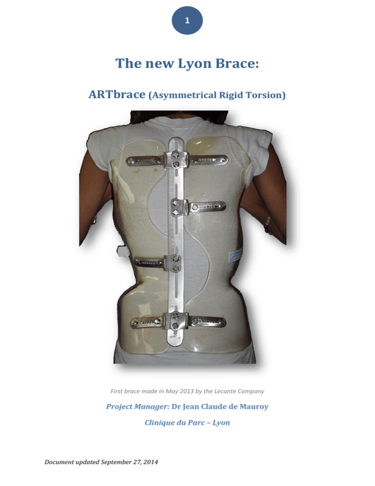1 The new Lyon Brace: ARTbrace (Asymmetrical Rigid Torsion) First brace made in May 2013 by the Lecante Company Project Manager: Dr Jean Claude de Mauroy Clinique du Parc – Lyon Document updated September 27, 2014 2 PLAN Les Auteurs Introduction Innover un art logistique Le traitement par corset de la scoliose idiopathique de l’adolescent est scientifiquement prouvé ARTbrace Development Process: Report 1 (June 16, 2014) Constitution de l’équipe de développement / équipe produit Développement du concept puis du prototype de produit Product design Test pilote – Feasability Analysis Modélisation Rappel Mathématique : Colonne Torse Biomécanique Bases biomécaniques : Degrés de Liberté, mouvements… Les mouvements couplés ou lois de Harrison Fryette (1954) Rappel biomécanique des principales orthèses existantes La détorsion, caractéristique de l’ARTbrace Rachimétrie Informatisée Dynamique Principe Réalisation pratique Etude préliminaire par calques Superposition des formes OrtenShape En fonction des formes cliniques Description de l’ARTbrace Résultats Test pilote In-brace correction (200 cas) Résultats à 6 mois Discussion Revue de la littérature Innovations et avantages Les questions à se poser Market Strategy Conclusions Annexe 1 : Caractéristiques du polycarbonate Document updated September 27, 2014 3 Principe de détorsion en clef pour une scoliose à double courbure Les auteurs Document updated September 27, 2014 4 Le Dr Jean Claude de Mauroy de Curière de Castelnau est né à Lyon le 6 novembre 1947. Il passe sa thèse en 1974 : « Contribution à l’étude des scolioses infantiles » sous la Direction de Pierre Stagnara et de Claude Régis Michel. Au cours de son service militaire en 1975, au Centre de Recherche du Service de Santé des Armées – division de psychologie Lyon, il est confronté à la statistique et à l’informatique. En 1978, il devient chef de service de l’un des 2 services enfants du Centre des Massues (36 lits) et du service des externes, il est également responsable du service documentation. Il participera à de nombreux travaux scientifiques concernant les déviations vertébrales. En 1987, il fonde avec Charles Picault le Centre Lyonnais de la Colonne vertébrale qui deviendra par la suite le Centre Européen de la Colonne Vertébrale. Il en assume toujours la présidence. Il est spécialiste en : - Médecine Physique et Rééducation Fonctionnelle, - Médecine du Sport, - Biomécanique de l’appareil locomoteur, - Exploration fonctionnelle de l’appareil locomoteur (électromyographie) - Médecine Manuelle, Ostéopathie En 1975 il devient chargé de cours à l’Université Claude Bernard Lyon 1. A l’institut Technique de Réadaptation il participe à l’enseignement de l’orthopédie segmentaire et rachidienne, de l’appareillage orthétique et de la radiologie ostéo-articulaire. A la Faculté de Pharmacie de Lyon, et il participe à l’enseignement des orthèses du tronc dans la cadre du diplôme de petit appareillage A l’institut des Sciences et Techniques de l’ingénieur “Politechnique Lyon”, il enseigne la biomécanique du rachis. En 1985 il participe avec Remy Kohler et Jean Riondet à la réalisation d‘un premier capteur optique destiné à la fabrication des orthèses du tronc. Le premier capteur 3D de Quantel aboutira après 20 ans de recherche et développement (contrat n° A9301027v00 de l’Agence Nationale de valorisation de la recherche) au capteur full 3D instantané actuel d’ORTEN. En 2012, il devient Président de la SOSORT (International Society on Scoliosis Orthopaedic and Rehabilitation Treatment) et membre du bureau du Groupe d’Etudes de la Scoliose GES En 2013, il est nommé membre d’honneur de l’Association de patients scoliotiques “Scoliose et Partage” Document updated September 27, 2014 5 Jean Marc Ginoux, Maître de conférences (H.D.R.), Docteur en Mathématiques et Docteur en Histoire des Sciences est le co-auteur des bases mathématiques et biomécaniques de la réalisation de l’ART brace. Il a poursuivi ses recherches dans le cadre du Département de Génie Mécanique et Productique de l’Université Pierre & Marie Curie (Paris VI) et de l’Institut de Mathématiques de Jussieu. Il enseigne actuellement à l’Université du Sud en Génie Mécanique Productique (IUT de Toulon) En 2005, il devient Ph-D en Mathématique Appliquées, Université du Sud, Laboratoire PROTEE [ Thèse : Stabilité des systèmes dynamiques chaotiques et variétés singulières] En 2008, il acquiert l’accréditation pour superviser la recherche en Mathématiques Appliquées, Université du Sud, Laboratoire PROTEE En 2011, il devient Ph-D en Histoire des Sciences (2011), Université Pierre & Marie Curie, Paris VI, Institut de Mathématiques de Jussieu et Senior lecturer in Mathematics at Mechanics Engineering department [thèse : Analyse mathématique des phénomènes oscillatoires non linéaires : le carrefour français (1880-1940)] En 2012, il collabore avec le Dr de Mauroy à l’application de la théorie du chaos pour les scolioses idiopathiques de moins de 20°. Passionné de Mathématiques et d’histoire, il publie avec Ch Gerini en 2012 : « Henri Poincaré : une biographie au(x) quotidien(s) » Il développe en outre avec Centre Hospitalier de Toulon La Seyne (CHITS) quatre axes de recherches : - détection sans contact des apnées du sommeil et analyse de la fragmentation du sommeil - mesure de la pression veineuse centrale par analyse d'images échographiques - modélisation de l'évolution de la glycémie de patients insulino-dépendants - analyse et traitement du signal de potentiel évoqués Document updated September 27, 2014 6 L’Association « Scoliose et Partage » est née en octobre 2005 pour le partage des expériences, de la douleur, de la maladie, des bonnes et mauvaises nouvelles, du soutien et diverses démarches pour les droits des patients. Elle est 