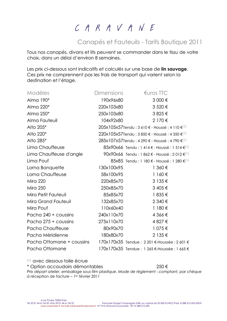 C A R A V A N E Canapés et Fauteuils - Tarifs Boutique 2011 Tous nos canapés, divans et lits peuvent se commander dans le tissu de votre choix, dans un délai d’environ 8 semaines. Les prix ci-dessous sont indicatifs et calculés sur une base de lin sauvage. Ces prix ne comprennent pas les frais de transport qui varient selon la destination et l’étage. Modèles Alma 190* Alma 220* Alma 250* Alma Fauteuil Alto 205* Alto 220* Alto 285* Lima Chauffeuse Lima Chauffeuse d'angle Lima Pouf Lorna Banquette Lorna Chauffeuse Mira 220 Mira 250 Mira Petit Fauteuil Mira Grand Fauteuil Mira Pouf Pacha 240 + coussins Pacha 275 + coussins Pacha Chauffeuse Pacha Méridienne Pacha Ottomane + coussins Pacha Ottomane Dimensions €uros TTC 190x96x80 3 000 € 220x103x80 3 520 € 250x103x80 3 825 € 104x92x80 2 170 € 205x105x57Tendu : 3 610 € - Houssé : 4 110 €(1) 220x105x57Tendu : 3 850 € - Houssé : 4 350 €(1) 285x107x57Tendu : 4 290 € - Houssé : 4 790 €(1) 85x90x66 Tendu : 1 414 € - Houssé : 1 514 €(1) 90x90x66 Tendu : 1 862 € - Houssé : 2 012 €(1) 85x85 Tendu : 1 180 € - Houssé : 1 280 €(1) 130x100x95 1 360 € 58x100x95 1 160 € 220x85x70 3 135 € 250x85x70 3 405 € 85x85x70 1 835 € 132x85x70 2 340 € 110x60x40 1 180 € 240x110x70 4 366 € 275x110x70 4 827 € 80x90x70 1 075 € 180x80x70 2 135 € 170x170x35 Tendue : 2 201 €-Houssée : 2 601 € 170x170x35 Tendue : 1 265 €-Houssée : 1 665 € (1) avec dessous toile écrue * Option accoudoirs démontables 250 € Prix départ atelier, emballage sous film plastique. Mode de règlement : comptant, par chèque à réception de facture – 1er février 2011 6 rue Pavée 75004 Paris Tel 33 01 44 61 04 20 •Fax 33 01 44 61 04 22 Françoise Dorget Compagnie SARL au capital de 50 000 Frs•RCS Paris B 388 312 696 00031 www.caravane.fr •e-mail [email protected] N° TVA Intracommunautaire : FR 13 388 312 696 C A R A V A N E Canapés et Fauteuils - Tarifs Boutique 2011 Modèles Dimensions €uros TTC Pour la collection Poppi et sa couette, le prix est calculé en lin Luni, tissu recommandé pour ce modèle : Poppi 200 Poppi 220 Poppi 240 Poppi méridienne Poppi Fauteuil 130 Poppi Fauteuil 70 Poppi Pouf 120 Poppi Pouf 80 Couette Poppi 200 Couette Poppi 220 Couette Poppi 240 Couette Poppi méridienne Couette Poppi Fauteuil 130 Couette Poppi Fauteuil 70 Couette Poppi Pouf 120 Couette Poppi Pouf 80 Rhéa Fauteuil Sloane 180 Sloane 235 Stella Canapé 170 Stella Canapé 220x90 Stella Canapé 220x105 Stella Méridienne 180 Stella Méridienne 210 Stella Méridienne d'angle Stella Retour d'angle Stella Fauteuil Stella Pouf Sita Pouf 200x80x60 220x80x60 240x80x60 180x80x75 130x80x60 70x70x60 120x60x38 80x80x38 330x72 350x72 370x72 310x80 260x72 200x62 160x80 120x80 3 087 € 3 242 € 3 470 € 2 467 € 2 395 € 1 802 € 1 092 € 915 € 661 € 743 € 765 € 617 € 524 € 332 € 332 € 239 € 120x103x80 180x95x76 235x95x76 170x90x70 220x90x70 220x105x70 180x90x70 210x105x70 230x105x70 170x105x70 75x75x57 75x75x40 140x120 2 355 € 3 890 € 4 402 € 3 280 € 3 795 € 3 845 € 3 250 € Tendu : 3 590 €-Houssé : 3 990 €(1) 3 760 € 2 710 € 1 835 € 975 € 385 € Prix départ atelier, emballage sous film plastique. Mode de règlement : comptant, par chèque à réception de facture – 12 Mai 2011 6 rue Pavée 75004 Paris Tel 33 01 44 61 04 20 •Fax 33 01 44 61 04 22 Françoise Dorget Compagnie SARL au capital de 50 000 Frs•RCS Paris B 388 312 696 00031 www.caravane.fr •e-mail [email protected] N° TVA Intracommunautaire : FR 13 388 312 696 C A R A V A N E Canapés et Fauteuils - Tarifs Boutique 2011 Modèles Thala 180x90* Thala 220x90* Thala 220x105* Thala 250x105* Thala chauffeuse Victor 190* Victor 220* Victor 270* Victor Fauteuil Vizir divan houssé 200 Vizir divan houssé 250 Vizir divan houssé 275 Vizir divan houssé 300 Dimensions €uros TTC 180x90x70 Tendu : 3 325 €-Houssé : 3 725 €(1) 220x90x70 Tendu : 3 705 €-Houssé : 4 155 €(1) 220x105x70 Tendu : 3 805 €-Houssé : 4 255 €(1) 250x105x70 Tendu : 4 125 €-Houssé : 4 575 €(1) 85x90x70 Tendu : 1 620 €-Houssé : 1 820 €(1) 220x103x80Tendu : 3 695 €-Houssé : 4 195 €(1) 220x103x80Tendu : 3 850 €-Houssé : 4 350 €(1) 270x103x80Tendu : 4 495 €-Houssé : 5 045 €(1) 104x96x80 2 402 € 200x110x70 3 793 € 250x110x70 4 277 € 275x110x70 4 547 € 300x110x70 4 881 € Prix départ atelier, emballage sous film plastique. Mode de règlement : comptant, par chèque à réception de facture – 1er février 2011 6 rue Pavée 75004 Paris Tel 33 01 44 61 04 20 •Fax 33 01 44 61 04 22 Françoise Dorget Compagnie SARL au capital de 50 000 Frs•RCS Paris B 388 312 696 00031 www.caravane.fr •e-mail [email protected] N° TVA Intracommunautaire : FR 13 388 312 696