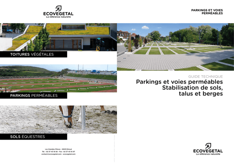 PARKINGS ET VOIES PERMÉABLES TOITURES VÉGÉTALES GUIDE TECHNIQUE Parkings et voies perméables Stabilisation de sols, talus et berges SOLS ÉQUESTRES Les Grandes Pièces - 28410 Broué Tél. : 02 37 43 18 56 - Fax : 02 37 43 16 97 [email protected] - ecovegetal.com GUIDE PP - Version 3 – 05/206 - Crédits photos : © Ecovegetal PARKINGS PERMÉABLES SOMMAIRE ECOVEGETAL: LA RÉFÉRENCE NATURELLE DE SON MÉTIER 4 I. PARKINGS PERMÉABLES ECOVEGETAL 1. Parking perméable selon ECOVEGETAL 6 2. Engazonné à usage modéré: ECOVEGETAL GREEN 8 3. Engazonné à usage modéré: ECOVEGETAL GREEN MERIDIO 10 4. Végétal à usage intensif: ECOVEGETAL MOUSSES 12 5. Minéral à usage intensif: ECOMINERAL 14 6. Pavé à usage intensif: ECOVEGETAL PAVÉ 16 7. Dalles alvéolaires béton 18 8. Pavés béton 19 9. Places PMR 20 10. Véhicules électriques 21 II. AUTRES SOLUTIONS NOTRE AMBITION, Faire naître sur les toits, les terrasses et les parkings, de nouveaux jardins pour que la ville respire. 1. Voie pompier 22 2. Délimitations de places et calepinage 24 3. Noues drainantes 26 4. Stabilisation de talus 28 5. Système anti-érosion 29 6. Liaisons douces 30 7. Sols équestres 32 III. PRODUITS 1. Dalles ECORASTER Pierre GEORGEL Président 2 36 2. Applications 38 3. Accessoires 40 4. Substrats 41 VI. TABLEAU COMPARATIF DES SYSTÈMES 42 3 ECOVEGETAL LA RÉFÉRENCE NATURELLE DE SON MÉTIER NOS POINTS FORTS DEPUIS 15 ANS, ECOVEGETAL est la référence naturelle des professionnels pour la végétalisation des toitures, des parkings et la stabilisation des sols. ECOVEGETAL, une entreprise qui s’engage pour protéger et valoriser. Notre métier est d’assembler et de faire pousser des végétaux sur les toits, les parkings ou les terrasses, afin de créer un espace vert ou un sol stable et perméable. Ainsi, en quelques années, ECOVEGETAL, très impliqué dans sa profession, est devenu un acteur majeur de la gestion ECOVEGETAL, une entreprise française, européenne et responsable. de l’eau à la parcelle pour les collectivités locales et les professionnels. ECOVEGETAL maîtrise la totalité des savoir-faire et des moyens nécessaires à ses interventions. L’entreprise, dont le siège social est installé à Broué, au coeur de la campagne française, commercialise ses produits partout en ECOVEGETAL, un acteur majeur de la gestion de l’eau à la parcelle. Europe, soit directement, soit par des filiales ou des partenariats. Elle possède également une antenne de commercialisation au Maroc. Sa vocation est d’exporter partout ses compétences et ses produits. Les dirigeants et fondateurs sont agriculteur, architectepaysagiste et industriel. Francis Pelletier, Pierre Georgel, Jürgen Manzei. UN PROFESSIONNEL QUI S’ENGAGE POUR PROTÉGER ET VALORISER PURUS: TRADITION ET PROGRÈS, UNE COMBINAISON IMBATTABLE Profondément ancrées dans l’histoire de l’entreprise, Du recyclage au développement de produits innovants Les partagées par les femmes et les hommes qui chaque jour y en polyéthylène basse densité, PURUS bénéficie d’une ECOVEGETAL les ont réunies il y a plus de 15 ans. Une travaillent, nos valeurs sont: expérience reconnue dans le Monde. Cette société familiale collaboration qui ne cesse de se développer au fil des • Le respect de la nature. L’écologie est notre socle et la créée en 1994, met tout son savoir-faire au service de années et des projets. raison de nos actions; l’innovation. • • valeurs communes des sociétés PURUS et Le respect des valeurs humaines. L’honnêteté, la franchise, la transparence, l’équité et l’égalité sont les Les produits PURUS, en polyéthylène basse densité issus cinq valeurs qui nous réunissent; du recyclage du plastique, sont certifiés neutres pour Le respect des autres. L’accueil de ceux qui nous l’environnement. rejoignent, la transmission des droits mais aussi des devoirs, la volonté de travailler ensemble et d’y prendre Dans sa démarche de protection de l’environnement, du plaisir. PURUS a développé des dalles alvéolaires ECORASTER Depuis sa création, ECOVEGETAL inscrit son action dans utilisées pour la stabilisation de sols: parkings perméables, une démarche de développement durable et de Haute stabilisation de sols et sols équestres. Qualité Environnementale (HQE). Ses produits et ses L’imperméabilisation des sols a des effets dévastateurs méthodes de production permettent de préserver l’eau, de pour l’environnement. Il est aujourd’hui vital d’augmenter recycler les matériaux, de limiter la production des déchets les surfaces d’espaces verts, permettant ainsi l’infiltration et d’harmoniser les bâtiments avec leur environnement. et l’évaporation de l’eau en milieu urbain. 4 5 ECOVEGETAL PARKING PERMÉABLE SELON ECOVEGETAL NOS POINTS FORTS CHOIX D’UN SYSTÈME PERMÉABLE ECOVEGETAL Deux paramètres importants définissent la fréquence d’occupation d’un parking végétalisé et conditionnent le choix du système. infiltration des eaux pluviales Le nombre de rotations sur un parking au cours de la journée est un facteur à prendre en compte pour la mise en place d’un parking ECOVEGETAL GREEN. Le système ECOVEGETAL MOUSSES est une solution intermédiaire aspect naturel utilisant des végétaux moins exigeants en eau et plus résistants au piétinement. Le taux de couverture de la végétation rasante pourra varier de 20% à 80% La durée quotidienne de stationnement est aussi à prendre en compte. Le parking végétalisé doit être libéré résistance aux UV un certain nombre d’heures dans la journée et le weekend pour permettre aux végétaux de se développer. véhicules légers poids lourds SERVICES ET PRESTATIONS RECHERCHE, DÉVELOPPEMENT, INNOVATION ECOVEGETAL investit dans la recherche autour de 3 axes: les solutions de gestion des eaux de pluie à la parcelle, la biodiversité et la richesse végétale, l’irrigation raisonnée. AIDE À LA CO