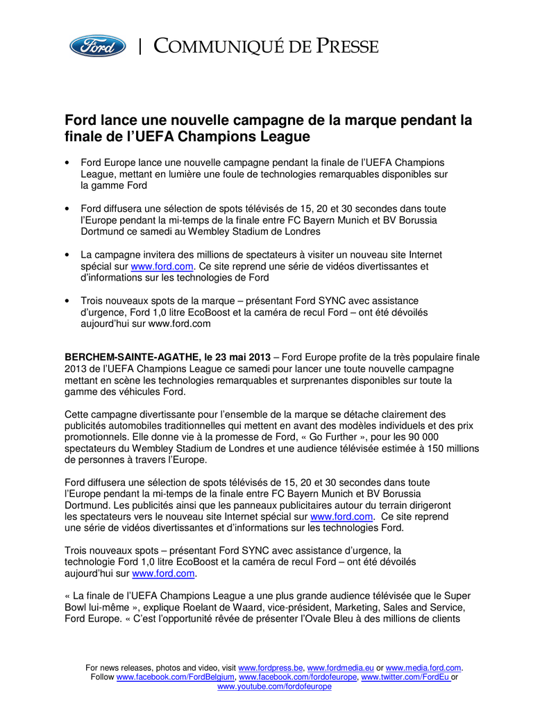 COMMUNIQUÉ DE PRESSE Ford lance une nouvelle campagne de la marque pendant la finale de l’UEFA Champions League • Ford Europe lance une nouvelle campagne pendant la finale de l’UEFA Champions League, mettant en lumière une foule de technologies remarquables disponibles sur la gamme Ford • Ford diffusera une sélection de spots télévisés de 15, 20 et 30 secondes dans toute l’Europe pendant la mi-temps de la finale entre FC Bayern Munich et BV Borussia Dortmund ce samedi au Wembley Stadium de Londres • La campagne invitera des millions de spectateurs à visiter un nouveau site Internet spécial sur www.ford.com. Ce site reprend une série de vidéos divertissantes et d’informations sur les technologies de Ford • Trois nouveaux spots de la marque – présentant Ford SYNC avec assistance d’urgence, Ford 1,0 litre EcoBoost et la caméra de recul Ford – ont été dévoilés aujourd’hui sur www.ford.com BERCHEM-SAINTE-AGATHE, le 23 mai 2013 – Ford Europe profite de la très populaire finale 2013 de l’UEFA Champions League ce samedi pour lancer une toute nouvelle campagne mettant en scène les technologies remarquables et surprenantes disponibles sur toute la gamme des véhicules Ford. Cette campagne divertissante pour l’ensemble de la marque se détache clairement des publicités automobiles traditionnelles qui mettent en avant des modèles individuels et des prix promotionnels. Elle donne vie à la promesse de Ford, « Go Further », pour les 90 000 spectateurs du Wembley Stadium de Londres et une audience télévisée estimée à 150 millions de personnes à travers l’Europe. Ford diffusera une sélection de spots télévisés de 15, 20 et 30 secondes dans toute l’Europe pendant la mi-temps de la finale entre FC Bayern Munich et BV Borussia Dortmund. Les publicités ainsi que les panneaux publicitaires autour du terrain dirigeront les spectateurs vers le nouveau site Internet spécial sur www.ford.com. Ce site reprend une série de vidéos divertissantes et d’informations sur les technologies Ford. Trois nouveaux spots – présentant Ford SYNC avec assistance d’urgence, la technologie Ford 1,0 litre EcoBoost et la caméra de recul Ford – ont été dévoilés aujourd’hui sur www.ford.com. « La finale de l’UEFA Champions League a une plus grande audience télévisée que le Super Bowl lui-même », explique Roelant de Waard, vice-président, Marketing, Sales and Service, Ford Europe. « C’est l’opportunité rêvée de présenter l’Ovale Bleu à des millions de clients For news releases, photos and video, visit www.fordpress.be, www.fordmedia.eu or www.media.ford.com. Follow www.facebook.com/FordBelgium, www.facebook.com/fordofeurope, www.twitter.com/FordEu or www.youtube.com/fordofeurope européens en tant que marque qui offre de merveilleuses voitures avec des technologies remarquables qui rendent la vie plus simple, plus sûre et plus drôle. » Les visiteurs de www.ford.com via un ordinateur, un smartphone ou une tablette découvriront une page d’accueil au nouveau look, avec un menu déroulant reprenant les technologies intelligentes, sûres et écologiques de Ford. En sélectionnant une technologie, ils en découvriront tous les avantages ainsi que des vidéos spécialement créées. Celles-ci seront à la base des spots télévisés de Ford en Europe pendant la coupure publicitaire à la mi-temps de la finale de l’UEFA Champions League. Parallèlement, Ford déploiera de nouvelles affiches et publicités extérieures en Europe. « Cette nouvelle campagne met sérieusement l’accent sur l’aspect numérique et social – partant des deux expériences télévisées que nous espérons procurer aux clients lors de la finale, en allant jusqu’à une conversation plus vaste dans les médias sociaux où nous demanderons aux gens de partager leurs idées des technologies de rêve pour les voitures de l’avenir », explique R. de Waard. Spots : Ford SYNC avec assistance d’urgence : http://youtu.be/6-PHYYMa61A 1.0 litre EcoBoost : http://youtu.be/VcKd-OUVXFA Caméra de recul Ford : http://youtu.be/sPjgIMnmbHA ### About Ford Motor Company Ford Motor Company, a global automotive industry leader based in Dearborn, Mich., manufactures or distributes automobiles across six continents. With about 175,000 employees and 65 plants worldwide, the company’s automotive brands include Ford and Lincoln. The company provides financial services through Ford Motor Credit Company. For more information regarding Ford and its products worldwide, please visit www.ford.com. Ford of Europe is responsible for producing, selling and servicing Ford brand vehicles in 50 individual markets and employs approximately 47,000 employees at its wholly owned facilities and approximately 69,000 people when joint ventures and unconsolidated businesses are included. In addition to Ford Motor Credit Company, Ford of Europe operations include Ford Customer Service Division and 24 manufacturing facilities (15 wholly owned or consolidated joint venture facilities and nine unconsolidated joint venture facilities). The first Ford cars were shipped to Europe in 1903 – the same year Ford Motor Company was founded. European production started in 1911. Ford in Belgium & Luxemburg Ford Belgium (Brussels) distributes Ford vehicles and Ford original parts in Belgium & Luxemburg, since 1922. Ford Genk produces all large cars (Mondeo, S-MAX, Galaxy) for Ford in Europe, with 4.300 employees. Ford Lommel Proving Ground is the lead test facility for validation of all Ford models in Europe, with 350 employees. Contact(s): Jo Declercq +32 (2) 482 21 03 [email protected] Arnaud Henckaerts +32 (2) 482 21 05 [email protected] 2 For news releases, photos and video, visit www.fordpers.be, www.fordmedia.eu or www.media.ford.com. Follow www.facebook.com/fordofeurope, www.twitter.com/FordEu or www.youtube.com/fordofeurope