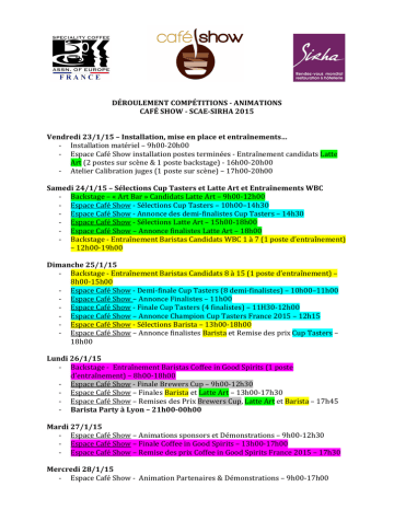 DÉROULEMENT COMPÉTITIONS - ANIMATIONS CAFÉ SHOW - SCAE-SIRHA 2015 Vendredi 23/1/15 – Installation, mise en place et entraînements… -‐ Installation matériel – 9h00-‐20h00 -‐ Espace Café Show installation postes terminées -‐ Entraînement candidats Latte Art (2 postes sur scène & 1 poste backstage) -‐ 16h00-‐20h00 -‐ Atelier Calibration juges (1 poste sur scène) – 17h00-‐20h00 Samedi 24/1/15 – Sélections Cup Tasters et Latte Art et Entraînements WBC -‐ Backstage – « Art Bar » Candidats Latte Art – 9h00-‐12h00 -‐ Espace Café Show -‐ Sélections Cup Tasters – 10h00–14h30 -‐ Espace Café Show -‐ Annonce des demi-‐finalistes Cup Tasters – 14h30 -‐ Espace Café Show -‐ Sélections Latte Art – 15h00-‐18h00 -‐ Espace Café Show – Annonce finalistes Latte Art – 18h00 -‐ Backstage -‐ Entraînement Baristas Candidats WBC 1 à 7 (1 poste d’entraînement) – 12h00-‐19h00 Dimanche 25/1/15 -‐ Backstage -‐ Entraînement Baristas Candidats 8 à 15 (1 poste d’entraînement) – 8h00-‐15h00 -‐ Espace Café Show -‐ Demi-‐finale Cup Tasters (8 demi-‐finalistes) – 10h00–11h00 -‐ Espace Café Show – Annonce Finalistes – 11h00 -‐ Espace Café Show -‐ Finale Cup Tasters (4 finalistes) – 11H30-‐12h00 -‐ Espace Café Show – Annonce Champion Cup Tasters France 2015 – 12h15 -‐ Espace Café Show -‐ Sélections Barista – 13h00-‐18h00 -‐ Espace Café Show – Annonce finalistes Barista et Remise des prix Cup Tasters – 18h00 Lundi 26/1/15 -‐ Backstage -‐ Entraînement Baristas Coffee in Good Spirits (1 poste d’entraînement) – 8h00-‐18h00 -‐ Espace Café Show -‐ Finale Brewers Cup – 9h00-‐12h30 -‐ Espace Café Show – Finales Barista et Latte Art – 13h00-‐17h30 -‐ Espace Café Show – Remises des Prix Brewers Cup, Latte Art et Barista – 17h45 -‐ Barista Party à Lyon – 21h00-00h00 Mardi 27/1/15 -‐ Espace Café Show – Animations sponsors et Démonstrations – 9h00-‐12h30 -‐ Espace Café Show – Finale Coffee in Good Spirits – 13h00-‐17h00 -‐ Espace Café Show – Remise des prix Coffee in Good Spirits France 2015 – 17h30 Mercredi 28/1/15 -‐ Espace Café Show -‐ Animation Partenaires & Démonstrations – 9h00-‐17h00