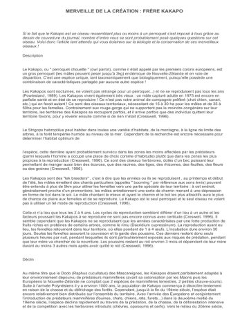 MERVEILLE DE LA CRÉATION : FRÈRE KAKAPO Si le fait que le Kakapo est un oiseau ressemblant plus ou moins à un perroquet s’est imposé à tous grâce au dessin de couverture du journal, nombre d’entre vous se sont probablement posé quelques questions sur cet oiseau. Voici donc l’article tant attendu qui vous éclairera sur la biologie et la conservation de ces merveilleux oiseaux ! Description Le Kakapo, ou " perroquet chouette " (owl parrot), comme il était appelé par les premiers colons européens, est un gros perroquet (les mâles peuvent peser jusqu’à 3kg) endémique de Nouvelle-Zélande et en voie de disparition. C’est une espèce unique, tant taxonomiquement que biologiquement, puisqu’elle possède une combinaison de caractéristiques partagée par aucune autre espèce ! Les Kakapos sont nocturnes, ne volent pas (étrange pour un perroquet...) et ne se reproduisent pas tous les ans (Powlesland, 1989). Les Kakapos vivent également très vieux : un mâle capturé adulte en 1975 est encore en parfaite santé et en état de se reproduire ! Ce n’est pas votre animal de compagnie préféré (chat chien, canari, etc.) qui en ferait autant ! Ce sont des oiseaux territoriaux, nécessitant de 15 à 30 ha pour les mâles et de 35 à 50ha pour les femelles. Contrairement aux rouge-gorge qui ne supportent pas le moindre congénère sur leur territoire, les territoires des Kakapos se recoupent parfois, et il arrive parfois que des individus quittent leur territoire favoris, pour y revenir ensuite comme si de rien n’était (Cresswell, 1996). Le Strigops habroptilus peut habiter dans toutes une variété d’habitats, de la montagne, à la ligne de limite des arbres, à la forêt tempérée humide au niveau de la mer. Cependant de la recherche est encore nécessaire pour déterminer l’habitat optimum de l’espèce, cette dernière ayant probablement survécu dans les zones les moins affectées par les prédateurs (parmi lesquels l’homme a occupé une place de choix comme d’habitude) plutôt que dans les zones les plus propices à la reproduction (Cresswell, 1996). Ce sont des oiseaux herbivores, dotés d’un bec puissant leur permettant de manger aussi bien des écorces, que des racines, des tiges, des rhizomes, des feuilles, des fleurs ou des graines (Cresswell, 1996). Les Kakapos sont des "lek breeders" , c’est à dire que les années ou ils se reproduisent , au printemps et début de l’été, les mâles émettent des chants particuliers (appelés " booming " par référence aux sons émis) pouvant être entendu à plus de 5km pour attirer les femelles vers une partie spéciale de leur territoire : à cet endroit, généralement proche d’un promontoire, les mâles entretiennent une sorte de chemin menant à une dépression en forme de bol dans le sol. Le mâle chantant le mieux et ayant le chemin et le bol les plus attractifs aura le plus de chance de plaire aux femelles et de se reproduire. Le Kakapo est le seul perroquet et le seul oiseau ne volant pas à utiliser un tel mode de reproduction (Cresswell, 1996). Celle-ci n’a lieu que tous les 2 à 5 ans. Les cycles de reproduction semblent différer d’un lieu à un autre et les facteurs poussant les Kakapos à se reproduire ne sont pas encore connus avec certitude (Creswell, 1996). Il semble cependant que les Kakapos ne se reproduisent que les années caractérisées par une forte production de fruits riches en protéines de certains arbres, comme le rimu (Dacridium cupressinum). La reproduction ayant eu lieu, les femelles retournent dans leur territoire, où elles pondent de 1 à 4 œufs. L’incubation dure environ 30 jours. Seules les femelles assurent la couvaison et la garde des poussins. Ces derniers restent donc seuls plusieurs heures par nuit, pendant lesquelles ils sont particulièrement exposés aux risques de prédation, pendant que leur mère va chercher de la nourriture. Les poussins restent au nid environ 3 mois et dépendent de leur mère durant au moins 3 autres mois après avoir quitté le nid (Cresswell, 1996). Déclin Au même titre que le Dodo (Raphus cucullatus) des Mascareignes, les Kakapos étaient parfaitement adaptés à leur environnement dépourvu de prédateurs mammifères (avant sa colonisation par les Maoris puis les Européens la Nouvelle-Zélande ne comptait que 2 espèces de mammifères terrestres, 2 petites chauve-souris). Suite à l’arrivée Polynésiens il y a environ 1000 ans, la population de Kakapo commença à décroître lentement en raison de la chasse et du défrichage des forêts. Cependant, jusqu’à la fin du 19ème siècle, l’espèce était encore relativement bien distribuée sur l’ensemble du territoire. Avec l’arrivée des Européens et conjointement l’introduction de prédateurs mammifères (fouines, chats, chiens, rats, furets...) dans la deuxième moitié du 19ème siècle, l’espèce déclina rapidement au travers de la prédation, de la chasse, de la déforestation intensive et de la compétition avec les herbivores introduits (chèvres, opossums et cerfs). Vers le milieu du 20ème siècle, le Kakapo ne survivait plus que dans les zones les plus reculées du Fiordland National Park sur l’Ile du Sud. En 1977 la dernière population à l’état sauvage était découverte sur l’île Stewart (Creswell, 1996). Quelques individus survivent peut-être encore sur cette île et dans le Fiordland, mais cela est peu probable. Conservation De la fin du 19ème siècle aux années 60, diverses tentatives de localisation et de conservation des Kakapos eurent lieu, mais avec de piètres résultats. Dans les années 70, 3 mâles furent transférés de leur habitat d’origine dans le Fiordland vers une île refuge débarassée pour l’occasion de tous prédateurs. Ce fut le véritable début d’un effort de conservation qui allait mettre 20 ans à enrayer le déclin de l’espèce. Au début des années 80, toute la population connue de Kakapos (moi