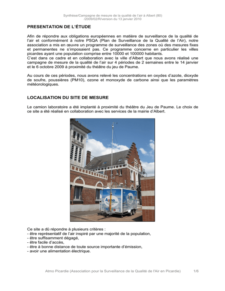Synthèse/Campagne de mesure de la qualité de l’air à Albert (80) /2009/02/R/version du 13 janvier 2010 PRESENTATION DE L’ÉTUDE Afin de répondre aux obligations européennes en matière de surveillance de la qualité de l’air et conformément à notre PSQA (Plan de Surveillance de la Qualité de l’Air), notre association a mis en œuvre un programme de surveillance des zones où des mesures fixes et permanentes ne s’imposaient pas. Ce programme concerne en particulier les villes picardes ayant une population comprise entre 10000 et 100000 habitants. C’est dans ce cadre et en collaboration avec la ville d’Albert que nous avons réalisé une campagne de mesure de la qualité de l’air sur 4 périodes de 2 semaines entre le 14 janvier et le 6 octobre 2009 à proximité du théâtre du jeu de Paume. Au cours de ces périodes, nous avons relevé les concentrations en oxydes d’azote, dioxyde de soufre, poussières (PM10), ozone et monoxyde de carbone ainsi que les paramètres météorologiques. LOCALISATION DU SITE DE MESURE Le camion laboratoire a été implanté à proximité du théâtre du Jeu de Paume. Le choix de ce site a été réalisé en collaboration avec les services de la mairie d’Albert. Ce site a dû répondre à plusieurs critères : - être représentatif de l’air inspiré par une majorité de la population, - être suffisamment dégagé, - être facile d’accès, - être à bonne distance de toute source importante d’émission, - avoir une alimentation électrique. Atmo Picardie (Association pour la Surveillance de la Qualité de l'Air en Picardie) 1/6 Synthèse/Campagne de mesure de la qualité de l’air à Albert (80) /2009/02/R/version du 13 janvier 2010 La carte ci-dessous présente l'implantation du camion laboratoire sur la commune d’Albert. Atmo Picardie (Association pour la Surveillance de la Qualité de l'Air en Picardie) 2/6 Synthèse/Campagne de mesure de la qualité de l’air à Albert (80) /2009/02/R/version du 13 janvier 2010 RÉSULTATS Au cours des 4 campagnes de mesure réalisées à proximité du théâtre du Jeu de Paume de la ville d’Albert durant l’année 2009, nous pouvant dire que : Les résultats observés en dioxyde d’azote (NO2) sont relativement proches de ceux de la station périurbaine de Salouël. La moyenne annuelle estimée à partir des 4 campagnes de mesure est inférieure à l’objectif de qualité et aux différentes valeurs limites définis dans l’article R221-1 du code de l’environnement. Moyenne des campagnes 2009 réalisées à Albert 18 µg/m3 Moyenne sur les 4 périodes pour la station de Salouël 14 µg/m3 Les concentrations obtenues en dioxyde de soufre (SO2) sont faibles. La moyenne annuelle estimée est très inférieure à l’objectif de qualité et aux différentes valeurs limites définis dans l’article R221-1 du code de l’environnement. Moyenne des campagnes 2009 réalisées à Albert 1 µg/m3 Moyenne sur les 4 périodes pour la station de St Leu 1 µg/m3 Atmo Picardie (Association pour la Surveillance de la Qualité de l'Air en Picardie) 3/6 Synthèse/Campagne de mesure de la qualité de l’air à Albert (80) /2009/02/R/version du 13 janvier 2010 L’évolution des concentrations moyennes glissantes sur 24h poussières (PM10) est proche de celle de la station de Salouël. La moyenne annuelle estimée est inférieure à l’objectif de qualité et à la valeur limite définis dans l’article R221-1 du code de l’environnement. Moyenne des campagnes 2009 réalisées à Albert 26 µg/m3 Moyenne sur les 4 périodes pour la station de Salouël 26 µg/m3 Atmo Picardie (Association pour la Surveillance de la Qualité de l'Air en Picardie) 4/6 Synthèse/Campagne de mesure de la qualité de l’air à Albert (80) /2009/02/R/version du 13 janvier 2010 L’évolution des concentrations horaires en ozone (O3) est proche de celle de la station de Salouël. Les niveaux en monoxyde de carbone (CO) restent faibles et comparables à ceux des autres villes étudiées en 2009. Moyenne des campagnes 2009 réalisées à Albert 0,28 mg/m3 Moyenne des campagnes 2009 réalisées à Chantilly 0,29 mg/m3 Moyenne des campagnes 2009 réalisées à Château-Thierry 0,30 mg/m3 Au cours des 4 campagnes de mesure, aucun dépassement des différents seuils d’alerte n’a été constaté. Atmo Picardie (Association pour la Surveillance de la Qualité de l'Air en Picardie) 5/6 Synthèse/Campagne de mesure de la qualité de l’air à Albert (80) /2009/02/R/version du 13 janvier 2010 L’Indice de Qualité de l’Air est globalement bon sur l’ensemble des campagnes de mesure. CONCLUSION Les concentrations dans l’air ambiant en NO2, PM10, O3, SO2, CO relevées au cours de cette campagne de mesure à proximité du théâtre du Jeu de Paume de la ville d’Albert sont correctes en comparaison avec les différents seuils réglementaires en vigueur et avec les niveaux enregistrés par les stations de mesure de la qualité de l’air de Salouël et Amiens. Atmo Picardie (Association pour la Surveillance de la Qualité de l'Air en Picardie) 6/6