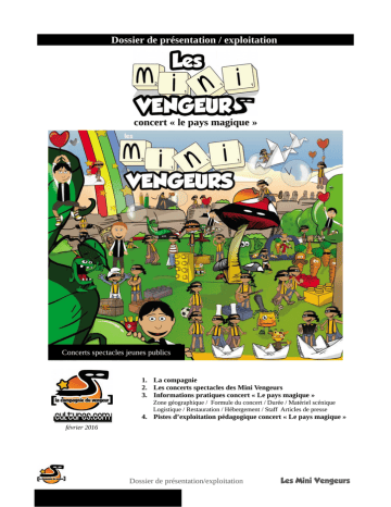 Dossier de présentation / exploitation concert « le pays magique » Concerts spectacles jeunes publics sommaire 1. La compagnie 2. Les concerts spectacles des Mini Vengeurs 3. Informations pratiques concert « Le pays magique » Zone géographique / Formule du concert / Durée / Matériel scénique Logistique / Restauration / Hébergement / Staff Articles de presse 4. Pistes d’exploitation pédagogique concert « Le pays magique » février 2016 Dossier de présentation/exploitation Les Mini Vengeurs La compagnie Présenté par la compagnie du Vengeur (production Cultures.com), les Mini Vengeurs sont des concerts spectacles destinés au jeune public, mais pas que ! Ils s'adressent à un public prioritairement de 4 à 11 ans. Ses différents niveaux de lecture et sa musique variée et essentiellement dynamique permettent à toute la famille une immersion dans l'univers poétique et amusant du pays magique. Sur fond de découverte musicale et déroulé narratif, le public se retrouve ainsi dans la peau des mini vengeurs. (ou maxi vengeurs pour leurs parents) Les spectacles sont ainsi avant tout un moment de partage familial. Les musiques sont interprétées en live, et permettent à l'enfant de parfaire sa posture d'auditeur de spectacles vivants. Pour certains enfants, il s'agit de leur premier concert, et une rencontre en douceur et complicité avec la musique dite vivante. Sur fond de décors BD et personnages taille réelle, les Mini Vengeurs proposent des concerts dynamiques, colorés, et aménagent l'espace à livre ouvert. Toute une équipe de professionnels du spectacle et de l'éducation entourent l'artiste Benji Chatelin (professeur des écoles / musicien. +400 concerts France zénith, festival, musiques actuelles, concerts depuis 20 ans. Partage d’affiches nombreuses : Alpha Blondy, Bertignac, la rue Kétanou, les Ogres de Barbacks/Pittochat, les Wampas, Les Fatals picards, etc…) pour des spectacles reconnus pour leurs qualités artistiques et leurs contacts interactifs avec le jeune public. Les mini Vengeurs ont notamment été sélectionnés sur la tournée Place Aux Mômes Bretagne (20 concerts été), Festibosse (+ la rue kétanou), Festival Momenzik, Festival les Mouillos, etc... Fêtes scolaires, concerts en centre de loisirs ou office du tourisme et arbre de noël CE égayent également la route des mini vengeurs. Site internet compagnie : facebook.com/minivengeurs http://vengeurdemasque.fr Dossier de présentation/exploitation Les Mini Vengeurs Les concerts-spectacles des Mini Vengeurs Trois spectacles des Mini Vengeurs sont actuellement ou prochainement disponibles: -Le pays magique -Destination rêve (Eté 2016) -Les contes du pays magique : le voleur de doudou (A venir) Le pays magique: Les gardiens du pays magiques entraînent le jeune public et les maxi vengeurs à la découverte de ce pays fantastique pour venger les jolis rêves de la petite fille du spectacle. Même pas peur! Décor BD, coffre à jouet géant d'où sortent nos artistes, et personnages attachants et hilarants viennent égayer ce spectacle musical dynamique. (accordéon/guitare/basse/Grosse caisse/Sampler. Multi-style: de la chanson française, au rock, reggae.) Les enfants écoutent, rêvent, partagent, mais surtout interagissent, chantent et sautent sous le flonflon de nos 2 artistes. Jauge: 50 à 1000 Nouveauté été 2016 : -Destination rêve: Et si nous réalisions nos rêves d'enfant? Celui de notre héroïne brille de milles lumières: partir en fusée pour décrocher les étoiles. Mais comment faire? Pas une minute à perdre, les gardiens du pays magique embarquent les mini vengeurs en chanson dans la construction d'une fusée géante pour un décollage loufoque imminent! Destination l'espace magique où la découverte du décor BD et des personnages géants viendra ponctuer les chants et les sauts des enfants! (accordéon/guitare/basse multistyle: de la chanson française, au rock, reggae.) Jauge: 50 à 1000 Nouveauté 2ème semestre 2016 : -Les contes du pays magique: le voleur de doudou. Une vraie enquête policière aux côtés du Colonel Moutard pour retrouver le voleur de Doudou! Washing machine magique, et arbre géant sont autant de décors originaux qui transporteront les enfants dans cette enquête 200% interactive! La conteuse perchée dans l'arbre et son acolyte musicien sauront transporter le public pour un moment à partager en famille. Saurez-vous trouver le voleur mystère? Ce spectacle est uniquement proposé en formule son tout inclus pour de petites jauges (- de 150) Ces spectacles s'adaptent aussi bien pour les festivals, manifestations jeunes publics d'importance, que les arbres de noël, centres de loisirs ou manifestations culturelles de parents d'élèves. Les organisateurs habituels des concerts Mini Vengeurs sont aussi bien des collectivités locales, offices de tourisme, associations culturelles, festivals, salles de spectacles que des comités des fêtes, CE, ou associations de parents d'élèves. Dossier de présentation/exploitation Les Mini Vengeurs Informations pratiques Concert Les Mini Vengeurs « Le pays magique » Zone géographique La compagnie du vengeur est implantée sur la région d'Orléans, et se déplace limitrophe, région centre et France entière. Formules des concerts Deux formules sont possibles : Formule autonome techniquement tout inclus (lieux non équipés) Prestation 2 musiciens & technicien son dédié groupe Installation et mise à disposition du matériel de son : façade (système de diffusion QSC K. + console numérique) + plateau (micros DPA serre tête + Shure / DI / Système limex accordéon / Ear monitor earsonics EM2 pro) Lumières premières concert (Pars 64) Grandes moquettes enfants possibles sur demande. Electricité : pour le son, prévoir deux arrivées de courant 220V (sur l’espace de jeu + une arrivée proche de la console derrière le public). Pour la lumière prévoir si possible une arrivée de courant 220 