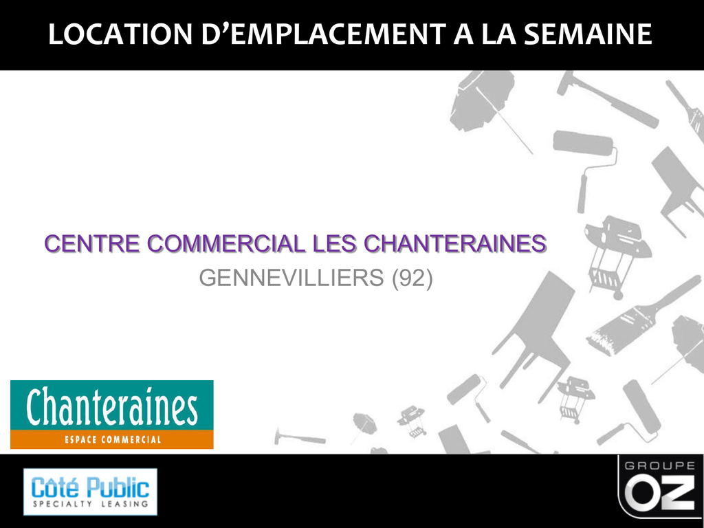 LOCATION D’EMPLACEMENT A LA SEMAINE201 3 CENTRE COMMERCIAL LES CHANTERAINES GENNEVILLIERS (92) LE CENTRE COMMERCIAL (1/2) Le Plan d’implantation (non contractuel) Description de l’actif Clientèle Retail Park Date d’ouverture : 2006 Surface GLA : 23 650 m² Parking : 960 places Performances Nombre d’enseignes : 12, 100 % nationales Localisation Situé à Gennevilliers Age moyen : 39 ans CSP ++ : 30 % CSP + : 51 % CSP : 88 % à proximité de l’échangeur A86/A15 Face au Parc régional des Chanteraines Chiffre d’affaires 2011 : 100,4 M€ TTC Fréquentation 2011 : 4 M de visiteurs Etude de zone Zone de chalandise : 900 000 habitants Dynamisme du Retail Park renforcé par le voisinage immédiat de Leroy Merlin et du multiplexe Mégarama Enseignes très attractives Principaux accès CA records pour cette typologie de site sur la FNAC et En voiture : Par la sortie n°6 de l’A86 Boulanger : > à 8 500 € /m² /an En bus : 3 lignes desservent le site Clientèle à pouvoir d’achat élevé En Tramway : Arrivée du tramway T1 en 2012 Site ouvert 7jrs/7jrs non contractuel CENTRE COMMERCIAL LES CHANTERAINES GENNEVILIERS - 92 2 LE CENTRE COMMERCIAL (2/2) Horaires de la galerie: 10H00 – 20H00 201 3 Adresse : Espace Commercial Chantereines 92230 GENNEVILLIERS CENTRE COMMERCIAL LES CHANTERAINES Parking Gratuit GENNEVILIERS - 92 PLAN D’IMPLANTATION 201 (non contractuel) Le Plan d’implantation (non contractuel) 3 3 4 1 2 5 6 LA TARIFICATION Tarification semaine 1050 € HT du lundi au samedi N° DIM Positionnement emplacement 1 144 m² Parking Fnac 2 168 m² Parking Lapeyre 3 180 m² Parking Décathlon 4 180 m² Parking Trolat 5 80 m² Parking Gémo 6 80 m² Parking Casa CONTACT COMMERCIAL Alexandre BENNES Chargé de Clientèle [email protected] 06.40.07.0065 CENTRE COMMERCIAL LES CHANTERAINES GENNEVILIERS - 92 CONDITIONS D’EXPOSITION 201 3 Pour votre exposition en galerie marchande : • Respecter l’ensemble des consignes imposés par votre contrat ainsi que par la direction du Centre, qu’il s’agisse des consignes de sécurité ou d’exposition. Nous rappelons notamment que la distribution de brochures/flyers dans la galerie marchande, ainsi que l’affichage sauvage, sont strictement interdits. • Respecter la zone d’exposition : ne pas dépasser les limites de votre emplacement, qui sera obligatoirement délimité par une moquette ignifugée de norme M1. • Respecter les règles d’exposition : en terme d’équipement (ne pas surcharger son stand) et en terme de hauteur (ne pas cacher les enseignes des boutiques) PROCEDURE D’INSCRIPTION Etape 1 - Planification de votre exposition : (A nous renvoyer par mail) • • • Choisir la période et l’emplacement souhaité Sélectionner une ou plusieurs photos de votre stand (ou produit) qui sera présenté Transmettre l’ensemble des informations par mail à votre interlocuteur COTE PUBLIC Etape 2 - Validation par la direction du centre : Une fois votre dossier complet, votre demande sera faite auprès du centre pour obtenir la validation de votre période d’exposition et de vos produits. 1° - Candidature acceptée : validation de votre candidature, après accord de votre emplacement. Nous vous ferons parvenir le bon de commande et le contrat en double exemplaires. 2° - Candidature rejetée, 201 3 Etape 3 - Dossier d’inscription précaire : (A nous renvoyer sous 5 jours maximum à l’adresse inscrite au bas de la page) • Extrait K-Bis de moins de 3 mois, ou la carte répertoire des métiers • Carte d’identité du Gérant de l’entreprise • Attestation de fournitures de déclaration URSSAF datant de moins de 6 mois • Attestation d’Assurance Responsabilité Civile de l’année en cours • Attestation relative au renforcement de la lutte contre le travail Illégal (En annexe) Etape 4 - Confirmation de Réservation : Pour valider votre réservation, vous devez nous renvoyer sous 72 Heures • Un exemplaire du bon de commande Signé et Tamponné sur les 2 PAGES • Le règlement de l’opération dans sa totalité (voir l’ensemble des modalités de règlement dans le dossier d’inscription complet) Délais de règlement : Chaque règlement devra être effectué impérativement 1 semaine avant votre date d’installation soit par mandat compte ou virement (en cas de règlement par chèque, le délai d’envoie est de 15 jours). Attention : vous ne pourrez pas vous installer si le paiement n’a pas été effectué.