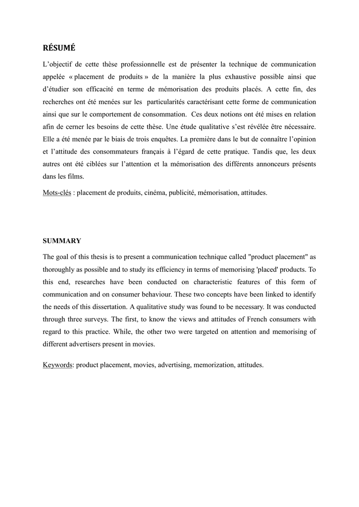 RÉSUMÉ L’objectif de cette thèse professionnelle est de présenter la technique de communication appelée « placement de produits » de la manière la plus exhaustive possible ainsi que d’étudier son efficacité en terme de mémorisation des produits placés. A cette fin, des recherches ont été menées sur les particularités caractérisant cette forme de communication ainsi que sur le comportement de consommation. Ces deux notions ont été mises en relation afin de cerner les besoins de cette thèse. Une étude qualitative s’est révélée être nécessaire. Elle a été menée par le biais de trois enquêtes. La première dans le but de connaître l’opinion et l’attitude des consommateurs français à l’égard de cette pratique. Tandis que, les deux autres ont été ciblées sur l’attention et la mémorisation des différents annonceurs présents dans les films. Mots-clés : placement de produits, cinéma, publicité, mémorisation, attitudes. SUMMARY The goal of this thesis is to present a communication technique called "product placement" as thoroughly as possible and to study its efficiency in terms of memorising 'placed' products. To this end, researches have been conducted on characteristic features of this form of communication and on consumer behaviour. These two concepts have been linked to identify the needs of this dissertation. A qualitative study was found to be necessary. It was conducted through three surveys. The first, to know the views and attitudes of French consumers with regard to this practice. While, the other two were targeted on attention and memorising of different advertisers present in movies. Keywords: product placement, movies, advertising, memorization, attitudes. SOMMAIRE INTRODUCTION ............................................................................................................. p4 PARTIE I : LES SPÉCIFICITÉS DU PLACEMENT DE PRODUITS ....................... p8 Chapitre 1 : Des origines de la pratique à aujourd’hui ......................................................... p8 Section 1 : Publicité : les premiers pas au cinéma ............................................................... p8 Section 2 : Evolution des rapports entre annonceur et producteur ....................................... p10 Section 3 : Le placement de produits d’aujourd’hui : les différentes formes ...................... p11 Chapitre 2 : Les motivations d’utilisation du placement de produit ..................................... p15 Section 1 : Annonceurs : une solution alternative nécessaire ............................................. p13 Section 2 : Producteurs : Cinéma et publicité, une association utile .................................... pxx Chapitre 3 : Les limites du placement de produits ............................................................... p29 Section 1 : Un investissement difficile à contrôler .............................................................. p28 Section 2 : Un impact complexe à mesurer .......................................................................... p29 Section 3 : Risque de décrédibilisassions du film ............................................................... p29 Section 4 : Le cadre juridique : frein au développement du placement de produits ............. p30 PARTIE II : L’IMPACT DE LA COMMUNICATION SUR LE CONSOMMATEUR .. p34 Chapitre 1: Les caractéristiques de la consommation ......................................................... p34 Section 1 : Le processus de l’acte d’achat ............................................................................ p34 Section 2 : Les facteurs d’influence du comportement du consommateur .......................... p34 Section 3 : Le mécanisme de la perception des informations .............................................. p41 Chapitre 2 : La mémorisation ............................................................................................... p44 Section 1 : Le fonctionnement de la mémoire ...................................................................... p43 Section 2 : Le stockage de l’information ............................................................................. p46 Section 3 : L’extraction des informations ............................................................................ p50 Section 4 : Les concepts de mémoire implicite et explicite ................................................. p52 PARTIE III : ETUDES DE L’IMPACT DU PLACEMENT DE PRODUITS ............ p55 Chapitre 1 : Etude qualitative sur la sensibilité des spectateurs au placement de produits .. p55 Section 1 : Elaboration du questionnaire .............................................................................. p54 Section 2 : Administration du questionnaire ........................................................................ p55 Section 3 : Résultats et analyse du questionnaire ................................................................. p58 Chapitre 2 : Expérimentation de la mémorisation de placements de produits .................... p65 Section 1 : Méthodologie de l’étude .................................................................................... p64 Section 2 : Analyse des réponses ......................................................................................... p66 CONCLUSION GÉNÉRALE ............................................................................................ p74 BIBLIOGRAPHIE ............................................................................................................. ANNEXES ........................................................................................................................... INTRODUCTION INTRODUCTION « Le succès n’a pas de recette. On ne sort pas forcément gagnant d’une entreprise en dosant un tiers de sexe, un tiers de violence, un tiers de rires et de larmes. Un film salué par la critique ne devient pas forcéme