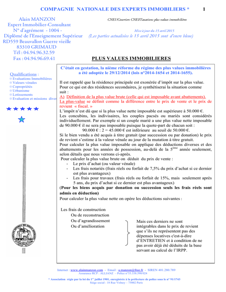 COMPAGNIE NATIONALE DES EXPERTS IMMOBILIERS * Alain MANZON Expert Immobilier-Consultant N° d’agrément - 1004 Diplômé de l’Enseignement Supérieur RD559 Beauvallon Guerre vieille 83310 GRIMAUD Tél : 04.94.96.32.59 Fax : 04.94.96.69.41 Qualifications : 1 CNEI /Courriers CNEI/Taxations plus-values immobilières Mise à jour du 15 avril 2015 (Les parties actualisées le 15 avril 2015 sont d’encre bleue) PLUS VALUES IMMOBILIERES C’était en gestation, la nième réforme du régime des plus values immobilières a été adoptée le 29/12/2014 (lois n°2014-1654 et 2014-1655). ¤ Evaluations Immobilières Il est rappelé que la résidence principale est exonérée d’impôt sur la plus value. ¤ Valeurs vénales ¤ Copropriétés Pour ce qui est des résidences secondaires, je synthétiserai la situation comme ¤ Urbanisme suit : ¤ Lotissements ¤ Evaluation et missions diversesA) Définition de la plus value brute (celle qui est imposable avant abattements). La plus-value se définit comme la différence entre le prix de vente et le prix de revient « fiscal. » L’impôt n’est dû que si la plus value nette imposable est supérieure à 50.000 €. Les concubins, les indivisaires, les couples pacsés ou mariés sont considérés individuellement. Par exemple si un couple marié a une plus value nette imposable de 90.000 € il ne sera pas imposable puisque la quote-part de chacun soit : 90.000 € : 2 = 45.000 € est inférieure au seuil de 50.000 €. Si le bien vendu a été acquis à titre gratuit (par succession ou par donation) le prix de revient s’estime à la valeur vénale au jour de la mutation à titre gratuit. Pour calculer la plus value imposable on applique des déductions diverses et des abattements pour les années de possession, au-delà de la 5ème année seulement, selon détails que nous verrons ci-après. Pour calculer la plus value brute on déduit du prix de vente : - Le prix d’achat (ou valeur vénale) - Les frais notariés (frais réels ou forfait de 7,5% du prix d’achat si ce dernier est plus avantageux) - Les frais pour travaux (frais réels ou forfait de 15%, mais seulement après 5 ans, du prix d’achat si ce dernier est plus avantageux) (Pour les biens acquis par donation ou succession seuls les frais réels sont admis en déduction) Pour calculer la plus value nette on opère les déductions suivantes : Les frais de construction Ou de reconstruction Ou d’agrandissement Ou d’amélioration Mais ces derniers ne sont intégrables dans le prix de revient que s’ils ne représentent pas des dépenses locatives c'est-à-dire d’ENTRETIEN et à condition de ne pas avoir déjà été déduits de la base servant au calcul de l’IRPP. Internet : www.alainmanzon.com - Email : [email protected] - SIREN 401.280.789 Assurance RCP : ALLIANZ – Police n°53.338.598/024 * Association régie par la loi du 1er juillet 1901, enregistrée à la préfecture de police sous le n° 91/1743 Siège social : 18 Rue Volney – 75002 Paris COMPAGNIE NATIONALE DES EXPERTS IMMOBILIERS* 2 Pour les frais visés ci-dessus la déduction d’un forfait de 15% du prix d’achat (si cette option est choisie), sans aucun justificatif, est possible après un achat datant de plus de 5 ans. En cas de construction du bien vendu par le vendeur, le point de départ du calcul des coefficients pour durée de détention est constitué par la date figurant sur la première facture. Attention : Les factures de travaux doivent être correctement libellées et leurs paiements doivent être justifiés par des relevés ou des virements bancaires. Les paiements effectués en espèces même avec la mention de l’acquit par l’entrepreneur ne sont pas pris en compte. De même les travaux effectués par le propriétaire lui-même ne sont pas pris en compte. °L’abattement de 1000 € sur l’impôt est supprimé. °Les abattements pour années de détention sont décrits ci-après au paragraphe F). B) Cas particulier d’achat d’un terrain suivi d’une construction : Il est admis par l’administration fiscale que le prix de vente est scindé, par convention, à hauteur de : - 20% pour le terrain - 80% pour le bâti. (Sauf à prouver, si cela est votre intérêt, que ces pourcentages sont différents dans le cas où la valeur du terrain est plus importante) Cela veut dire que si vous vendez, par exemple, 1.000.000 € votre maison, cela induit un prix de : 4) 1.000.000 x 20% = 200.000 € pour le terrain 5) et de 1.000.000 x 80% = 800.000 € pour le bâti et ce, par convention fiscale. La plus-value sera alors calculée en deux fois et s’appliquera : a) Sur le terrain (prix d’achat, frais d’achat, abattements par années de possession) b) Sur la construction et les frais annexes (taxes à la construction, voirie, honoraires, factures de travaux, abattements à compter de l’année de paiement de la première facture.) C) Cas d’exonération totale ou partielle de l’impôt sur la plus-value : C1) Vente de la résidence principale : Exonération totale. (Celle-ci est « jugée » au jour de la cession avec un délai de 24 mois pour vendre si vous devez déménager avant d’avoir vendu cette dernière). Pour les personnes âgées ayant quitté leur domicile principal pour aller en maison de retraite : elles sont exonérées d’impôt sur les plus values si elles vendent leur bien dans le délai de deux ans à condition que ce dernier ne soit pas occupé pendant ces deux ans par un autre membre de leur foyer fiscal ou leur concubin. C2) Vente d’une résidence secondaire : Exonération totale ou partielle après vingt deux de trente années de possession pour les années pour l’impôt sur le revenu et prélèvements sociaux, comme nous le verrons ci-après. Il n’est donc pas tout à fait exact de parler d’exonération au bout de 22 ans. * Association régie par la loi du 1er juillet 1901, enregistrée à la préfecture de police sous le n° 91/1743 Siège social : 18 