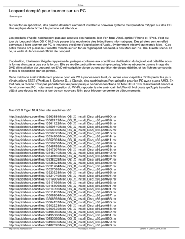 E-Help Leopard dompté pour tourner sur un PC Soumis par Sur un forum spécialisé, des pirates détaillent comment installer le nouveau système d'exploitation d'Apple sur des PC. Une réplique de la firme à la pomme est attendue. Les produits d'Apple n'échappent pas aux assauts des hackers, loin s'en faut. Ainsi, après l'iPhone et l'iPod, c'est au tour de Leopard (Mac OS X 10.5) de passer à la moulinette des bidouilleurs informatiques. Des pirates sont en effet parvenus à faire tourner sur PC le nouveau système d'exploitation d'Apple, évidemment réservé au monde Mac. Ces petits malins ont publié leur recette miracle sur un forum regroupant des fondus des Mac sur PC, The Osx86 Scene. Et ce, la veille du lancement officiel de Leopard. L'opération, totalement illégale rappelons-le, puisque contraire aux conditions d'utilisation du logiciel, est détaillée sous la forme d'un pas à pas sur le forum. Elle se révèle particulièrement simple puisqu'elle ne nécessite qu'une image du DVD d'installation de Leopard, un DVD réinscriptible vierge ou une partition de disque dédiée, et les fichiers concoctés et mis à disposition par les pirates. Cette méthode était initialement prévue pour les PC à processeurs Intel, du moins ceux capables d'interpréter les jeux d'instructions SSE3 (Pentium 4, Celeron D...). Depuis, des contributeurs l'ont adaptée pour les PC avec puces AMD. En tout cas, la recette n'est pas parfaitement au point puisque certaines fonctions de Mac OS X 10.5 résisteraient encore à l'environnement PC, notamment la gestion du Wi-Fi, rapporte le site américain InfoWorld. Nul doute qu'Apple travaille déjà à une riposte et mise à jour de son nouveau félin, pour bloquer ce genre de détournements. Mac OS X Tiger 10.4.6 for intel machines x86 http://rapidshare.com/files/13563884/Mac_OS_X_Install_Disc_x86.part090.rar http://rapidshare.com/files/13562412/Mac_OS_X_Install_Disc_x86.part069.rar http://rapidshare.com/files/13561122/Mac_OS_X_Install_Disc_x86.part068.rar http://rapidshare.com/files/13559810/Mac_OS_X_Install_Disc_x86.part038.rar http://rapidshare.com/files/13558006/Mac_OS_X_Install_Disc_x86.part035.rar http://rapidshare.com/files/13556075/Mac_OS_X_Install_Disc_x86.part015.rar http://rapidshare.com/files/13554206/Mac_OS_X_Install_Disc_x86.part014.rar http://rapidshare.com/files/13552301/Mac_OS_X_Install_Disc_x86.part011.rar http://rapidshare.com/files/13550250/Mac_OS_X_Install_Disc_x86.part009.rar http://rapidshare.com/files/13548793/Mac_OS_X_Install_Disc_x86.part089.rar http://rapidshare.com/files/13547207/Mac_OS_X_Install_Disc_x86.part033.rar http://rapidshare.com/files/13545210/Mac_OS_X_Install_Disc_x86.part010.rar http://rapidshare.com/files/13540166/Mac_OS_X_Install_Disc_x86.part008.rar http://rapidshare.com/files/13538228/Mac_OS_X_Install_Disc_x86.part007.rar http://rapidshare.com/files/13535824/Mac_OS_X_Install_Disc_x86.part098.rar http://rapidshare.com/files/13531264/Mac_OS_X_Install_Disc_x86.part097.rar http://rapidshare.com/files/13527088/Mac_OS_X_Install_Disc_x86.part096.rar http://rapidshare.com/files/13523528/Mac_OS_X_Install_Disc_x86.part095.rar http://rapidshare.com/files/13521049/Mac_OS_X_Install_Disc_x86.part094.rar http://rapidshare.com/files/13519309/Mac_OS_X_Install_Disc_x86.part093.rar http://rapidshare.com/files/13517199/Mac_OS_X_Install_Disc_x86.part092.rar http://rapidshare.com/files/13515506/Mac_OS_X_Install_Disc_x86.part091.rar http://rapidshare.com/files/13514096/Mac_OS_X_Install_Disc_x86.part091.rar http://rapidshare.com/files/13511437/Mac_OS_X_Install_Disc_x86.part088.rar http://rapidshare.com/files/13508904/Mac_OS_X_Install_Disc_x86.part087.rar http://rapidshare.com/files/13506593/Mac_OS_X_Install_Disc_x86.part086.rar http://rapidshare.com/files/13504137/Mac_OS_X_Install_Disc_x86.part085.rar http://rapidshare.com/files/13502223/Mac_OS_X_Install_Disc_x86.part084.rar http://rapidshare.com/files/13500339/Mac_OS_X_Install_Disc_x86.part083.rar http://rapidshare.com/files/13498060/Mac_OS_X_Install_Disc_x86.part082.rar http://rapidshare.com/files/13495668/Mac_OS_X_Install_Disc_x86.part081.rar http://rapidshare.com/files/13493386/Mac_OS_X_Install_Disc_x86.part080.rar http://rapidshare.com/files/13490739/Mac_OS_X_Install_Disc_x86.part079.rar http://rapidshare.com/files/13487826/Mac_OS_X_Install_Disc_x86.part078.rar http://e-help.freehostia.com Propulsé par Joomla! Généré: 1 October, 2016, 07:09 E-Help http://rapidshare.com/files/13486035/Mac_OS_X_Install_Disc_x86.part077.rar http://rapidshare.com/files/13483752/Mac_OS_X_Install_Disc_x86.part076.rar http://rapidshare.com/files/13481824/Mac_OS_X_Install_Disc_x86.part075.rar http://rapidshare.com/files/13479212/Mac_OS_X_Install_Disc_x86.part074.rar http://rapidshare.com/files/13477478/Mac_OS_X_Install_Disc_x86.part073.rar http://rapidshare.com/files/13475258/Mac_OS_X_Install_Disc_x86.part072.rar http://rapidshare.com/files/13472937/Mac_OS_X_Install_Disc_x86.part071.rar http://rapidshare.com/files/13470379/Mac_OS_X_Install_Disc_x86.part070.rar http://rapidshare.com/files/13468716/Mac_OS_X_Install_Disc_x86.part071.rar http://rapidshare.com/files/13465584/Mac_OS_X_Install_Disc_x86.part067.rar http://rapidshare.com/files/13463358/Mac_OS_X_Install_Disc_x86.part066.rar http://rapidshare.com/files/13461425/Mac_OS_X_Install_Disc_x86.part065.rar http://rapidshare.com/files/13459673/Mac_OS_X_Install_Disc_x86.part064.rar http://rapidshare.com/files/13458109/Mac_OS_X_Install_Disc_x86.part063.rar http://rapidshare.com/files/13456170/Mac_OS_X_Install_Disc_x86.part062.rar http://rapidshare.com/files/13454160/Mac_OS_X_Install_Disc_x86.part061.rar http://rapidshare.com/files/13451335/Mac_OS_X_Install_Disc_x86.part060.rar http://rapidshare.com/files/13417057/Mac_OS_X_Install_Disc_x86.part058.rar http://rapidshare.com/files/13415351/Mac_OS_X_Install_Disc_x86.part057.rar http://rapidshare.com/files/13414521/Mac_OS_X_Install_Disc_x86.part056.rar http://rapidshare.com/files/13412708/Mac_OS_X_Install_