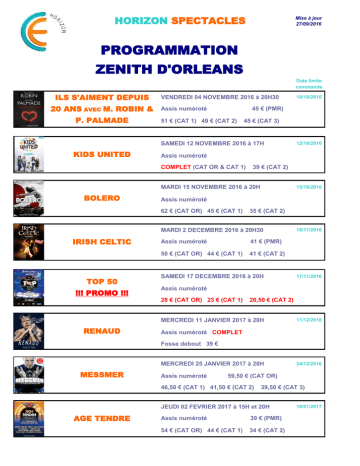 HORIZON SPECTACLES Mise à jour 27/09/2016 PROGRAMMATION ZENITH D'ORLEANS Date limite commande ILS S'AIMENT DEPUIS 20 ANS AVEC M. ROBIN & P. PALMADE VENDREDI 04 NOVEMBRE 2016 à 20H30 Assis numéroté 45 € (PMR) 51 € (CAT 1) 49 € (CAT 2) 45 € (CAT 3) SAMEDI 12 NOVEMBRE 2016 à 17H KIDS UNITED 39 € (CAT 2) 15/10/2016 MARDI 15 NOVEMBRE 2016 à 20H Assis numéroté 62 € (CAT OR) 45 € (CAT 1) 35 € (CAT 2) MARDI 2 DECEMBRE 2016 à 20H30 IRISH CELTIC TOP 50 !!! PROMO !!! Assis numéroté 41 € (PMR) 50 € (CAT OR) 44 € (CAT 1) 41 € (CAT 2) SAMEDI 17 DECEMBRE 2016 à 20H 16/11/2016 17/11/2016 Assis numéroté 28 € (CAT OR) 23 € (CAT 1) 20,50 € (CAT 2) MERCREDI 11 JANVIER 2017 à 20H RENAUD 12/10/2016 Assis numéroté COMPLET (CAT OR & CAT 1) BOLERO 18/10/2016 11/12/2016 Assis numéroté COMPLET Fosse debout 39 € MERCREDI 25 JANVIER 2017 à 20H MESSMER Assis numéroté 59,50 € (CAT OR) 46,50 € (CAT 1) 41,50 € (CAT 2) 39,50 € (CAT 3) JEUDI 02 FEVRIER 2017 à 15H et 20H AGE TENDRE 24/12/2016 Assis numéroté 39 € (PMR) 54 € (CAT OR) 44 € (CAT 1) 34 € (CAT 2) 16/01/2017 LAC DES CYGNES NOUVEAU DANSE AVEC LES STARS 09/01/2017 JEUDI 09 FEVRIER 2017 à 20H Assis numéroté 60 € (CAT OR) 46 € (CAT 1) 36 € (CAT 2) 25 € (- 12 ans CAT 1 & 2) VENDREDI 03 FEVRIER 2017 à 20H30 Assis numéroté 82 € (CAT PREMIUM) 57 € (CAT OR) 52 € (CAT 1) 46 € (CAT 2) 44 € (CAT 2) 32 € (- 12ans) 04/01/2017 SAMEDI 04 FEVRIER 2017 à 20H KENDJI GIRAC Fosse debout 36 € Assis numéroté 55 € (CAT 1) 45€ (CAT 2) SAMEDI 18 FEVRIER 2017 à 15H30 et 21H LES 3 MOUSQUETAIRES 03/01/2017 Assis numéroté 02/02/2017 39 € (PMR) 86 € (CAT OR) 71 € (CAT 1) 63 € (CAT 2) 39 € (CAT 3) SAMEDI 04 MARS 2017 à 20H CHRISTOPHE MAE Assis numéroté COMPLET (CAT OR) 59 € (CAT 1) 46 € (CAT 2) CELTIC LEGENDS NOUVEAU AÏDA NOUVEAU AÏDA NOUVEAU BEST OF FLOYD NOUVEAU STARS 80 - 10 ANS DÉJÀ ! 04/02/2017 39 € (CAT 3) MERCREDI 08 MARS 2017 à 20H 08/02/2017 Assis numéroté 50 € (CAT OR) 41 € (CAT 1) 34 € (CAT 2) VEND 17, SAM 18 MARS 2017 à 20H Assis numéroté 36 € (CAT 2) 59 € (CAT 1) 46 € (ORCHESTRE) 26 € (CAT 3) 19 € (CAT 3) DIMANCHE 19 MARS 2017 à 16H Assis numéroté 36 € (CAT 2) 28/02/2017 28/02/2017 59 € (CAT 1) 46 € (ORCHESTRE) 26 € (CAT 3) 19 € (CAT 3) JEUDI 23 MARS 2017 à 20H 23/02/2017 Assis numéroté 55 € (CAT OR) 43 € (CAT 1) 39 € (CAT 2) SAMEDI 25 MARS 2017 à 20H Assis numéroté 25/02/2017 COMPLET (CARRE OR) 51 € (CAT 1) 45 € (CAT 2) 29 € (- 12ans) 26/02/2017 DIMANCHE 26 MARS 2017 à 17H30 LES SCHTROUMPFS Assis numéroté 45 € (CARRE OR) 42 € (OR ENFANT) 30 € (CAT 1) JULIEN DORÉ NOUVEAU SOPRANO NOUVEAU Assis libre 20 € (CAT 2) 28/02/2017 MERCREDI 29 MARS 2017 à 20H Fosse debout 29 € Assis numéroté 46 € (CAT 1) 42 € (CAT 2) 15/03/2017 VENDREDI 31 MARS 2017 à 20H Fosse debout 31 € Assis numéroté 39 € (PMR) 46 € (CAT 1) 36 € (CAT 2) 20/03/2017 JEUDI 06 AVRIL 2017 à 20H30 JEREMY FERRARI Assis libre 38 € (TARIF UNIQUE) 07/04/2017 VENDREDI 21 AVRIL 2017 à 20H30 HIT PARADE Assis numéroté 82 € (CAT OR) 71 € (CAT 1) 60 € (CAT 2) 54 € (CAT 3) 39 € (PMR) 34 € (CAT 4) 05/04/2017 VENDREDI 5 MAI 2017 à 20H VERONIC DICAIRE Assis numéroté 62 € (CAT OR) 53 € (CAT 1) 49 € (CAT 2) 14/04/2017 DIMANCHE 14 MAI 2017 à 18H M. POKORA Assis numéroté 62 € (CAT 1) 52 € (CAT 2) 42 € (CAT 3) 15/05/2017 VENDREDI 2 JUIN 2017 à 20H30 NOTRE DAME DE PARIS Assis numéroté 64 € (CAT 1) 28 € (PMR) 51 € (CAT 2) 39 € (CAT3) 28 € (CAT 4) 15/05/2017 SAMEDI 3 JUIN 2017 à 15H et 20H30 NOTRE DAME DE PARIS Assis numéroté 64 € (CAT 1) 28 € (PMR) 51 € (CAT 2) 39 € (CAT3) 28 € (CAT 4) SAM. 23 SEPTEMBRE 2017 à 15H et 20H30 SATURDAY NIGHT FEVER Assis numéroté 46 € (CAT 1)* 86 € (CAT OR) 41 € (CAT 2)* 06/09/2017 39 € (PMR) 39 € (CAT3) *offre de lancement valable jusqu'au 30/09/2016 VEND 29, SAM 30 SEPTEMBRE 2017 à 20H LES BODIN'S 29/08/2017 Assis numéroté 48,50 € (CAT 1) 40,50 € (CAT 2) 35 € (- 12ans) DIMANCHE 01 OCTOBRE 2017 à 15H LES BODIN'S 29/08/2017 Assis numéroté 48,50 € (CAT 1) 40,50 € (CAT 2) 35 € (- 12ans) LES CHORISTES NOUVEAU JEUDI 09 NOVEMBRE 2017 à 20H Assis numéroté 56 € (CAT 1) 75 € (CAT OR) 40 € (CAT 2) 35 € (CAT3) MERCREDI 22 NOVEMBRE 2017 à 20H CARMINA BURANA MICRO D'ARGENT PRISCILLA FOLLE DU DESERT TARIF PREMS 22/10/2017 Assis numéroté 65 € (CAT OR) 45 € (CAT 1) IAM - L'ECOLE DU 09/10/2017 35 € (CAT 2) VENDREDI 01 DECEMBRE 2017 à 20H Fosse debout 42,20 € Assis numéroté 53,20 € (CAT 1) VEND 09, SAM 10 FEVRIER 2018 à 20H Assis numéroté 30/10/2017 10/01/2017 59 € (CAT PREMIUM) 49 € (CAT 1) 39 € (CAT 2) 29 € (CAT 3) PROGRAMMATION AUTRES SALLES JARRY ST JEAN DE LA RUELLE LES HOMMES VIENNENT DE MARS, LES FEMMES DE VENUS2THEATRE ORLEANS JEUDI 06 AVRIL 2017 à 20H 06/03/2017 Assis libre 29 € (TARIF UNIQUE) MERCREDI 25 AVRIL 2017 à 20H 25/03/2017 Assis libre 37 € (TARIF UNIQUE) TOUS LES SPECTACLES A L'ESPACE GEORGES SAND DE CHECY, LA PASSERELLE DE FLEURY LES AUBRAIS & SUR TOURS LISTE COMPLETE SUR www.horizon-ce.fr, n'hésitez pas à nous contacter si un spectacle venait à manquer ! TOUS LES SPECTACLES SUR CHATEAUDUN LISTE COMPLETE SUR www.cheyenne-prod.com TOUS LES SPECTACLES SUR CHATEAUROUX LISTE COMPLETE SUR www.cheyenne-prod.com TOUS LES SPECTACLES SUR BOURGES LISTE COMPLETE SUR www.cheyenne-prod.com PALAIS D'AURON TOUS LES SPECTACLES SUR NANTES ZENITH - CITE DES CONGRES TOUS LES SPECTACLES SUR RENNES MUSIKHALL LISTE COMPLETE SUR www.cheyenne-prod.com LISTE COMPLETE SUR www.cheyenne-prod.com TOUS LES SPECTACLES SUR FOUGERE et BRESSUIRE LISTE COMPLETE SUR www.cheyenne-prod.com PARC EXPO et BACAPOLE TOUS LES SPECTACLES SUR ANGERS et ANGOULEME CENTRE DES CONGRES - LISTE COMPLETE SUR www.cheyenne-prod.com AMPHITEATRE et E.CARAT Commandez le plus tôt possible vos places afin d'avoir de la di