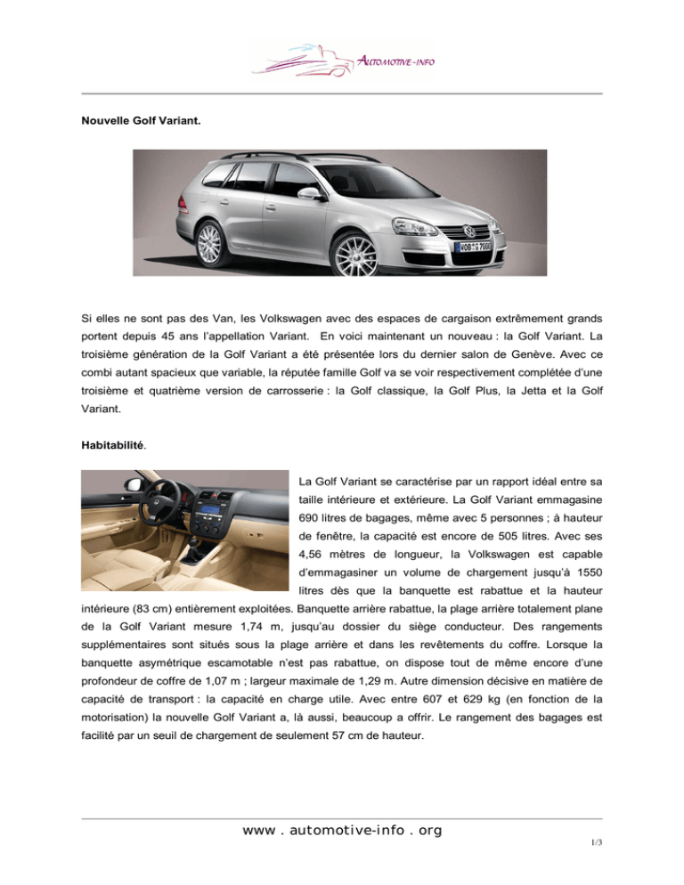 Nouvelle Golf Variant. Si elles ne sont pas des Van, les Volkswagen avec des espaces de cargaison extrêmement grands portent depuis 45 ans l’appellation Variant. En voici maintenant un nouveau : la Golf Variant. La troisième génération de la Golf Variant a été présentée lors du dernier salon de Genève. Avec ce combi autant spacieux que variable, la réputée famille Golf va se voir respectivement complétée d’une troisième et quatrième version de carrosserie : la Golf classique, la Golf Plus, la Jetta et la Golf Variant. Habitabilité. La Golf Variant se caractérise par un rapport idéal entre sa taille intérieure et extérieure. La Golf Variant emmagasine 690 litres de bagages, même avec 5 personnes ; à hauteur de fenêtre, la capacité est encore de 505 litres. Avec ses 4,56 mètres de longueur, la Volkswagen est capable d’emmagasiner un volume de chargement jusqu’à 1550 litres dès que la banquette est rabattue et la hauteur intérieure (83 cm) entièrement exploitées. Banquette arrière rabattue, la plage arrière totalement plane de la Golf Variant mesure 1,74 m, jusqu’au dossier du siège conducteur. Des rangements supplémentaires sont situés sous la plage arrière et dans les revêtements du coffre. Lorsque la banquette asymétrique escamotable n’est pas rabattue, on dispose tout de même encore d’une profondeur de coffre de 1,07 m ; largeur maximale de 1,29 m. Autre dimension décisive en matière de capacité de transport : la capacité en charge utile. Avec entre 607 et 629 kg (en fonction de la motorisation) la nouvelle Golf Variant a, là aussi, beaucoup a offrir. Le rangement des bagages est facilité par un seuil de chargement de seulement 57 cm de hauteur. www . automotive-info . org 1/3 Design. Le design de la troisième Golf Variant se caractérise par une synthèse d’éléments stylistiques nouveaux et classiques. Avec ses lignes, la silhouette de la nouvelle Volkswagen établit une liaison certaine avec la Passat Variant. Il n’en reste pas moins que, même sous cette perspective, la Golf Variant se caractérise par une forte individualité. Une caractéristique évidente dans ce cadre : les feux arrières enveloppant longuement la partie latérale. L’arrière de la nouvelle Variant présente un aspect totalement nouveau de la Golf. Alors que les feux arrières des autres variantes de carrosserie de cette gamme occupent environ la moitié du hayon, ils sont sur la Golf Variant complètement intégrés dans les ailes. Ils soulignent optiquement la grande largeur de chargement de la portière du coffre. Comme sur la Passat Variant, la vitre arrière prolongée jusqu’aux montants D (autre indice d’une large possibilité de chargement) et le spoiler de toiture formant une arête permettant d’optimiser l’aérodynamique (force de pression augmentée, consommation moindre) sont par contre des caractéristiques typiques au design Volkswagen. Coefficient de pénétration aérodynamique de 0,31. Parallèlement, le spoiler accentue l’attitude éminemment sportive de la nouvelle Golf Variant. Le design de la partie frontale se distingue par une calandre chromée avec emblème. Similairement, le pare-chocs est également pourvu de barrettes de protection chromées. Projecteurs, ailes et capot de moteur ont été repris intégralement de la gamme globale. Motorisation. A son introduction, la Golf Variant sera proposée avec un moteur essence et deux moteurs diesel. Le moteur à essence a une puissance de 75 kw (102 ch). Les deux moteurs diesel de la Golf Variant se caractérisent par une puissance supérieure et une sobriété remarquable : avec 77 kw (105 ch) et 103 kw (140 ch), ils se rangent parmi les moteurs les plus efficaces. Le plus petit des ces deux TDI se contente de 5,2 litres de diesel aux 100 km avec une émission de CO2 de 137 g/km. Le gros TDI de la nouvelle Golf Variant est quant à lui tout aussi sobre et écologique. Malgré son couple maximum remarquable de 320 Nm, la Golf Variant 2.0 TDI avec sa vitesse de pointe de 205 km/h ne consomme que 5,6 litres. L’émission de CO2 est de 148 g/km. Comme pour la Golf, la Golf Plus et la Jetta, la Golf Variant www . automotive-info . org 2/3 sera disponible avec diverses boites automatiques à 6 vitesses. La boite à double embrayage DSG en fait partie. Equipements. Comme la Golf classique, la nouvelle Golf Variant sera également disponible dans les lignes d’équipement Trendline, Comfortline et Sportline. Dès le modèle de base Trendline, un vaste équipement confort et sécurité, y compris 6 aribags et ESP, est disponible. Toutes les versions sont par principe pourvues de pare-chocs et baguette de protection dans la teinte de la carrosserie, calandre chromée avec emblème et barre de toit. Les clients optant pour la Golf Variant Comfortline reçoivent entre autres des jantes en alliage léger de 16 pouces avec des pneus de 205, la climatisation semi-automatique « Climatic », des sièges avants types confort, une banquette arrière avec accoudoir central et trappe à ski, un rétroviseur intérieur jour/nuit ainsi qu’un détecteur de pluie et un dispositif d’allumage des phares. La Golf Variant Sportline dispose de série d’équipements tels que châssis sport surbaissé de 15 mm, sièges sport à l’avant, jantes alliages léger de 16 pouces avec des pneus de taille 205/55, ordinateur de bord, volant sport en cuir ainsi que climatisation. Cynthia De Waele – 01/08/2007 www . automotive-info . org 3/3