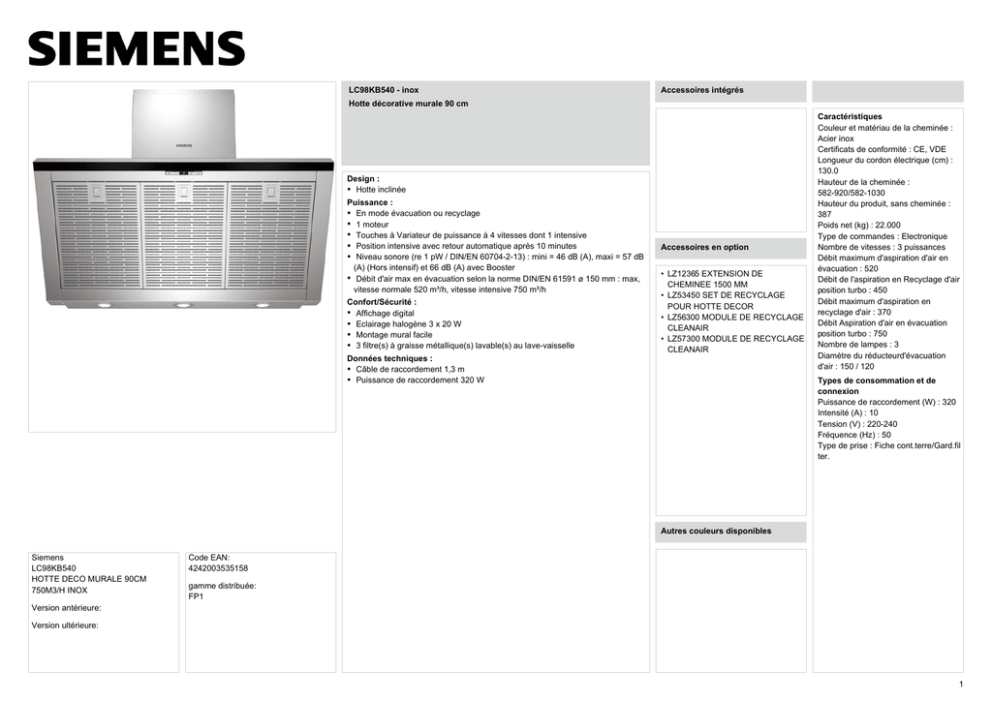 Siemens LC98KB540 HOTTE DECO MURALE 90CM
