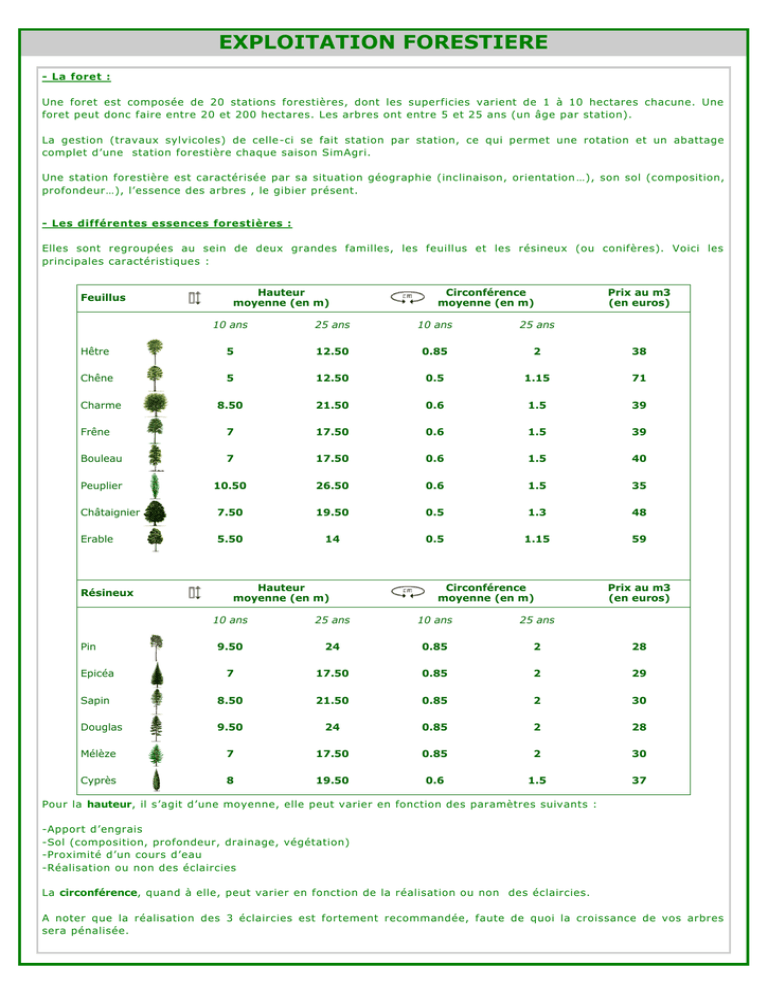 EXPLOITATION FORESTIERE - La foret : Une foret est composée de 20 stations forestières, dont les superficies varient de 1 à 10 hectares chacune. Une foret peut donc faire entre 20 et 200 hectares. Les arbres ont entre 5 et 25 ans (un âge par station). La gestion (travaux sylvicoles) de celle -ci se fait station par station, ce qui permet une rotation et un abattage complet d’une station forestière chaque saison SimAgri. Une station forestière est caractérisée par sa situation géographie (inclinaison, orientation …), son sol (composition, profondeur…), l’essence des arbres , le gibier présent. - Les différentes essences forestières : Elles sont regroupées au sein de deux grandes familles, les feuillus et les résineux (ou conifères). Voici les principales caractéristiques : Feuillus Hauteur moyenne (en m) Circonférence moyenne (en m) Prix au m3 (en euros) 10 ans 25 ans 10 ans 25 ans Hêtre 5 12.50 0.85 2 38 Chêne 5 12.50 0.5 1.15 71 8.50 21.50 0.6 1.5 39 Frêne 7 17.50 0.6 1.5 39 Bouleau 7 17.50 0.6 1.5 40 Peuplier 10.50 26.50 0.6 1.5 35 Châtaignier 7.50 19.50 0.5 1.3 48 Erable 5.50 14 0.5 1.15 59 Charme Résineux Hauteur moyenne (en m) Circonférence moyenne (en m) Prix au m3 (en euros) 10 ans 25 ans 10 ans 25 ans 9.50 24 0.85 2 28 Epicéa 7 17.50 0.85 2 29 Sapin 8.50 21.50 0.85 2 30 Douglas 9.50 24 0.85 2 28 Mélèze 7 17.50 0.85 2 30 Cyprès 8 19.50 0.6 1.5 37 Pin Pour la hauteur, il s’agit d’une moyenne, elle peut varier en fonction des paramètres suivants : -Apport d’engrais -Sol (composition, profondeur, drainage, végétation) -Proximité d’un cours d’eau -Réalisation ou non des éclaircies La circonférence, quand à elle, peut varier en fonction de la réalisation ou non des éclaircies. A noter que la réalisation des 3 éclaircies est fortement recommandée, faute de quoi la croissance de vos arbres sera pénalisée. EXPLOITATION FORESTIERE - Les travaux sylvicoles : La gestion d’une forêt requiert plusieurs travaux sylvicoles. Ces travaux vont permettre aux arbres de se développer correctement. -A la plantation : 1/ Broyage souche : s’effectue avec un broyeur lourd et un tracteur. 2/ Fertilisation : s’effectue avec un épandeur à engrais et un tracteur. 120 kilos d ’engrais par hectare. 3/ Labour : s’effectue avec un déchaumeur forestier et un tracteur. 4/ Mise en place des plants : s’effectue à la main. Il faut 1100 plants par hectare, et 0,05 PA pour planter un plant. 5/ Mise en place des protections gibiers : s ’effectue à la main. Il faut 0,08 PA pour placer une gaine et son tuteur (0,03 PA pour l’enlever) -Phase de croissance 6/ Broyage entre les lignes : s’effectue avec un broyeur et un tracteur, uniquement jusqu ’aux 10 ans des arbres. 7/ Taille de formation : s’effectue à la main, avec un kit taille et élagage, sur les arbres âgés de 6 ans. 0,04 PA par arbre taillé. 8/ Elagage 2 mètres : s’effectue à la main, avec un kit taille et élagage, sur 450 arbres âgés de 7 ans. 0,08 PA par arbre élagué. 9/ Elagage 4 mètres : s’effectue à la main, avec un kit taille et élagage, sur 450 arbres âgés de 8 ans. 0,10 PA par arbre élagué. 10/ Elagage 6 mètres : s’effectue à la main, avec un kit taille et élagage, sur 450 arbres âgés de 9 ans. 0,15 PA par arbre élagué. —>Ces différents travaux (6 à 10) influent sur la qualité du bois. Marquage d’éclaircie : s’effectue manuellement, avec un kit marquage. 3 marquages à effectuer : 11/ 1ère éclaircie : sur 550 arbres de 10 ans, 0.01 PA par arbre 12/ 2ème éclaircie : sur 192 arbres de 15 ans, 0,012 PA par arbre 13/ 3ème éclaircie : sur 125 arbres de 20 ans, 0,014 PA par arbre -Abattage : 14/ 1ère éclaircie : nécessite 3 matériels, une abatteuse, un débusqueur, un débardeur. 550 arbres couper. 15/ 2ème éclaircie : nécessite 3 matériels, une abatteuse, un débusqueur, un débardeur. 192 arbres couper. 16/ 3ème éclaircie : nécessite 3 matériels, une abatteuse, un débusqueur, un débardeur. 125 arbres couper. 17/ Coupe rase : nécessite 3 matériels, une abatteuse, un débusqueur, un débardeur. 233 arbres couper. de 10 ans à de 15 ans à de 20 ans à de 25 ans à Les arbres sont abattus avec l’abatteuse, transportés jusqu’à la piste forestière par le débusqueur. Le porteur forestier se charge de transporter les grumes jusqu’à la place de dépôt, en utilisant la piste forestière. Enfin les grumes sont transportés par un camion, qui utilise la route forestière. -Entretien infrastructures : 18/ Entretien piste forestière : 2 entretiens annuels, à l ’aide d’une débroussailleuse à bras et d’un tracteur. 19/ Entretien route forestière : 2 entretiens annuels, à l ’aide d’une débroussailleuse à bras et d’un tracteur. 20/ Entretien place de dépôt : 2 entretiens annuels, à l ’aide d’une débroussailleuse à bras et d’un tracteur. —>Ces travaux (18 à 20) influencent le temps de trajet pour les porteurs forestiers et camions. Les temps nécessaires pour réaliser les travaux sylvicoles sont aussi influencés par la situation de la station forestière (versant, pente, sommet…), ainsi que son inclinaison. A noter que si la station est située dans une cuvette, ou qu ’un cours d’eau passe à proximité, un risque d’enlisement est possible pour les travaux mécanisés. EXPLOITATION FORESTIERE - Les essences possibles par pays : Comme on l’a vu, il existe plusieurs essences forestières. En fonction de votre pays (serveur sur lequel vous jouez), et de l’implantation de votre exploitation agricole (zone climatique dont dépend votre région), vous pourrez peut être planter certaines essences, et pas d ’autres. France Canada Feuillus Hêtre Chêne Charme Frêne Bouleau Peuplier Châtaignier Erable Résineux Pin Epicéa Sapin Douglas Mélèze Cyprès France Nord-Ouest France Nord-Est France Sud-Est France Sud-Ouest Canada Nord-Ouest Canada Nord-Est EXPLOITATION FORESTIERE 