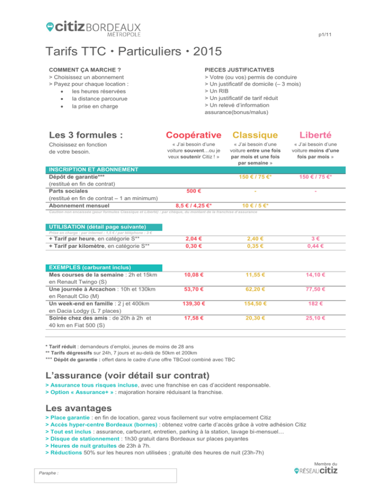 p1/11 Tarifs TTC Particuliers 2015 COMMENT ÇA MARCHE ? > Choisissez un abonnement > Payez pour chaque location : les heures réservées la distance parcourue la prise en charge PIECES JUSTIFICATIVES > Votre (ou vos) permis de conduire > Un justificatif de domicile (– 3 mois) > Un RIB > Un justificatif de tarif réduit > Un relevé d’information assurance(bonus/malus) Les 3 formules : Coopérative Classique Liberté Choisissez en fonction de votre besoin. « J’ai besoin d’une voiture souvent…ou je veux soutenir Citiz ! » « J’ai besoin d’une voiture entre une fois par mois et une fois par semaine » « J’ai besoin d’une voiture moins d’une fois par mois » 150 € / 75 €* 150 € / 75 €* 500 € - - 8,5 € / 4,25 €* 10 € / 5 €* INSCRIPTION ET ABONNEMENT Dépôt de garantie*** (restitué en fin de contrat) Parts sociales (restitué en fin de contrat – 1 an minimum) Abonnement mensuel Caution non encaissée (pour formules Classique et Liberté) : par chèque, du montant de la franchise d’assurance UTILISATION (détail page suivante) Prise en charge : par internet : 1,5 € / par téléphone : 3 € + Tarif par heure, en catégorie S** + Tarif par kilomètre, en catégorie S** EXEMPLES (carburant inclus) Mes courses de la semaine : 2h et 15km en Renault Twingo (S) Une journée à Arcachon : 10h et 130km en Renault Clio (M) Un week-end en famille : 2 j et 400km en Dacia Lodgy (L 7 places) Soirée chez des amis : de 20h à 2h et 40 km en Fiat 500 (S) 2,04 € 0,30 € 2,40 € 0,35 € 3€ 0,44 € 10,08 € 11,55 € 14,10 € 53,70 € 62,20 € 77,50 € 139,30 € 154,50 € 182 € 17,58 € 20,30 € 25,10 € * Tarif réduit : demandeurs d’emploi, jeunes de moins de 28 ans ** Tarifs dégressifs sur 24h, 7 jours et au-delà de 50km et 200km *** Dépôt de garantie : offert dans le cadre d’une offre TBCool combiné avec TBC L’assurance (voir détail sur contrat) > Assurance tous risques incluse, avec une franchise en cas d’accident responsable. > Option « Assurance+ » : majoration horaire réduisant la franchise. Les avantages > Place garantie : en fin de location, garez vous facilement sur votre emplacement Citiz > Accès hyper-centre Bordeaux (bornes) : obtenez votre carte d’accès grâce à votre adhésion Citiz > Tout est inclus : assurance, carburant, entretien, parking à la station, lavage bi-mensuel… > Disque de stationnement : 1h30 gratuit dans Bordeaux sur places payantes > Heures de nuit gratuites de 23h à 7h. > Réductions 50% sur les heures non utilisées ; gratuité des heures de nuit (23h-7h) Membre du Paraphe : p2/11 Détail des tarifs Formule Coopérative Catégorie 1 h. S 2,04 € M 2,30 € L 2,56 € Tarif horaire 24h. 7 jours 24,50 € 135 € 27,60 € 152 € 30,80 € 170 € km ≤ 50 0,30 € 0,30 € 0,34 € Tarif kilométrique 50<Km<200 200<Km 0,21 € 0,16 € 0,18 € 0,13 € 0,21 € 0,16 € Formule Classique Catégorie 1 h. S 2,40 € M 2,70 € L 3€ Tarif horaire 24h. 7 jours 28,80 € 159 € 32,40 € 179 € 36 € 198 € km ≤ 50 0,35 € 0,35 € 0,40 € Tarif kilométrique 50<Km<200 200<Km 0,24 € 0,18 € 0,21 € 0,15 € 0,24 € 0,18 € Formule Liberté Catégorie 1 h. S 3€ M 3,38 € L 3,70 € Tarif horaire 24h. 36 € 40,60 € 45 € 7 jours 198 € 224 € 248 € Tarif kilométrique km ≤ 50 50<Km<200 0,44 € 0,30 € 0,44 € 0,27 € 0,50 € 0,30 € 200<Km 0,23 € 0,19 € 0,23 € Option rachat de franchise (150€ de franchise au lieu de 600€) 1 h. 24h. 7 jours Assurance+ +0,24 € +3 € +16 € Exemples de véhicules S : « Citadines », type Renault Twingo ou Fiat 500 / M : « Polyvalentes », type Renault Clio ou Toyota Yaris / L : « Ludospaces » « Utilitaires » « Familales », type Renault Kangoo ou Dacia Lodgy 7 places Combinez votre abonnement Tram/Bus + Citiz Sur la CUB, profitez de TBCool : pour les + de 28 ans : 36€ / mois au lieu de 45€…. + dépôt de garantie offert (150€) pour les – de 28 ans : 22€50 / mois… + dépôt de garantie offert (75€) La coopérative Autocool : participez ! Citiz Bordeaux Métropole est géré et développé par la Société coopérative d’intérêt collectif (SCIC) Autocool, créée en 2008. Le capital de cette société à but non lucratif est détenu par ses utilisateurs, partenaires, salariés et plusieurs partenaires publics, répartis dans cinq collèges et représentées au sein du Conseil d’Administration (CA) : Collège Voix à l'AG Sièges au CA Utilisateurs 30% 4 Opérateurs de transport 25% 2 Partenaires 20% 3 Collectivités publiques 15% 2 Salariés 10% 1 En souscrivant une ou plusieurs parts sociales de 500 €, vous soutenez l’autopartage sur la CUB. Avec 20 parts sociales, la coopérative peut financer un nouveau véhicule ! Vous participerez également à la vie de la structure, qui réunit une fois par an ses sociétaires en Assemblée générale (AG). Membre du Paraphe : p3/11 Frais supplémentaires FRAIS AUTOMATIQUES Annulation d’une réservation moins de 4 heures avant son début 4,50 € Non-respect du minimum d’essence (1/4 du réservoir) 15 € Restitution en retard d’un véhicule (+ tarif horaire + dommages causés aux utilisateurs suivants ex: taxi) (frais cumulatifs : forfait + majoration horaire) 10 € par heure FRAIS ADMNISTRATIFS Perte de la carte Citiz 20 € Réexpédition, relance ou paiement d’une amende 10 € Frais de rejet de prélèvement, chèque impayé 15 € MAUVAISE UTILISATION VEHICULE Véhicule rendu anormalement sale à l’intérieur (tâches, détritus, poils d’animaux…) ou à l’extérieur (quantité importante de boue, salissure non liée aux intempéries, traces sur les vitres...) 15 € ou refacturation frais réels Non-respect de l’interdiction de fumer 10 € Oubli de l’état des lieux de départ ou non signalement de l’absence de fiche d’état des lieux 20 € FRAIS D’INTERVENTION SUR VEHICULE Intervention et déplacement d