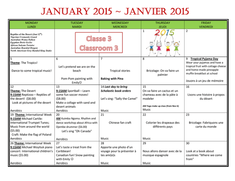 JANUARY 2015 ~ JANVIER 2015 MONDAY LUNDI TUESDAY MARDI WEDNESDAY MERCREDI THURSDAY JEUDI FRIDAY VENDREDI 1 2 8 9 Tropical Pyjama Day Reptiles of the Desert (Jan 12th) Nigerian Uromastix Lizard Australian Woma Python Egyptian Dorie Gecko African Sulcata Tortoise Australian Bearded Dragon North American Grey Banded King Snake 5 Theme: The Tropics! Dance to some tropical music! 6 7 Let’s pretend we are on the beach Pom-Pom painting with Emily 12 Theme: The Desert 9:15AM Reptizoo – Reptiles of the desert! ($8.00) Look at pictures of the desert Aerobics 19 Theme: International Week 9:15AM Michael Cartile: International Trumpet Tunes; Music from around the world ($5.00) Craft: Make the flag of Poland Aerobics 26 Theme: International Week 9:15AM Michael Woytiuk piano concert: International children’s music ($5.00) Aerobics 13 9:15AM Sportball – Learn some fun soccer moves! ($8.00) Make a collage with sand and desert animals Aerobics 20 Tropical stories Bricolage: On va faire un palmier Baking with Pina 14 Last day to bring Scholastic book orders Let’s sing: “Sally the Camel” Wear your pyjamas and have a tropical fruit with cottage cheese and home-made pineapple muffin breakfast at school Jouons à un jeu de mémoire 15 On va faire un cactus et un chameau avec de la pâte à modeler 16 Lisons une histoire à propos du désert AM Yoga make up class (from Nov 6) Music Music 21 AM Kuimba Ngoma. Rhythm and dance workshop about Africa with Djembe drummer ($6.00) 22 Chinese fan craft Colorier les drapeaux des différents pays 23 Bricolage: Fabriquons une carte du monde Let’s sing “Oh Canada” Aerobics 27 Let’s taste a treat from the Caribbean! Canadian fun! Snow painting with Emily Aerobics Music 28 Apporte une photo d’un voyage pour la présenter à tes ami(e)s Music 29 Music Music Nous allons danser avec de la musique espagnole 30 Look at a book about countries “Where we come from”