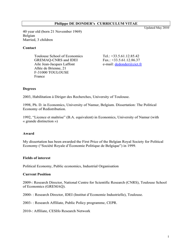 Philippe DE DONDER’s CURRICULUM VITAE Updated May 2010 40 year old (born 21 November 1969) Belgian Married, 3 children Contact Toulouse School of Economics GREMAQ-CNRS and IDEI Aile Jean-Jacques Laffont Allée de Brienne, 21 F-31000 TOULOUSE France Tel.: +33.5.61.12.85.42 Fax.: +33.5.61.12.86.37 e-mail: [email protected] Degrees 2003, Habilitation à Diriger des Recherches, University of Toulouse. 1998, Ph. D. in Economics, University of Namur, Belgium. Dissertation: The Political Economy of Redistribution. 1992, “Licence et maîtrise” (B.A. equivalent) in Economics, University of Namur (with « grande distinction ») Award My dissertation has been awarded the First Price of the Belgian Royal Society for Political Economy (“Société Royale d’Économie Politique de Belgique”) in 1999. Fields of interest Political Economy, Public economics, Industrial Organisation Current Position 2009-: Research Director, National Centre for Scientific Research (CNRS), Toulouse School of Economics (GREMAQ). 2000- : Research Director, IDEI (Institut d’Economie Industrielle), Toulouse. 2003- : Research Affiliate, Public Policy programme, CEPR. 2010-: Affiliate, CESIfo Research Network 1 Past Positions 2009: Acting Director of GREMAQ (one of the three research centres within Toulouse School of Economics). 2007-2008: Visiting Associate Professor, Yale University, USA 2001-2008: Research fellow (“Chargé de recherches”), National Centre for Scientific Research (CNRS), Toulouse School of Economics. 2000-2001: Visiting Assistant Professor of Political Economy, Wallis Institute of Political Economy, University of Rochester, USA. 1998-2001: Assistant Professor of Economics, University of Toulouse Editorial Activities 2007- : Editorial Board Member, Journal of Regulatory Economics. Refereeing American Economic Review, Annales d’Economie et de Statistique, Annals of Public and Cooperative Economics, B.E. Journal in Economic Analysis & Policy, B.E. Journal in Macroeconomics, Canadian Journal of Economics, Economics of Governance, Economic Theory, Economics Bulletin, Economie Publique, FinanzArchiv, Fiscal Studies, Geneva Risk and Insurance Review, German Economic Review, Information Economics and Policy, International Journal of the Economics of Business, Journal of Economic Behavior and Organization, Journal of Economic Theory, Journal of Economics, Journal of the European Economic Association, Journal of Public Economics, Journal of Public Economic Theory, Journal of Regulatory Economics, Mathematical Social Sciences, Public Choice, RAND Journal of Economics, Recherches Economiques de Louvain/ Louvain Economic Review, Review of Economic Studies, Review of Network Economics, Revue d’Economie Politique, Scandinavian Journal of Economics, Social Choice & Welfare, Theoretical Economics, Theory and Decision. Published papers REFEREED JOURNALS 1. H. Cremer, Ph. De Donder, D. Maldonado and P. Pestieau “Taxing Sin Goods and Subsidizing Health Care”, The Scandinavian Journal of Economics, forthcoming. 2. G. Casamatta, H. Cremer and Ph. De Donder, “Repeated Electoral Competition over NonLinear Income Tax Schedules”, Social Choice & Welfare, forthcoming. 2 3. Cremer H., Ph. De Donder and P. Pestieau, “Education and Social Mobility”, International Tax and Public Finance, forthcoming. 4. Anesi V. and Ph. De Donder, “Secondary Issues and Party Politics. An Application to Environmental Policy”, Social Choice and Welfare, forthcoming. 5. Besfamille M., Ph. De Donder and J.-M. Lozachmeur, “Tax enforcement may decrease government revenue”, Economics Bulletin, 2009, 29(4), 2669-2676. 6. De Donder Ph., Cremer H., Dudley P. and Rodriguez F., “On the Value Added Taxation Status of National Postal Operators”, Review of Network Economics, 2009, 8-3, 233-254. 7. Anesi V. and Ph. De Donder, “Party Formation and Minority Ideological Positions”, The Economic Journal, 2009, 119-540, 1303-1323. 8. Cremer H., De Donder Ph., Maldonado D. and Pestieau P., “Forced Saving, Redistribution and Non Linear Social Security Scheme”, Southern Economic Journal, 2009, 76-1, 86-98. 9. De Donder Ph. and J. Roemer, “Mixed oligopoly equilibria with endogenous firms’ objectives”, International Journal of Industrial Organization, 2009, 27 (3), 414-423. 10. De Donder Ph. and J. Hindriks, “Adverse Selection, Moral Hazard, and Propitious Selection”, Journal of Risk and Uncertainty, 2009, 38 (1), 73-86. 11. De Donder Ph., Cremer H., Dudley P. and Rodriguez F., « Price Controls in the Postal Sector: A Welfare Analysis of Alternative Control Structures», Review of Network Economics, 2008, 7 (2), 247 – 271. 12. Cremer H., De Donder Ph. and Gahvari F., « Political Competition within and between Parties: An Application to Environmental Policy », Journal of Public Economics, 2008, 92 (3-4), 532-547. 13. Cremer H., Ph. De Donder, D. Maldonado and P. Pestieau, “Designing a linear pension scheme with forced savings and wage heterogeneity”, International Tax and Public Finance, 2008, 15-5 : 547-562. 14. Cremer H., Crémer J. and De Donder Ph., « Costs and Benefits of Vertical Divestiture », Communications & Strategies, 2007, 68-4, 41-56. 15. Cremer H., De Donder Ph. and Gahvari F., « Energy Taxes in Three Political Economy Models », The B.E. Journal of Economic Analysis & Policy, 2007, Vol. 7 : Iss. 1 (Advances), Article 32. 16. Cremer H., Ph. De Donder, D. Maldonado and P. Pestieau, “Voting over the Size and Type of Social Security when some Individuals are Myopic”, Journal of Public Economics, 2007, 91-10: 2041-2061. 17. De Donder Ph. and J. Hindriks, « Equilibrium Social Insurance with Policy-Motivated Parties », European Journal of Political Economy, 2007, 23-3: 624-640. 3 18. De Donder Ph., « Access Pricing in the Postal Sector: Theory and Simulations », Review of Industrial Organization, 2006, 28-3: 307-326 19. Casamatta G. and De Donder Ph., « On the influence of extreme parties in el