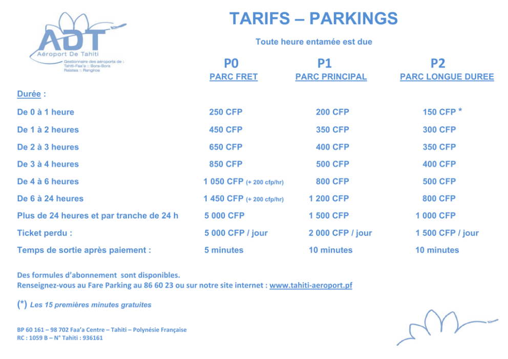 TARIFS – PARKINGS Toute heure entamée est due P0 P1 P2 PARC FRET PARC PRINCIPAL PARC LONGUE DUREE Durée : De 0 à 1 heure 250 CFP 200 CFP 150 CFP * De 1 à 2 heures 450 CFP 350 CFP 300 CFP De 2 à 3 heures 650 CFP 400 CFP 350 CFP De 3 à 4 heures 850 CFP 500 CFP 400 CFP De 4 à 6 heures 1 050 CFP (+ 200 cfp/hr) 800 CFP 500 CFP De 6 à 24 heures 1 450 CFP (+ 200 cfp/hr) 1 200 CFP 800 CFP Plus de 24 heures et par tranche de 24 h 5 000 CFP 1 500 CFP 1 000 CFP Ticket perdu : 5 000 CFP / jour 2 000 CFP / jour 1 500 CFP / jour Temps de sortie après paiement : 5 minutes 10 minutes 10 minutes Des formules d’abonnement sont disponibles. Renseignez‐vous au Fare Parking au 86 60 23 ou sur notre site internet : www.tahiti‐aeroport.pf (*) Les 15 premières minutes gratuites BP 60 161 – 98 702 Faa’a Centre – Tahiti – Polynésie Française RC : 1059 B – N° Tahiti : 936161