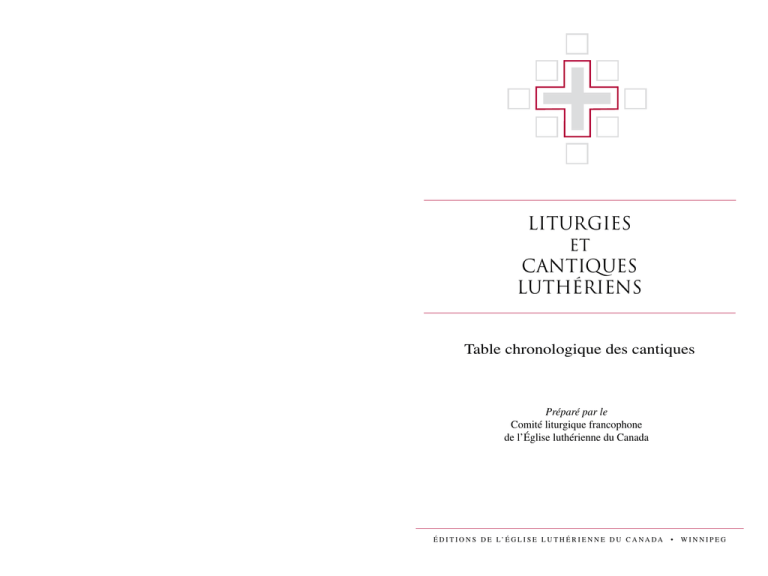 LITURGIES ET CANTIQUES LUTHÉRIENS Table chronologique des cantiques Préparé par le Comité liturgique francophone de l’Église luthérienne du Canada É d i t i o n s d e l’ É g l i s e l u t h é r i e n n e d u C a n a d a • Winnipeg TABLE CHRONOLOGIQUE DES CANTIQUES LES PÈRES DE L’ÉGLISE « Liturgies et cantiques luthériens » Poète Pays 308 . . . Viens, Rédempteur des nations . . . . . . . . . . . . Ambroise de Milan . . . . . . . . . . . . . . . . . . . . . . . . . . . . Italie 327 . . . Du point où le soleil renaît . . . . . . . . . . . . . . . SEDULIUS, Coelius . . . . . . . . . . . . . . . . . . . . . . . . . . . Italie 347 . . . Des lieux où le soleil renaît . . . . . . . . . . . . . . . SEDULIUS, Coelius . . . . . . . . . . . . . . . . . . . . . . . . . . . Italie 357 . . . Pourquoi, Hérode, prends-tu peur . . . . . . . . . . SEDULIUS, Coelius . . . . . . . . . . . . . . . . . . . . . . . . . . . Italie 366 . . . Levons les yeux vers la lumière . . . . . . . . . . . PRUDENTIUS Clemens, Aurelius . . . . . . . . . . . . . Espagne 378 . . . Ce temps de jeûne, un temps de pleurs . . . . . . Grégoire le grand . . . . . . . . . . . . . . . . . . . . . . . . . . . . . . Italie 397 . . . Chante, langue, la bataille . . . . . . . . . . . . . . . . FORTUNAT, Venance . . . . . . . . . . . . . . . . . . . . . . . . France 433 . . . L’Esprit-Saint comble de faveurs . . . . . . . . . . Hilaire de Poitiers . . . . . . . . . . . . . . . . . . . . . . . . . . . France 506 . . . Ce jour, j’attache autour de moi . . . . . . . . . . . Patrick . . . . . . . . . . . . . . . . . . . . . . . . . . . . . . . . . . . . Irlande 523 . . . Toute chair fera silence . . . . . . . . . . . . . . . . . . Liturgie de saint Jacques . . . . . . . . . . . . . . . . . . . . . . . . Syrie 533 . . . Au festin du saint Agneau . . . . . . . . . . . . . . . . latin . . . . . . . . . . . . . . . . . . . . . . . . . . . . . . . . . . . . . inconnu 693 . . . Déjà sous l’astre matinal . . . . . . . . . . . . . . . . . latin . . . . . . . . . . . . . . . . . . . . . . . . . . . . . . . . . . . . . inconnu 696 . . . Fuyez, ténènres de la nuit . . . . . . . . . . . . . . . . PRUDENTIUS Clemens, Aurelius . . . . . . . . . . . . . Espagne 697 . . . Reflet du Père et Créateur . . . . . . . . . . . . . . . . Ambroise de Milan . . . . . . . . . . . . . . . . . . . . . . . . . . . . Italie 699 . . . Dieu tout-puissant, seul juste et vrai . . . . . . . . Ambroise de Milan . . . . . . . . . . . . . . . . . . . . . . . . . . . . Italie 702 . . . Force et soutien du monde entier . . . . . . . . . . . Ambroise de Milan . . . . . . . . . . . . . . . . . . . . . . . . . . . . Italie 705 . . . Ô Christ Sauveur, Jour lumineux . . . . . . . . . . latin . . . . . . . . . . . . . . . . . . . . . . . . . . . . . . . . . . . . . inconnu 708 . . . Dieu, rayonnant dans ta splendeur . . . . . . . . . Grégoire le grand . . . . . . . . . . . . . . . . . . . . . . . . . . . . . . Italie 710 . . . Avant le terme de ce jour . . . . . . . . . . . . . . . . . latin . . . . . . . . . . . . . . . . . . . . . . . . . . . . . . . . . . . . . inconnu 711 . . . Joyeuse lumière . . . . . . . . . . . . . . . . . . . . . . . . grec . . . . . . . . . . . . . . . . . . . . . . . . . . . . . . . . . . . . . . . . Grèce 712 . . . Toi qui es trois en l’Unité . . . . . . . . . . . . . . . . Ambroise de Milan . . . . . . . . . . . . . . . . . . . . . . . . . . . . Italie 738 . . . À toi, Dieu, notre louange . . . . . . . . . . . . . . . . latin . . . . . . . . . . . . . . . . . . . . . . . . . . . . . . . . . . . . . inconnu LE MOYEN ÂGE « Liturgies et cantiques luthériens » Poète Pays 318 . . . Une voix retentissante . . . . . . . . . . . . . . . . . . latin . . . . . . . . . . . . . . . . . . . . . . . . . . . . . . . . . . . . . . . inconnu 322 . . . Maître des astres et du temps . . . . . . . . . . . . . latin . . . . . . . . . . . . . . . . . . . . . . . . . . . . . . . . . . . . . . . inconnu 328 . . . Ô viens, ô viens, Emmanuel . . . . . . . . . . . . . latin . . . . . . . . . . . . . . . . . . . . . . . . . . . . . . . . . . . . . . . inconnu 330 . . . Un rejeton fidèle . . . . . . . . . . . . . . . . . . . . . . allemand . . . . . . . . . . . . . . . . . . . . . . . . . . . . . . . . Allemagne 335 . . . Entre le bœuf et l’âne gris . . . . . . . . . . . . . . . français . . . . . . . . . . . . . . . . . . . . . . . . . . . . . . . . . . . . . France 346 . . . Loué sois-tu, Seigneur Jésus . . . . . . . . . . . . . allemand . . . . . . . . . . . . . . . . . . . . . . . . . . . . . . . . Allemagne 348 . . . Chantez à haute voix . . . . . . . . . . . . . . . . . . . latin et allemand . . . . . . . . . . . . . . . . . . . . . . . . . . Allemagne 369 . . . Je te contemple, ô Splendeur sainte . . . . . . . . SUSO, Heinrich . . . . . . . . . . . . . . . . . . . . . . . . . . Allemagne 375 . . . Aide-nous, ô Fils de Dieu . . . . . . . . . . . . . . . Aegidius de Colonna . . . . . . . . . . . . . . . . . . . . . . . . . . France 387 . . . Honneur, gloire et louange . . . . . . . . . . . . . . Théodulfe d’Orléans . . . . . . . . . . . . . . . . . . . . . . . . . . . France 393 . . . Chef couvert de blessures . . . . . . . . . . . . . . . Bernard de Clairvaux . . . . . . . . . . . . . . . . . . . . . . . . . . France 395 . . . Ô Dieu saint, ô Dieu fort . . . . . . . . . . . . . . . . latin . . . . . . . . . . . . . . . . . . . . . . . . . . . . . . . . . . . . . . . inconnu 399 . . . Aujourd’hui Christ est vivant . . . . . . . . . . . . latin . . . . . . . . . . . . . . . . . . . . . . . . . . . . . . . . . . . . . . . inconnu 401 . . . Christ, le Ressuscité . . . . . . . . . . . . . . . . . . . allemand . . . . . . . . . . . . . . . . . . . . . . . . . . . . . . . . Allemagne 412 . . . Le Roi de la terre et des cieux . . . . . . . . . . . . TISSERAND, Jean . . . . . . . . . . . . . . . . . . . . . . . . 
