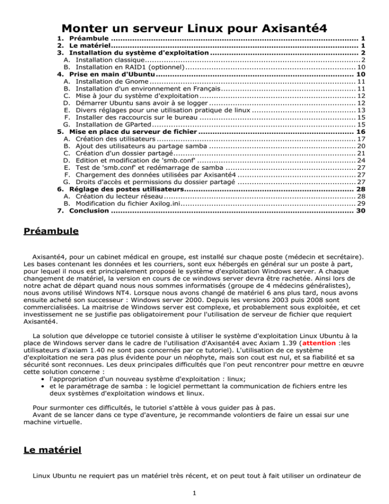 Monter un serveur Linux pour Axisanté4 1. Préambule ......................................................................................................... 1 2. Le matériel......................................................................................................... 1 3. Installation du système d'exploitation ............................................................... 2 A. Installation classique........................................................................................... 2 B. Installation en RAID1 (optionnel)........................................................................ 10 4. Prise en main d'Ubuntu.................................................................................... 10 A. Installation de Gnome ....................................................................................... 11 B. Installation d'un environnement en Français......................................................... 11 C. Mise à jour du système d'exploitation .................................................................. 12 D. Démarrer Ubuntu sans avoir à se logger .............................................................. 12 E. Divers réglages pour une utilisation pratique de linux ............................................ 13 F. Installer des raccourcis sur le bureau .................................................................. 15 G. Installation de GParted...................................................................................... 15 5. Mise en place du serveur de fichier .................................................................. 16 A. Création des utilisateurs .................................................................................... 17 B. Ajout des utilisateurs au partage samba .............................................................. 20 C. Création d'un dossier partagé............................................................................. 21 D. Edition et modification de 'smb.conf' ................................................................... 24 E. Test de 'smb.conf' et redémarrage de samba ....................................................... 27 F. Chargement des données utilisées par Axisanté4 .................................................. 27 G. Droits d'accès et permissions du dossier partagé .................................................. 27 6. Réglage des postes utilisateurs........................................................................ 28 A. Création du lecteur réseau ................................................................................. 28 B. Modification du fichier Axilog.ini.......................................................................... 29 7. Conclusion ....................................................................................................... 30 Préambule Axisanté4, pour un cabinet médical en groupe, est installé sur chaque poste (médecin et secrétaire). Les bases contenant les données et les courriers, sont eux hébergés en général sur un poste à part, pour lequel il nous est principalement proposé le système d'exploitation Windows server. A chaque changement de matériel, la version en cours de ce windows server devra être rachetée. Ainsi lors de notre achat de départ quand nous nous sommes informatisés (groupe de 4 médecins généralistes), nous avons utilisé Windows NT4. Lorsque nous avons changé de matériel 6 ans plus tard, nous avons ensuite acheté son successeur : Windows server 2000. Depuis les versions 2003 puis 2008 sont commercialisées. La maitrise de Windows server est complexe, et probablement sous exploitée, et cet investissement ne se justifie pas obligatoirement pour l'utilisation de serveur de fichier que requiert Axisanté4. La solution que développe ce tutoriel consiste à utiliser le système d'exploitation Linux Ubuntu à la place de Windows server dans le cadre de l'utilisation d'Axisanté4 avec Axiam 1.39 (attention :les utilisateurs d'axiam 1.40 ne sont pas concernés par ce tutoriel). L'utilisation de ce système d'exploitation ne sera pas plus évidente pour un néophyte, mais son cout est nul, et sa fiabilité et sa sécurité sont reconnues. Les deux principales difficultés que l'on peut rencontrer pour mettre en œuvre cette solution concerne : • l'appropriation d'un nouveau système d'exploitation : linux; • et le paramétrage de samba : le logiciel permettant la communication de fichiers entre les deux systèmes d'exploitation windows et linux. Pour surmonter ces difficultés, le tutoriel s'attèle à vous guider pas à pas. Avant de se lancer dans ce type d'aventure, je recommande volontiers de faire un essai sur une machine virtuelle. Le matériel Linux Ubuntu ne requiert pas un matériel très récent, et on peut tout à fait utiliser un ordinateur de 1 quelques années, d'autant plus qu'on va l'utiliser comme serveur de fichier pour un nombre de clients (utilisateurs) réduit (<10 pour la plupart) Toutefois, il est raisonnable d'avoir un matériel conçu pour fonctionner 24h/24 adapté à l'utilisation de serveur. Pour ma part, j'ai opté pour le serveur Dell T105, que l'on trouve actuellement pour un prix raisonnable. Je l'ai choisi avec une puce dual core, 2*1 Go de RAM, et 2 disques durs SATA de 250 Go sans carte raid. Il est vendu sans écran, mais il suffit d'utiliser celui du précédent serveur. Installation du système d'exploitation J'ai choisi d'installer Ubuntu 8.04.1 LTS dans sa version server pour ordinateur 64 bits (le Dell T105 étant en 64 bits): http://fr.releases.ubuntu.com/hardy/ . Cette version installe le noyau Linux et les logiciels nécessaires à l'utilisation que l'on a choisit. Installation classique Pour débuter, il faut mettre le CD dans le lecteur, puis redémarrer l'ordinateur en ayant pris soin auparavant de régler le BIOS sur un démarrage qui boote en premier sur le CD (voir ici : http://www.pcentraide.com/index.php?sh