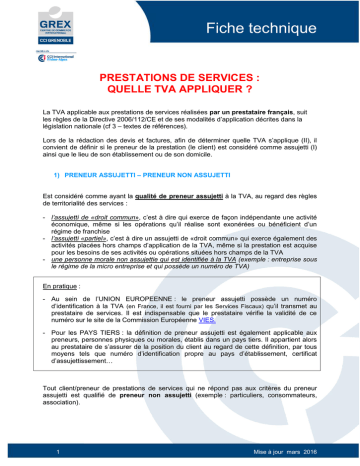 Fiche technique PRESTATIONS DE SERVICES : QUELLE TVA APPLIQUER ? La TVA applicable aux prestations de services réalisées par un prestataire français, suit les règles de la Directive 2006/112/CE et de ses modalités d’application décrites dans la législation nationale (cf 3 – textes de références). Lors de la rédaction des devis et factures, afin de déterminer quelle TVA s’applique (II), il convient de définir si le preneur de la prestation (le client) est considéré comme assujetti (I) ainsi que le lieu de son établissement ou de son domicile. 1) PRENEUR ASSUJETTI – PRENEUR NON ASSUJETTI Est considéré comme ayant la qualité de preneur assujetti à la TVA, au regard des règles de territorialité des services : - l’assujetti de «droit commun», c’est à dire qui exerce de façon indépendante une activité économique, même si les opérations qu’il réalise sont exonérées ou bénéficient d’un régime de franchise - l’assujetti «partiel», c’est à dire un assujetti de «droit commun» qui exerce également des activités placées hors champs d’application de la TVA, même si la prestation est acquise pour les besoins de ses activités ou opérations situées hors champs de la TVA - une personne morale non assujettie qui est identifiée à la TVA (exemple : entreprise sous le régime de la micro entreprise et qui possède un numéro de TVA) En pratique : - Au sein de l’UNION EUROPEENNE : le preneur assujetti possède un numéro d’identification à la TVA (en France, il est fourni par les Services Fiscaux) qu’il transmet au prestataire de services. Il est indispensable que le prestataire vérifie la validité de ce numéro sur le site de la Commission Européenne VIES. - Pour les PAYS TIERS : la définition de preneur assujetti est également applicable aux preneurs, personnes physiques ou morales, établis dans un pays tiers. Il appartient alors au prestataire de s’assurer de la position du client au regard de cette définition, par tous moyens tels que numéro d’identification propre au pays d’établissement, certificat d’assujettissement… Tout client/preneur de prestations de services qui ne répond pas aux critères du preneur assujetti est qualifié de preneur non assujetti (exemple : particuliers, consommateurs, association). 1 Mise à jour mars 2016 Fiche technique 2) COMMENT DETERMINER LA TVA APPLICABLE AUX FACTURES EMISES PAR UNE ENTREPRISE ETABLIE EN FRANCE ? Preneur assujetti : lieu d’imposition à la TVA = lieu d’établissement du preneur a) Principe général Le principe applicable aux prestations de services rendues à un client/preneur assujetti stipule que la prestation est taxable à l’endroit où cet assujetti a établi le siège de son activité économique ou, si les services sont fournis à un établissement stable situé en un lieu autre que l’endroit où l’assujetti a établi le siège de son activité, l’endroit où cet établissement stable est situé (Article 259 1° du CGI ou Article 44 de la directive 2006/112/CE). Par conséquent : - si le preneur assujetti est établi en France => la facture fait mention de la TVA française - si le preneur assujetti est établi dans un autre Etat membre de l’Union européenne => la facture ne fait pas mention de la TVA exigible. L’acheteur/preneur assujetti est redevable : il doit déclarer et acquitter la TVA de son Etat, directement auprès de son administration fiscale (autoliquidation). La facture doit porter la mention « autoliquidation ». Le prestataire doit établir un état récapitulatif mensuel, dès le premier €uro de facturation : la «déclaration européenne de services» ou «DES». Cette déclaration est produite, obligatoirement via le portail électronique de l’administration des douanes https://pro.douane.gouv.fr/, dans les dix jours ouvrables du mois qui suit celui au cours duquel la TVA est devenue exigible dans l’autre Etat membre. - si le preneur assujetti est établi dans un pays tiers à l’Union européenne => la facture ne fait pas mention de la TVA exigible. L’acheteur/preneur assujetti est redevable de la taxation applicable dans son pays, suivant les règles locales. La règlementation n’indique pas précisément que la facture doit faire mention de l’exonération. Toutefois il est recommandé de porter une mention indiquant que l’opération bénéficie d’une exonération en référence à l’Article 259 1° du CGI ou l’Article 44 de la directive 2006/112/CE. b) Les exceptions au principe général Les prestations indiquées ci-après dérogent à la règle générale et sont taxables suivant les règles spécifiques décrites : Prestations Lieu d’imposition Prestations rattachées à un immeuble => TVA du lieu où l’immeuble est situé (art.47 de la directive 2006/112/CE ou 259 A 2° du CGI) Transport de passagers (art. 48 de la directive 2006/112/CE ou 259 A 4° du CGI) 2 => TVA de l’endroit où s’effectue le transport en fonction des distances parcourues Commentaire : des régimes particuliers d’exonération prévus en matière de transports internationaux persistent (art. 262 II 8° à 10° du CGI) Mise à jour mars 2016 Fiche technique Prestations Prestation consistant à donner accès à des manifestations culturelles, artistiques, sportives, scientifiques, éducatives, de divertissement ou similaires. Lieu d’imposition => TVA du lieu où se déroulent effectivement ces manifestations. (art.53 de la directive 2006/112/CE ou 259 A 5°bis du CGI) Services de vente à consommer sur place (art. 55 & 57 de la directive 2006/112/CE ou 259 A 5°-b du CGI) Location de courte durée de moyens de transport : 90 jours pour transport maritime, 30 jours pour autres moyens de transports => TVA du lieu d’exécution matérielle de la prestation. Pour les prestations rendues à bord d‘un moyen de transport au cours d’un transport à l’intérieur de la Communauté : lieu de départ du transpor