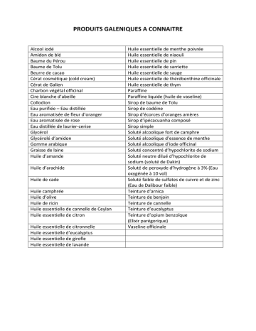 PRODUITS GALENIQUES A CONNAITRE Alcool iodé Amidon de blé Baume du Pérou Baume de Tolu Beurre de cacao Cérat cosmétique (cold cream) Cérat de Galien Charbon végétal officinal Cire blanche d’abeille Collodion Eau purifiée – Eau distillée Eau aromatisée de fleur d’oranger Eau aromatisée de rose Eau distillée de laurier-cerise Glycérol Glycérolé d’amidon Gomme arabique Graisse de laine Huile d’amande Huile d’arachide Huile de cade Huile camphrée Huile d’olive Huile de ricin Huile essentielle de cannelle de Ceylan Huile essentielle de citron Huile essentielle de citronnelle Huile essentielle d’eucalyptus Huile essentielle de girofle Huile essentielle de lavande Huile essentielle de menthe poivrée Huile essentielle de niaouli Huile essentielle de pin Huile essentielle de sarriette Huile essentielle de sauge Huile essentielle de thérébenthine officinale Huile essentielle de thym Paraffine Paraffine liquide (huile de vaseline) Sirop de baume de Tolu Sirop de codéine Sirop d’écorces d’oranges amères Sirop d’ipécacuanha composé Sirop simple Soluté alcoolique fort de camphre Soluté alcoolique d’essence de menthe Soluté alcoolique d’iode officinal Soluté concentré d’hypochlorite de sodium Soluté neutre dilué d’hypochlorite de sodium (soluté de Dakin) Soluté de peroxyde d’hydrogène à 3% (Eau oxygénée à 10 vol) Soluté faible de sulfates de cuivre et de zinc (Eau de Dalibour faible) Teinture d’arnica Teinture de benjoin Teinture de cannelle Teinture d’eucalyptus Teinture d’opium benzoïque (Elixir parégorique) Vaseline officinale