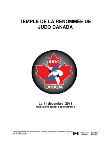 TEMPLE DE LA RENOMMÉE DE JUDO CANADA Le 11 décembre 2011 Ratifié par le conseil d’administration Les programmes de Judo Canada profitent en partie d’un soutien financier de Sport Canada TEMPLE DE LA RENOMMÉE DE JUDO CANADA OBJET 1. Reconnaître formellement les réalisations des judokas ayant représenté le Canada lors de compétitions ou de jeux internationaux d’envergure, et y ont obtenu des résultats exceptionnels. 2. Reconnaître formellement le dévouement, le leadership et les habiletés des personnes ayant fourni une contribution exceptionnelle au développement du judo au Canada, en leur qualité d’entraîneur ou d’arbitre. Il y aura deux catégories d’intronisation au Temple de la renommée de Judo Canada : Athlète et Bâtisseur. ATTESTATION Le Temple de la renommée de Judo Canada sera situé au bureau national, où une attestation des exploits des membres sera fournie aux fins de présentation au public. Le profil et les réalisations des membres du Temple de la renommée seront aussi fournis dans une section spéciale du site Web de Judo Canada. Chacun des membres recevra un certificat d’intronisation et une citation honorifique comprenant une photo personnelle et un résumé de ses réalisations. L’association provinciale de judo à laquelle le membre appartient recevra un duplicata de la citation honorifique. GOUVERNANCE Le conseil d’administration (c.a.) de Judo Canada nommera un président du comité des prix et de la reconnaissance, qui relèvera directement de lui. Le comité des prix et de la reconnaissance (le Comité) sera formé de trois membres du Temple de la renommée de Judo Canada et du président du c.a. Le directeur administratif de Judo Canada siègera d’office au Comité et y tiendra le rôle de secrétaire. INTRONISATION Les membres seront officiellement intronisés au Temple de la renommée dans un lieu et à une heure déterminés par le comité des prix et de la reconnaissance. En l’absence d’un événement spécial, l’intronisation peut se faire à l’occasion d’un Championnat canadien senior ou d’un événement international sanctionné par Judo Canada. 2 TEMPLE DE LA RENOMMÉE DE JUDO CANADA PROCÉDURE DE MISE EN CANDIDATURE 1. Les candidatures doivent être proposées par écrit auprès du directeur administratif et adressées au bureau national de Judo Canada, avant le 31 janvier. Le dossier de candidature doit réunir les documents suivants : - Formulaire de candidature - Formulaire d’admissibilité (Athlète ou Bâtisseur) - Une photo de 5 po x 7 po du candidat proposé Une citation facultative présentant les autres réalisations au judo et/ou les états de service ou les deux peut être jointe au dossier à titre d’information seulement. Le proposeur doit s’assurer que le candidat satisfait aux critères d’admissibilité précisés dans ce document. 2. Les candidatures peuvent être proposées par une personne (aucune libre candidature), un club, une association ou un membre du comité des prix et de la reconnaissance (ciaprès appelé le Comité). 3. Le directeur administratif fera parvenir une copie du dossier de candidature et de la recommandation reçus, de même que tous les documents justificatifs et le nom des différents proposeurs, aux membres du Comité, après la fin de la période de mise en candidature. 4. Le Comité examinera les candidatures et remettra une liste des candidats recommandés aux fins d’approbation par le conseil d’administration de Judo Canada. 5. Le nom des intronisés sera annoncé lors de l’assemblée générale annuelle de Judo Canada et les détails des candidatures seront fournis à l’assemblée. 6. Les intronisés au Temple de la renommée deviennent automatiquement membres à vie de Judo Canada. 7. Si le président du Comité n’est pas membre du Temple de la renommée, sa candidature ne pourra pas être proposée pendant son mandat ni pendant l’année qui suivra le fin de son mandat au Comité. 8. Le Comité a la responsabilité d’assurer le maintien de l’intégrité et de la qualité du Temple de la renommée. Le nombre de personnes intronisées au cours d’une année donnée est laissé à la discrétion du Comité. Le Comité n’a aucune obligation d’introniser des membres chaque année. 3 TEMPLE DE LA RENOMMÉE DE JUDO CANADA EXPULSION Un membre du Temple de la renommée peut en être expulsé pour une ou plusieurs des raisons suivantes : a) Violation de la constitution de Judo Canada ou de ses règlements b) Conduite allant à l’encontre du code d’éthique de Judo Canada c) Condamnation pour un acte susceptible de poursuite en justice selon les lois fédérales ou provinciales L’expulsion d’un membre du Temple de la renommée sera effectuée conformément à la procédure d’expulsion d’un membre de l’association précisée dans la constitution de l’association. CRITÈRES D’ADMISSIBILITÉ CATÉGORIE ATHLÈTE La catégorie « Athlète » rend hommage aux judokas canadiens ayant obtenu des résultats exceptionnels en compétition internationale de judo. Le candidat doit avoir respecté les critères suivants pour être admissible, et toutes les performances doivent avoir été réalisées alors que l’athlète représentait le Canada : a) Classement parmi les 5 premiers lors de Championnats du monde senior ou de Jeux olympiques. OU b) Médaillé lors de Jeux paralympiques ou de Championnats du monde des athlètes ayant un handicap visuel. OU c) A représenté le Canada lors de Jeux olympiques ET satisfait à au moins deux (2) des critères suivants : • Avoir terminé parmi les 7 premiers lors de championnats du monde seniors ou lors de Jeux olympiques. • Avoir remporté une médaille d’or lors d’un championnat panaméricain ou lors de Jeux panaméricains. • Avoir remporté une médaille d’or lors des Universiades ou lors de championnats du monde universitaires. • Avoir remporté au moins quatre (4) médaille