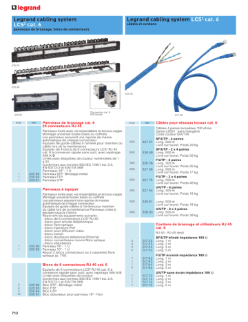 Legrand cabling system LCS2 cat. 6 Legrand cabling system LCS2 cat. 6 câbles et cordons panneaux de brassage, blocs de connecteurs 335 62 335 90 327 54 Connecteur cat. 6 STP blindé 335 65 Emb. 1 1 1 Réf. panneaux de brassage cat. 6 24 connecteurs rJ 45 Panneaux livrés avec vis imperdables et écrous-cages Montage universel toutes baies ou coffrets Les panneaux assurent une reprise de masse automatique de chaque connecteur Equipés de guide-câbles à l’arrière pour maintien du câble lors de la maintenance Equipés de 4 blocs de 6 connecteurs LCS2 RJ 45 cat. 6 à connexion rapide sans outil, avec repérage 568 A/B Livrés avec étiquettes de couleur numérotées de 1 à 24 Conformes aux normes ISO/IEC 11801 éd. 2.0, EN 50173-2 et EIA/TIA 568 Panneaux 19" - 1 U 335 63 Panneau STP- Blindage métal 335 62 Panneau FTP 335 61 Panneau UTP panneaux à équiper 1 1 Panneaux livrés avec vis imperdables et écrous-cages Montage universel toutes baies ou coffrets Les panneaux assurent une reprise de masse automatique de chaque connecteur Equipés de guide-câbles à l’arrière pour maintien du câble lors de la maintenance Panneaux vides à équiper jusqu'à 4 blocs Reçoivent les équipements suivants : - blocs de 6 connecteurs LCS2 RJ 45 - blocs pour arrivée téléphonique - blocs fibre optique - blocs injecteurs PoE - blocs pour diffusion vidéo - blocs switch - blocs doubleurs téléphone/Ethernet - blocs convertisseur cuivre/fibre optique - blocs obturateurs 335 90 Panneau 19" - 1 U 335 92 Panneau 10" - 1 U Reçoit 2 blocs connecteurs ou 2 cassettes fibre optique (p. 718) Blocs de 6 connecteurs rJ 45 cat. 6 2 2 2 10 712 335 66 335 65 335 64 335 91 Equipés de 6 connecteurs LCS2 RJ 45 cat. 6 à connexion rapide sans outil, avec repérage 568 A/B Livrés avec étiquettes de couleur Conformes aux normes ISO/IEC 11801 éd. 2.0, EN 50173-1 et EIA/TIA 568 Bloc STP - Blindage métal Bloc FTP Bloc UTP Bloc obturateur pour panneau 19" - Noir 517 62 Emb. Réf. Câbles pour réseaux locaux cat. 6 Câbles 4 paires torsadées 100 ohms Gaine LSOH : sans halogène Code couleur EIA/TIA sF/utp - 4 paires Long. 500 m Livré sur touret. Poids 29 kg sF/utp - 2 x 4 paires Long. 500 m Livré sur touret. Poids 52 kg F/utp - 4 paires Long. 305 m Livré sur touret. Poids 25 kg Long. 500 m Livré sur touret. Poids 17 kg F/utp - 2 x 4 paires Long. 500 m Livré sur touret. Poids 48 kg u/utp - 4 paires Long. 305 m Livré sur touret. Poids 16 kg 500 327 57 500 328 59 305 328 56 500 327 56 500 327 76 305 327 54 500 328 61 Long. 500 m Livré sur touret. Poids 18 kg u/utp - 2 x 4 paires 328 63 Long. 500 m Livré sur touret. Poids 38 kg 500 Cordons de brassage et utilisateurs rJ 45 cat. 6 RJ 45 - RJ 45 droit 5 5 5 5 517 52 517 53 517 54 517 55 sF/utp blindé impédance 100 Ω Long. 1 m Long. 2 m Long. 3 m Long. 5 m 1 1 1 5 517 62 517 63 517 64 517 65 F/utp écranté impédance 100 Ω Long. 1 m Long. 2 m Long. 3 m Long. 5 m 1 1 1 1 517 72 517 73 517 74 517 75 u/utp sans écran impédance 100 Ω Long. 1 m Long. 2 m Long. 3 m Long. 5 m