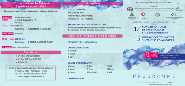 Informations 15ème Journée des Techniciens Supérieurs et Infirmiers Mise en route d’un accélérateur linéaire dans un service de Radiothérapie 08h00 - 9h00: 09h00 : Accueil des participants Le contrôle de qualité d’un TPS J.P. MEGE 09h00 - 10h30 :Session 1 Modérateurs : H. BOUSSETTA, M. BEN KHALIFA 10h30 - 11h00 : Pause Café Sous le Patronage de Monsieur le Ministre de la Santé Et l’égide des : ASSOCIATION DE PREVENTION ET DE LUTTE CONTRE LE CANCER DU CENTRE TUNISIEN Lieu du Congrès : ASSOCIATION DE RADIOTHERAPIE ET D’ONCOLOGIE DE LA MEDITERRANNEE Hôtel El Mouradi Palace Route Touristique Jinane El Kantaoui UNIVERSITE DE SOUSSE FACULTE DE MEDECINE SOUSSE Tél : 73 246 355 – Fax : 73 246 313 ORGANISE Inscription gratuite et obligatoire Pour la réservation de votre séjour à l’hôtel, contacter directement le service des réservations de l’hôtel (Demander le prix congrès) Comités scientifique et d’organisation Modérateurs : L. AMMAR, Ch. CHEHATA, Z. KHLIFI 13 heures : Clôture - Remise des prix Secrétariat M Valérie MABROUK KHEDHIRI me Mme Sana GHITH Ben ROMDHANE Mlle Latifa Tlili Service de Cancérologie Radiothérapie – C.H.U. Farhat Hached Avenue Ibn El Jazzar – 4000 Sousse – Tunisie Tél : 216 73 211 411 - Fax : 216 73 219 490 E-mail : [email protected] LABORATOIRE D’IMMUNOLOGIE MOLECULAIRE FACULTE DE MEDECINE MONASTIR LE SERVICE DE CANCEROLOGIE RADIOTHERAPIE DE SOUSSE 11h00 - 12h30 :Session 2 C.H.U FARHAT HACHED SOUSSE Président : Pr. N. Bouaouina 17 è 15 è CONGRES NATIONAL DE CANCEROLOGIE ET DE RADIOTHERAPIE JOURNEE DES TECHNICIENS SUPERIEURS ET INFIRMIERS Comité Scientifique : H. Boussetta 28 – 29 S. Kanoun Juin 2013 S. Tebra Hôtel El Mouradi Palace, Hammam Sousse Comité d’Organisation : A Aissaoui N. Gara Z. Khlifi N. Bouzid S. Ghith V. Mabrouk M. Daouas M. Ben Khalifa R. Saïdi Conférenciers : P R O G R A M M E Avec la participation des : • Groupe d’étude des tumeurs du cerveau (GETUC) • Groupe d’Oncologie du Centre Tunisien (GOCT) Vendredi 28 Juin 2013 Samedi 29 Juin 2013 08h00 : Inscription et accueil des participants 08h45 :Introduction Pr. N. Bouaouina 15h40 : Tumeurs gliales de haut grade : aspects en IRM multimodale. N. Mama, K. Tlili (Sousse) 08h00 - 09h00 : Session Jeunes Cancérologues Modérateurs : Y. BELKACEMI, N. BOUZID, R. RJIBA 09h00 - 12h30 :Session : Cancer du sein 16h00 : La prise en charge chirurgicale des gliomes de haut grade M. Ladib, H. Krifa (Sousse) 09h00 - 12h30 : Ateliers de radiothérapie : Tumeurs gliales Modérateurs : Philippe COLIN (Reims), Jean Pierre MEGE (Créreil) 16h30 - 16h50 : Pause Café 09h00 - 10h30 : Séance I : Carcinomes in situ du sein Modérateurs : H. KHAIRI, K.MALEK -C arcinome in situ du sein : de la morphologie à la biologie moléculaire. A. Ben Abdelkader, M. Mokni (Sousse) -R adiothérapie des carcinome in situ du sein Yazid Belkacemi (Créteil) 10h30 - 10h50 : Pause Café 10h50 - 12h30 : Séance II : Cancer du sein de «la biologie à la clinique» Modérateurs : L. CHOUCHANE, A. ZAKHAMA, M. BIBI 12h30 : Déjeuner 15h00 18h30 : Session : Tumeurs gliales de haut grade 15h00 - 16h30 : Séance I : Modérateurs : Ph. COLIN, Ch. KRAIEM,N.BOUAOUINA 15h00 : Subtyping of high grade glioma by genetics and epigenetics Chris Joens (Londre) 15h20 : istopathologie des tumeurs gliales de haut grade H T. Yacoubi (Sousse) 16h50 – 18h30 : Séance II : Modérateurs : L.KOCHBATI, S. MELLOULI 16h50 : La radiothérapie des tumeurs gliales Georges Noêl (Strasbourg) 17h20 : T raitement médical des gliomes de haut grade : actualités thérapeutiques I. Chabchoub, S. Ben Ahmed (Sousse) 17h40 : Gliomes de haut grade : étude rétrospective de 163 cas. H. Krifa, N. Karmani, S. Kanoun Belajouza, M. Ladib, N. Bouaouina 17h50 : lioblastome : une expérience tunisienne. G I. Zrafi, H. Zramdini, S. Tebra Mrad, N. Bouaouina 09h00 : Principes de délinéation des tumeurs gliales Philippe COLIN 09h15 - 10h30 : Séance I : Atelier de radiothérapie Tumeurs gliales de haut grade : A. HAMROUNI, S. KANOUN BELAJOUZA, D. HENTATI ; L.AMMAR 10h 30-11h : Pause Café 11h – 12h 30 : Séance II : Atelier de radiothérapie Tumeurs gliales de bas grade : M. Ben MRAD, W.SIALA, S. TEBRA MRAD ;H. BOUSSETTA 13 heures : Clôture - Remise des prix