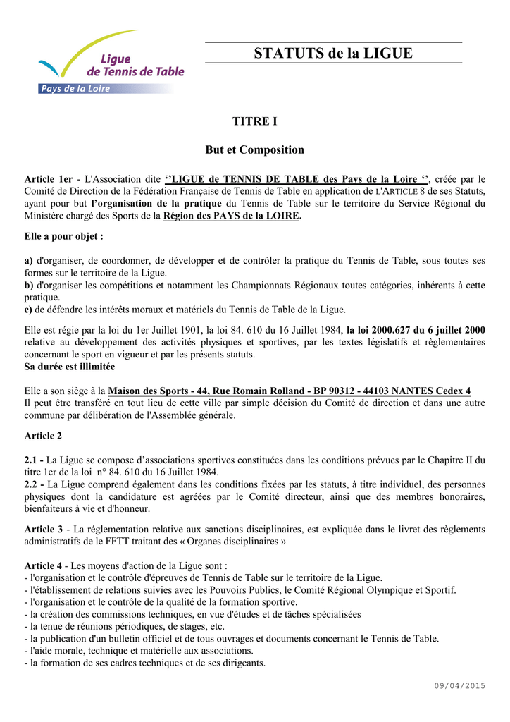STATUTS DE LA LIGUE - Tennis de Table | Ligue des Pays de la Loire